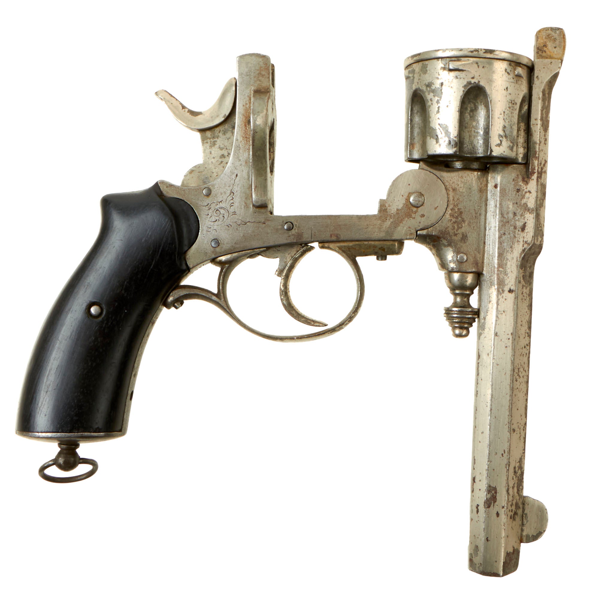 Original Item: Only One Available. This is a most interesting EARLY 6 shot .44 Caliber revolver probably made circa 1870, very much in the Pryse / Webley-Pryse style. There are no maker or retailer markings at all, and while it is nickel plated, this looks to have been a refinish, which has made the original engravings and markings faint. There are some numbers on the back of the cylinder ejector, and the style is typical for manufacture in Liège, Belgium.