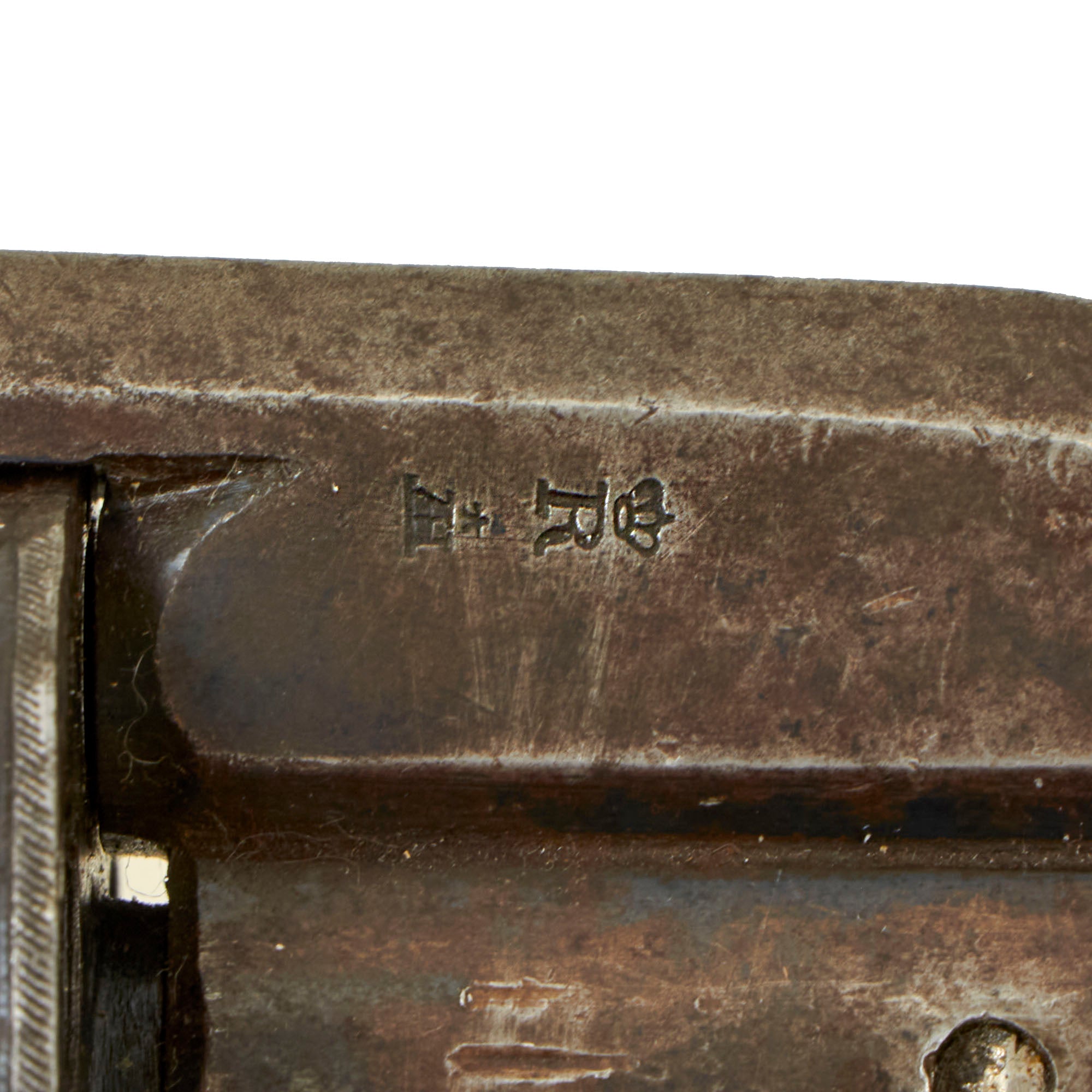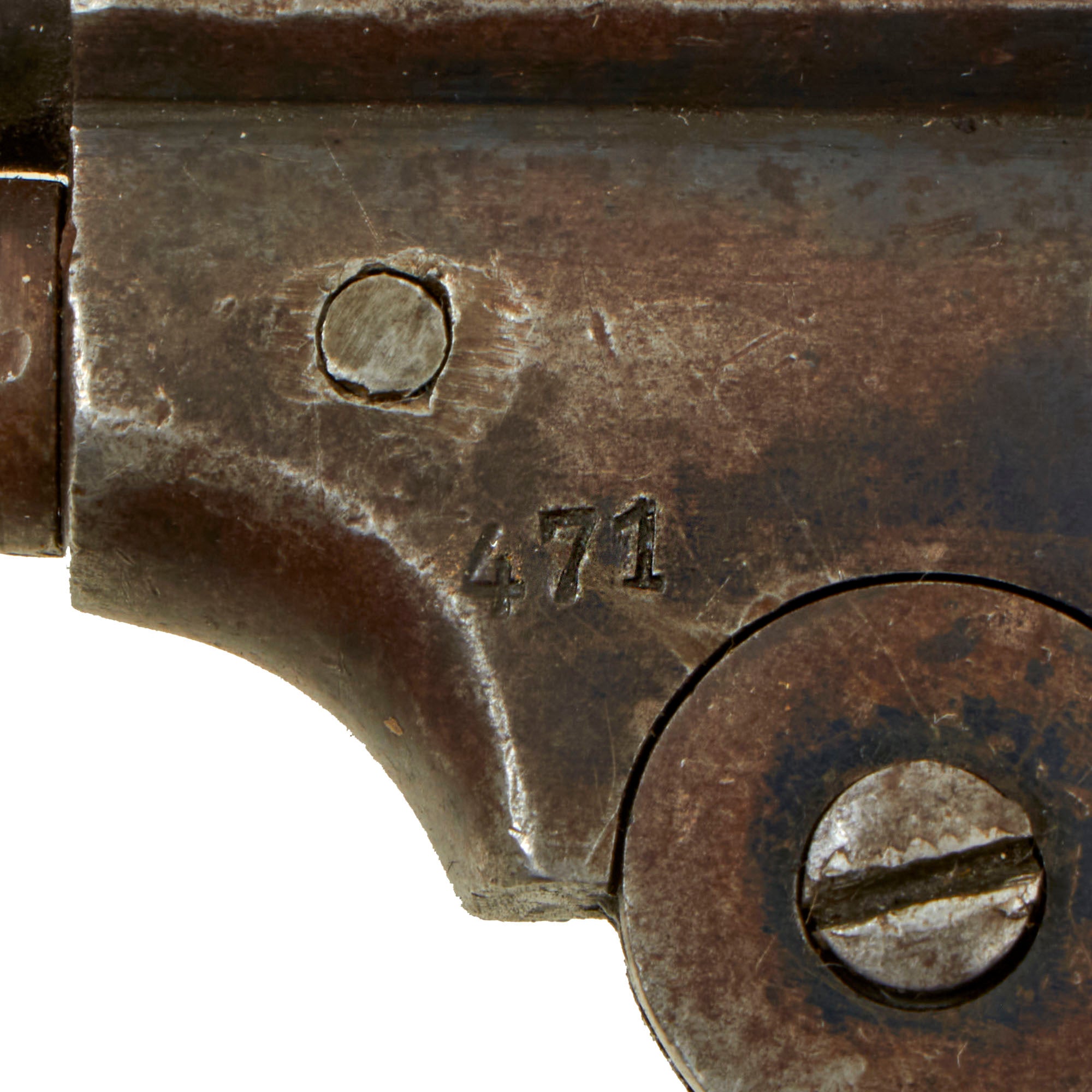 The left side of the frame is marked with 471, which could be a serial number, and there are ★ / AH proofs on the right side of the frame and barrel, which are typical inspection proofs from Liège, Belgium. The right side of the frame also bears a CROWN / R proof over the inspection proof. The rear of the barrel has another ★ / AH proof, along with CROWN / L and E / L G / * in a "Crowned" oval, indicating manufacture and inspection in Liège, Belgium after 1891. This proof had been introduced for exported arms to comply with new proof laws in Germany.