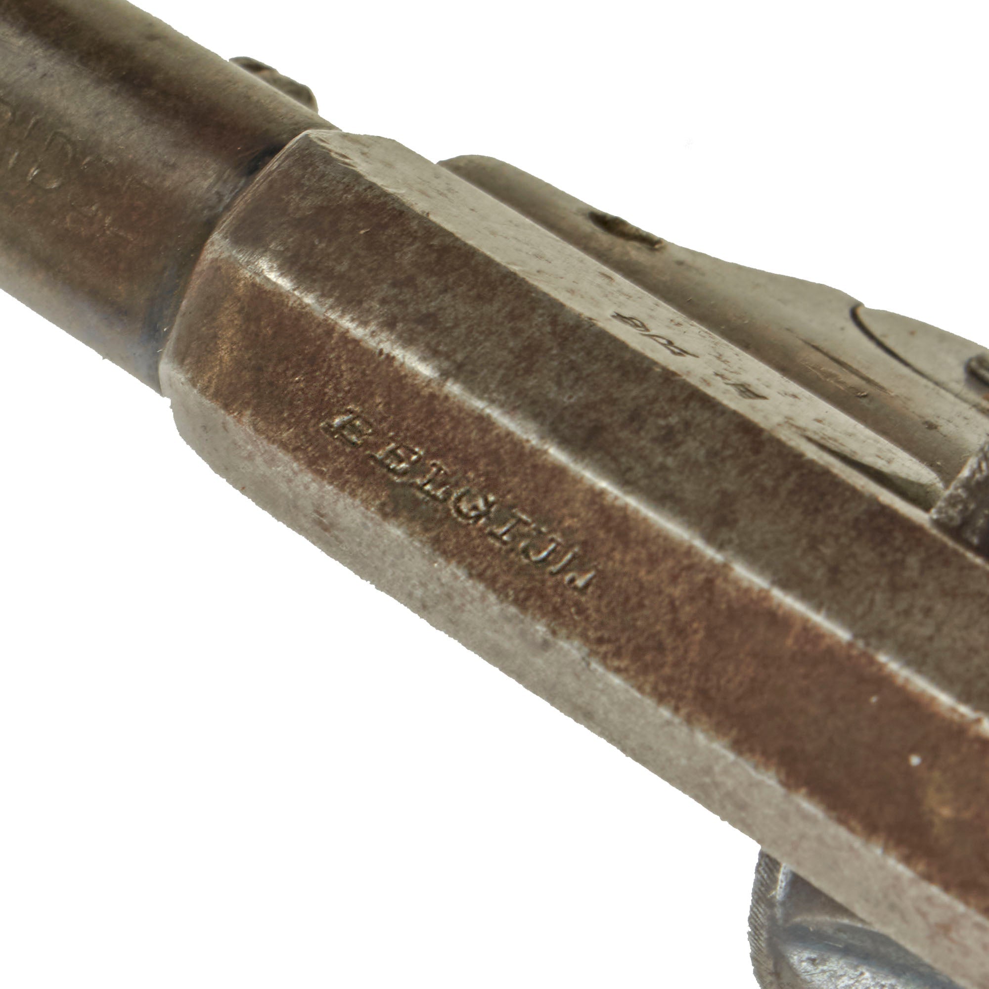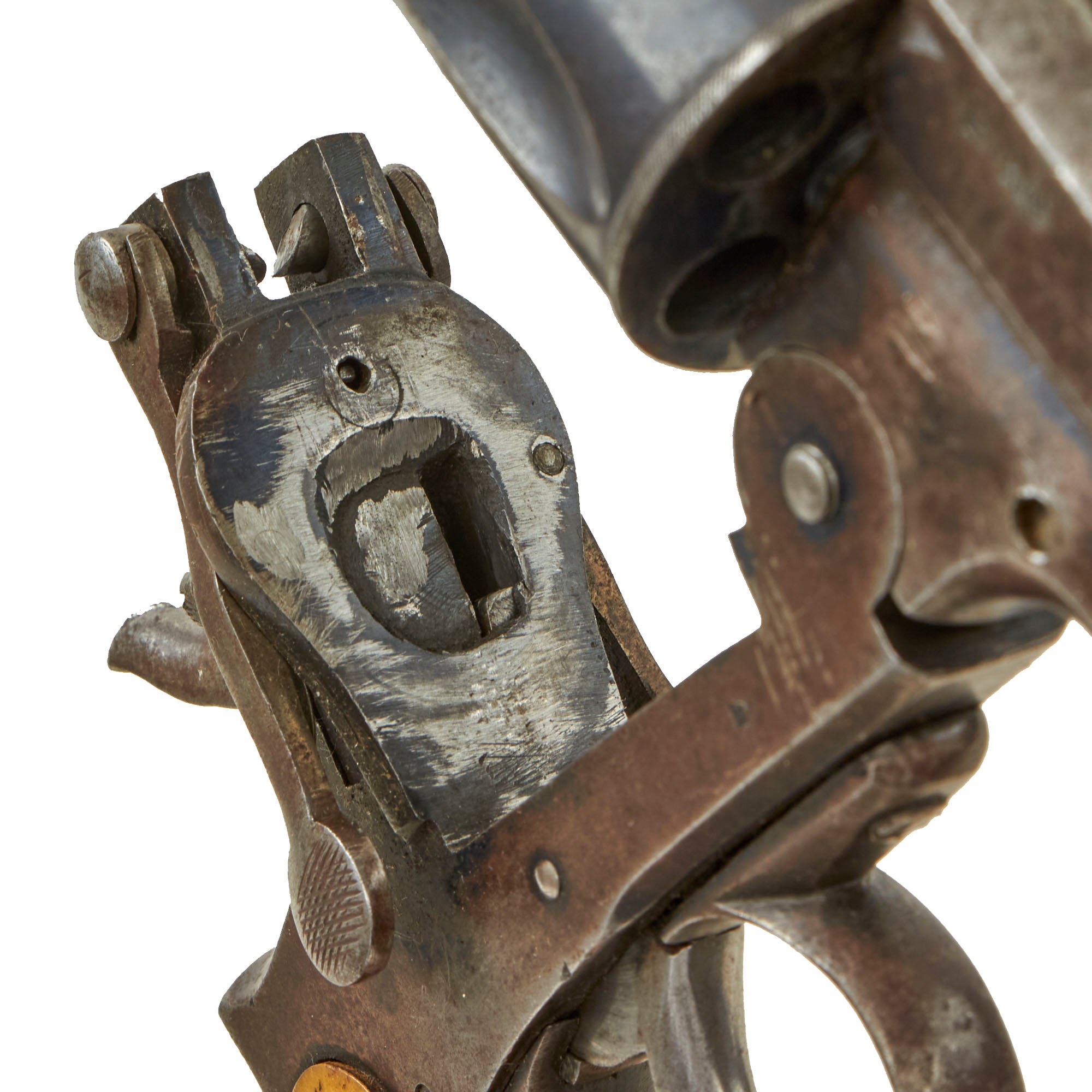 The revolver cycles well in both single and double action, with no major issues to note. There is a just bit of slop in the mechanics, but nothing out of line with a revolver of this age. The frame breaks open correctly, with the ejector properly presenting, though it does not snap back down. We do not know if this is just how it was designed, or whether that function is not currently working. The bore is in very good condition, showing strong lands and grooves with a partly bright finish. There is a bit of oxidation and fouling in areas, but no major wear. Definitely in very good shape for a black powder era revolver.