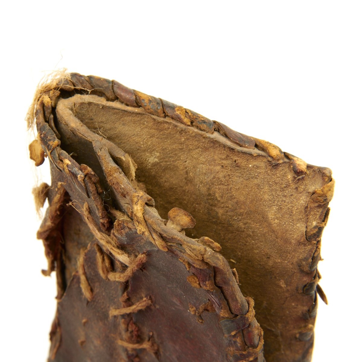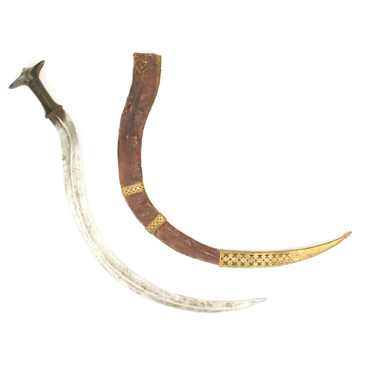 This unique styled Sword comes only from Abyssinia, and they were designed to reach behind an opponent's shield with the greatly curved double sided blade. Usually very crude in form it is really remarkable to find this example coming complete with its original brass mounted leather very curved scabbard. Plainly this was a War Trophy taken home by a British Soldier. This example measures about 30 inches long, not taking the curve into account. Measured along the outside edge, the blade itself is 32 inches long.