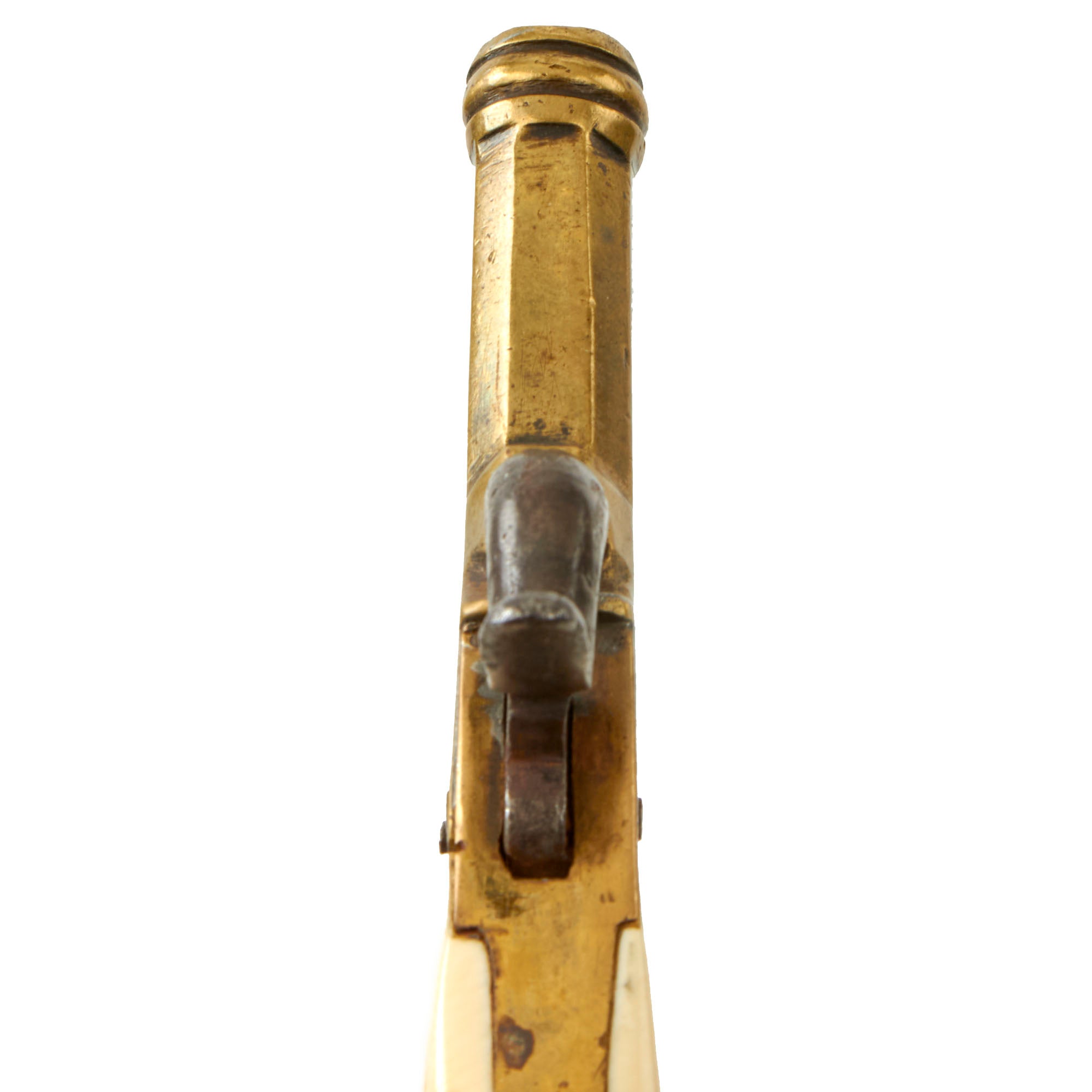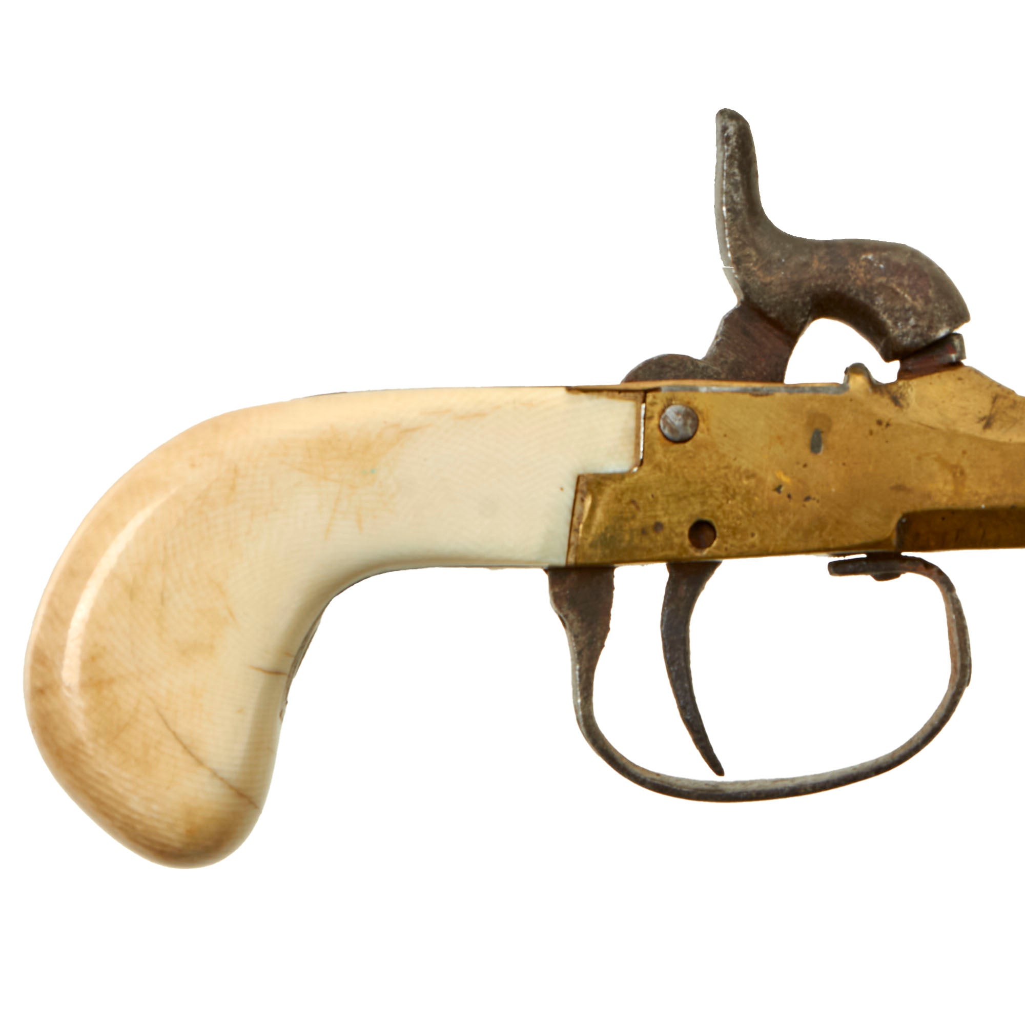 Original Item: Only One Available. This lovely pocket percussion pistol was made in Liège, Belgium, most likely for the large European and American export markets. These were quite popular for self-protection, and the small size meant they could fit in small pockets or other places where they would be well concealed. Pistols like this were equally at home on dark Streets of New York or of London in Victorian England. It features an all brass frame and barrel with iron internals, and a lovely ivory grip.