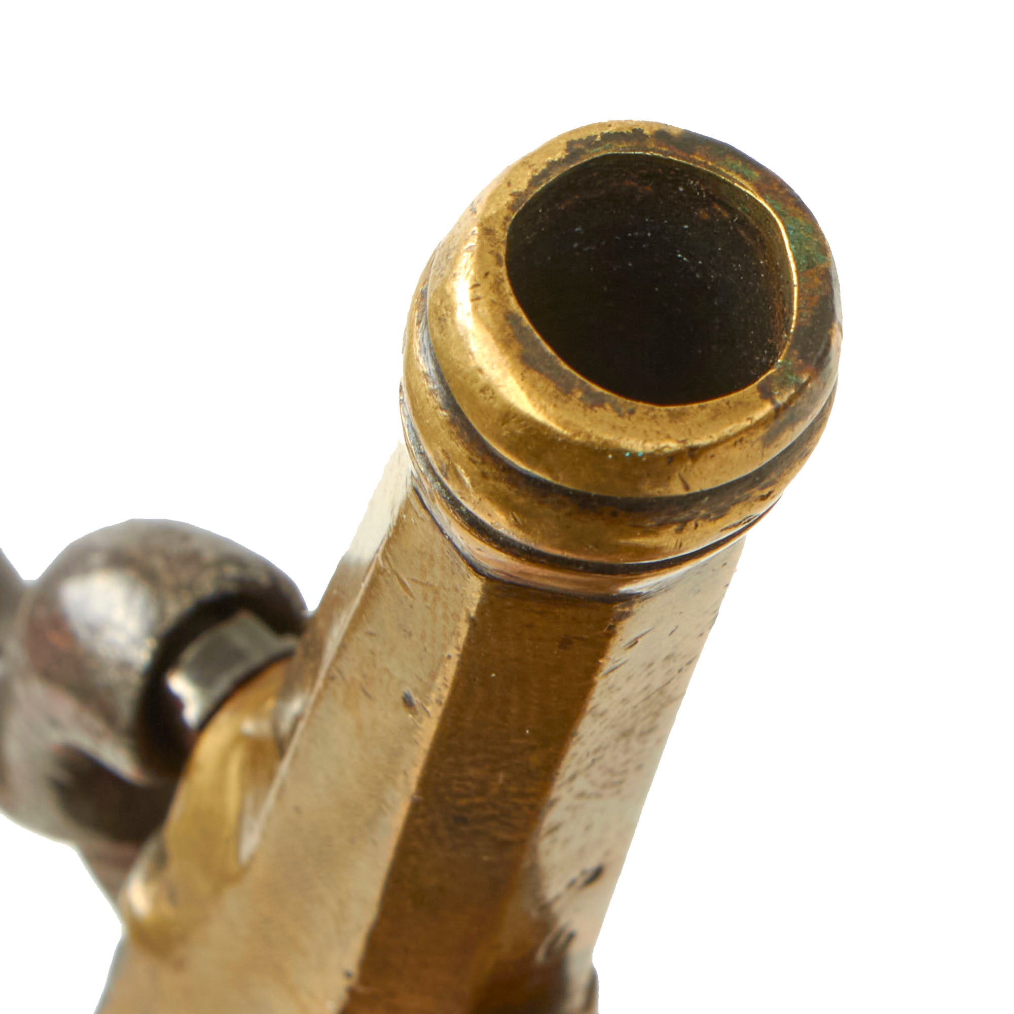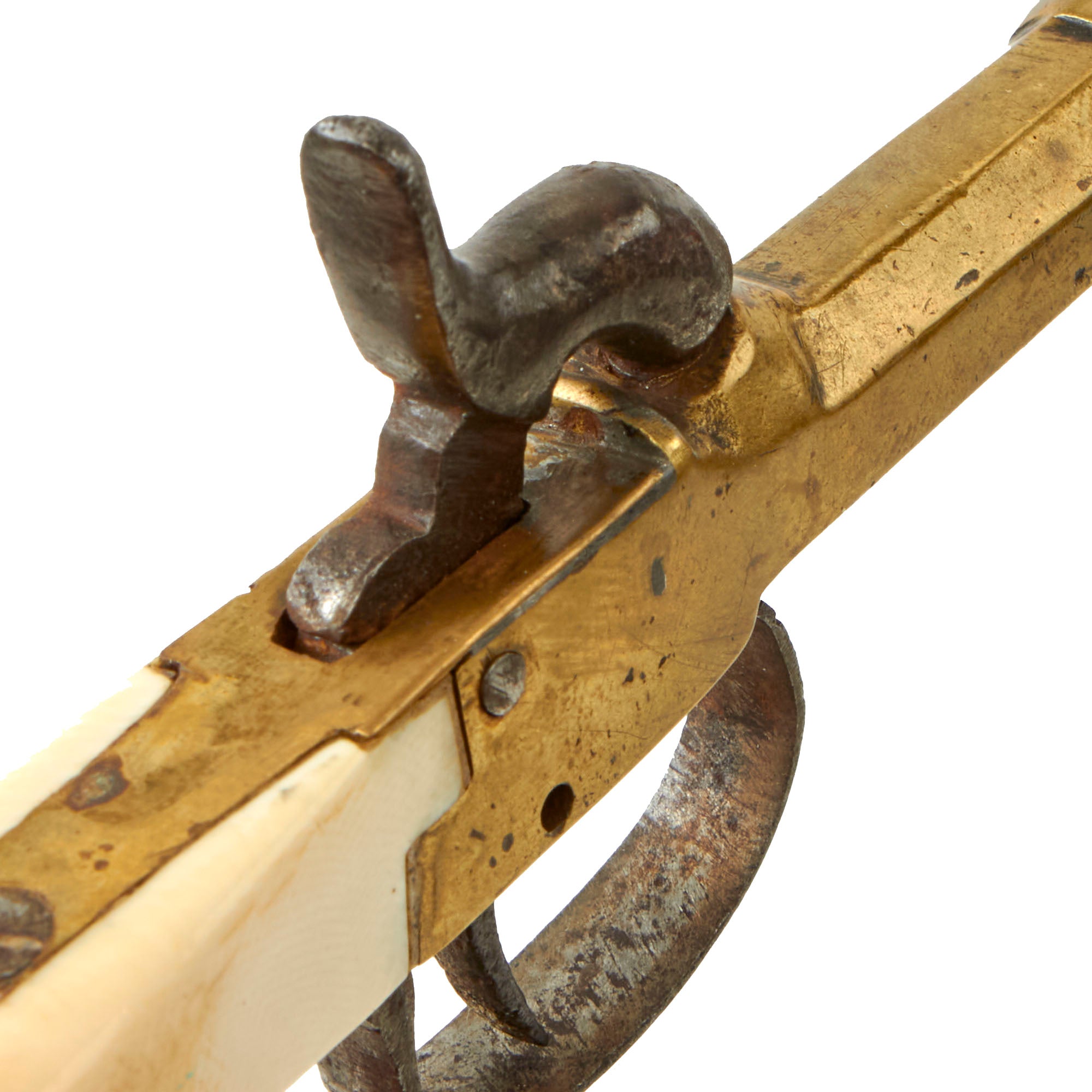 Condition of the pistol is very good, still showing lovely mustard patina on the brass, while there is some oxidation on the iron components of the pistol. The boxlock is functional, however it does not hold securely at half cock at all.