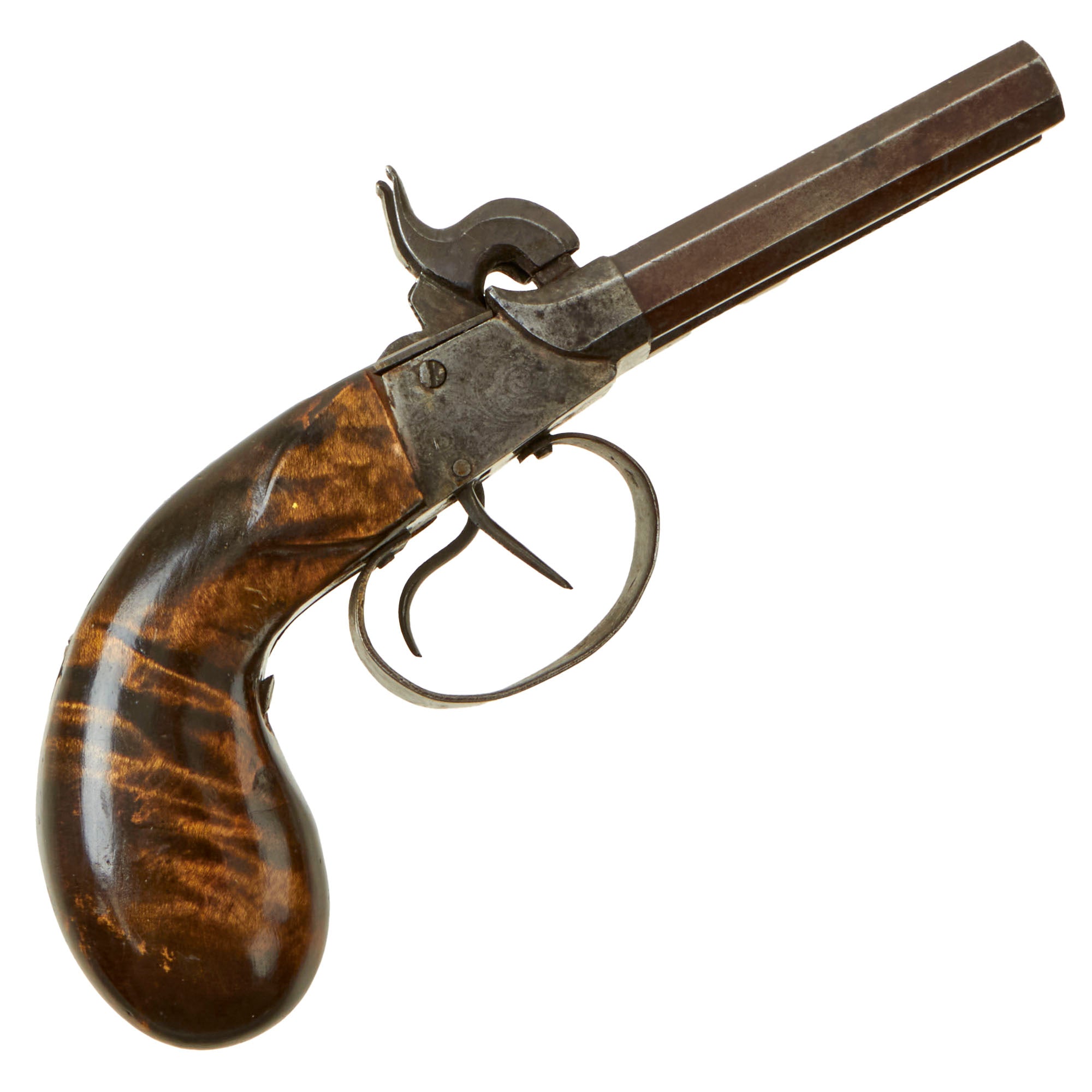 The smoothbore barrels measure 3" in length, and have grooves on the muzzle so they can be unscrewed, however they are currently frozen. Both are marked 9 on the bottom, and there are no other markings on the pistol that we can see. The pistol measures just over 8" overall, and features a very nice wooden "bag" style grip, which is very comfortable to hold. It looks to be made of lovely "burl" wood, and has been stained to give it a lovely "tiger eye" look.