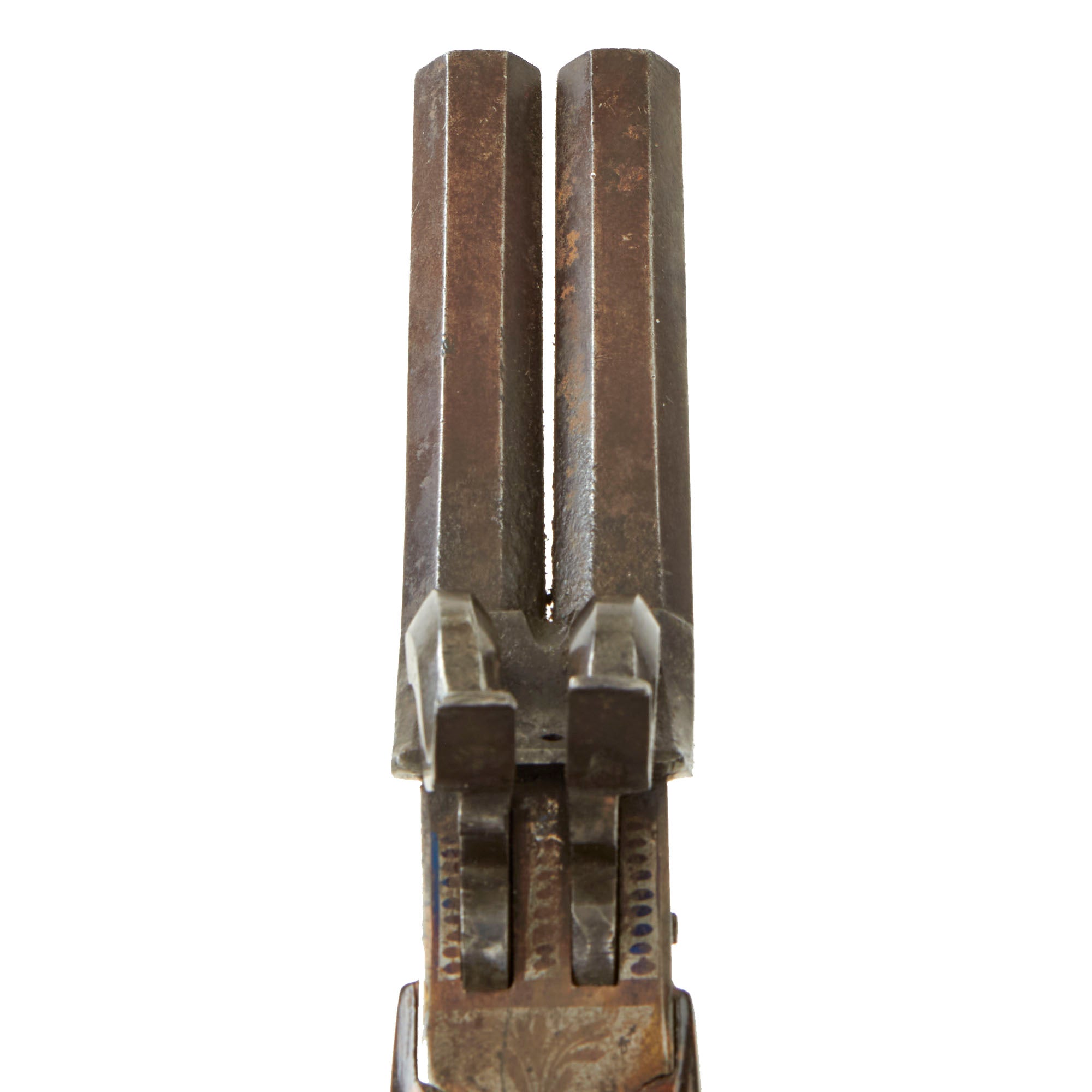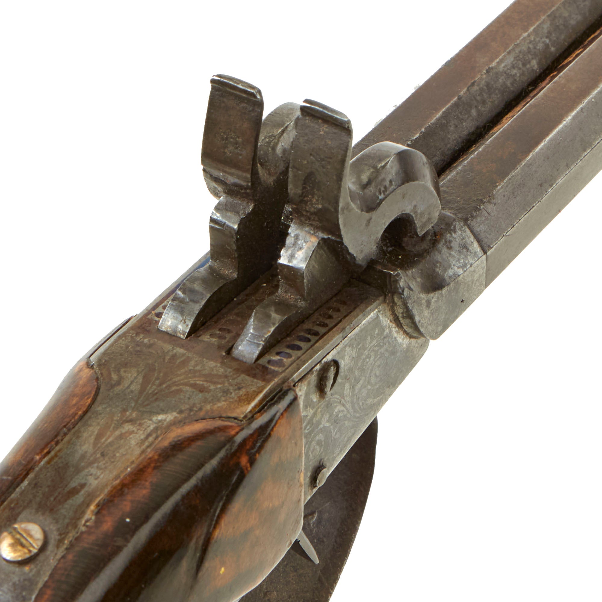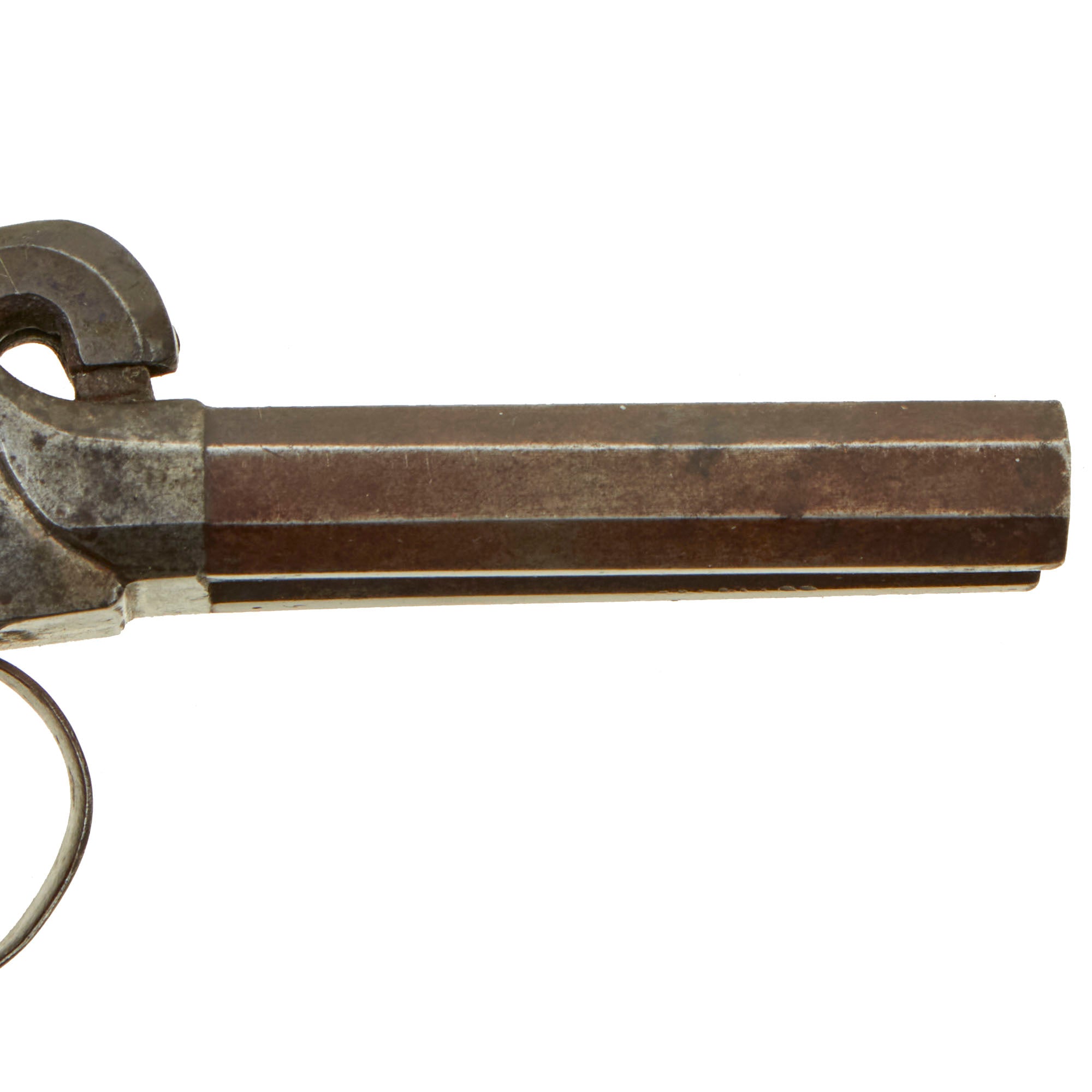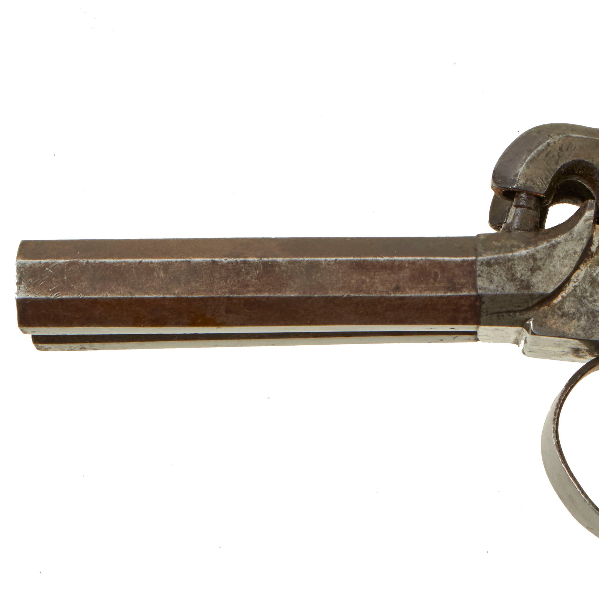 Original Item: Only One Available. This lovely double barreled pocket percussion pistol was most likely made in Liège, Belgium for the large European and American export markets. These were quite popular for self-protection, and having two barrels definitely would give the owner increased protection. Pistols like this were equally at home on dark Streets of New York or of London in Victorian England. It features some lovely floral designs blued or etched into the sides of the frame, as well as on the top and back strap. These are a bit hard to photograph, but are easily visible in the light.