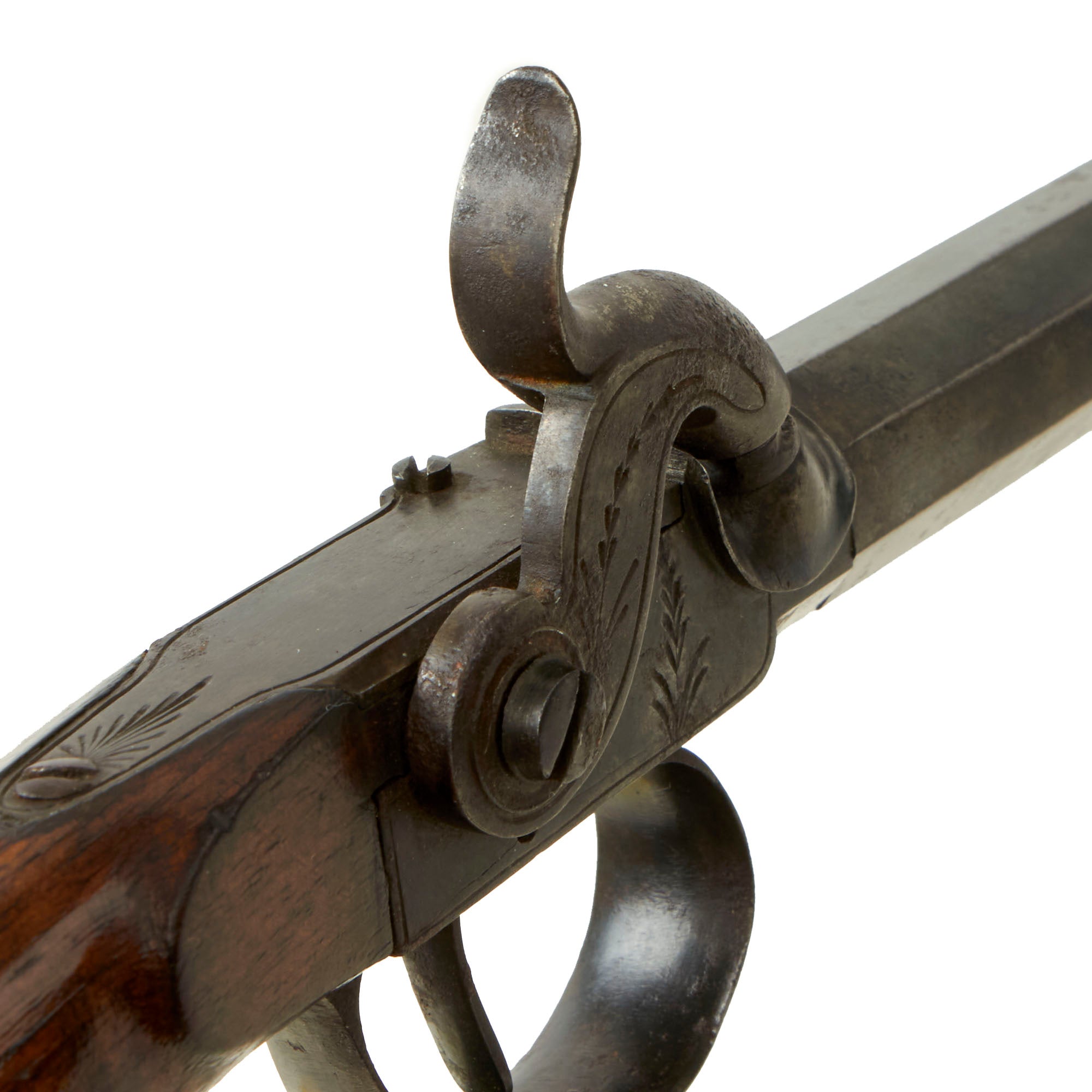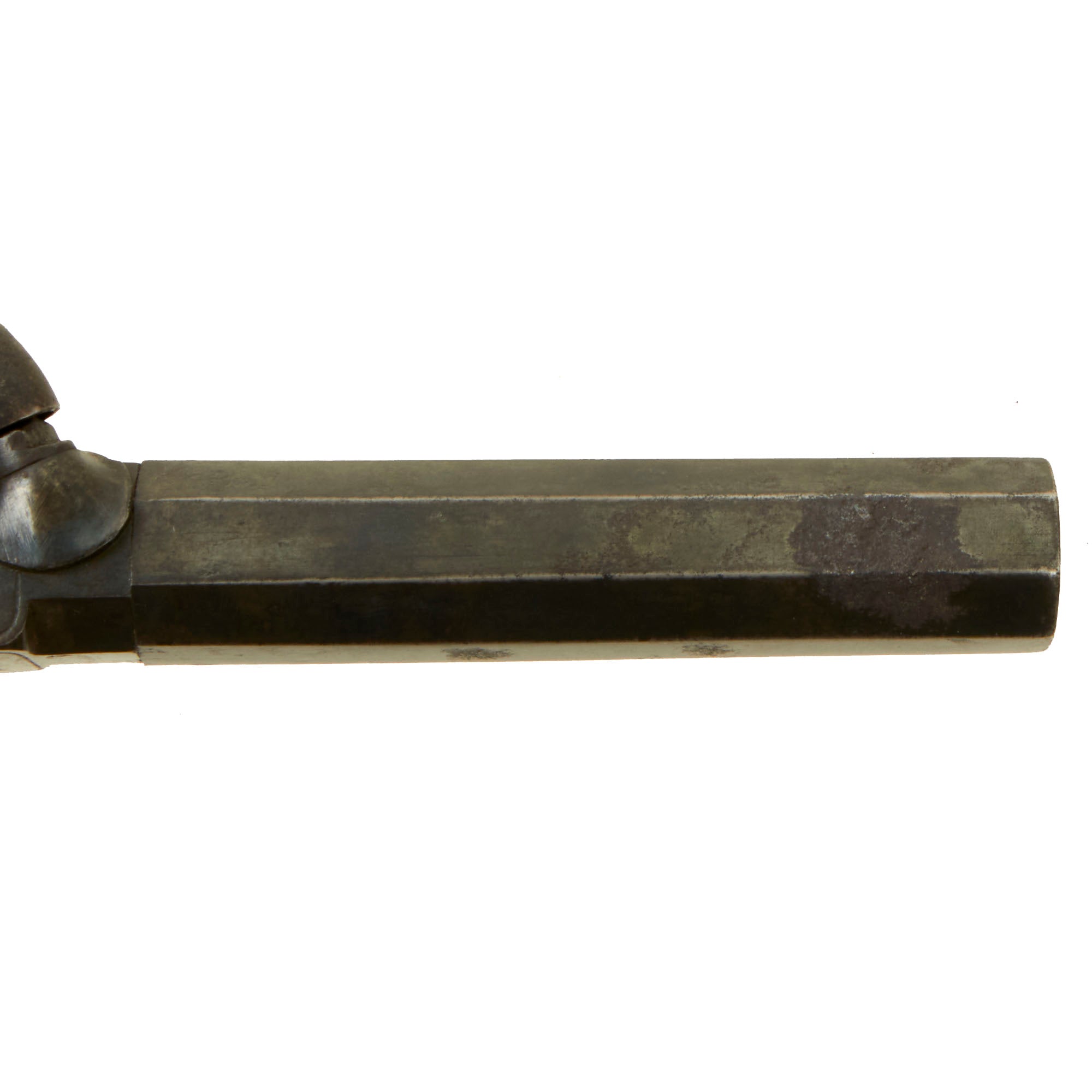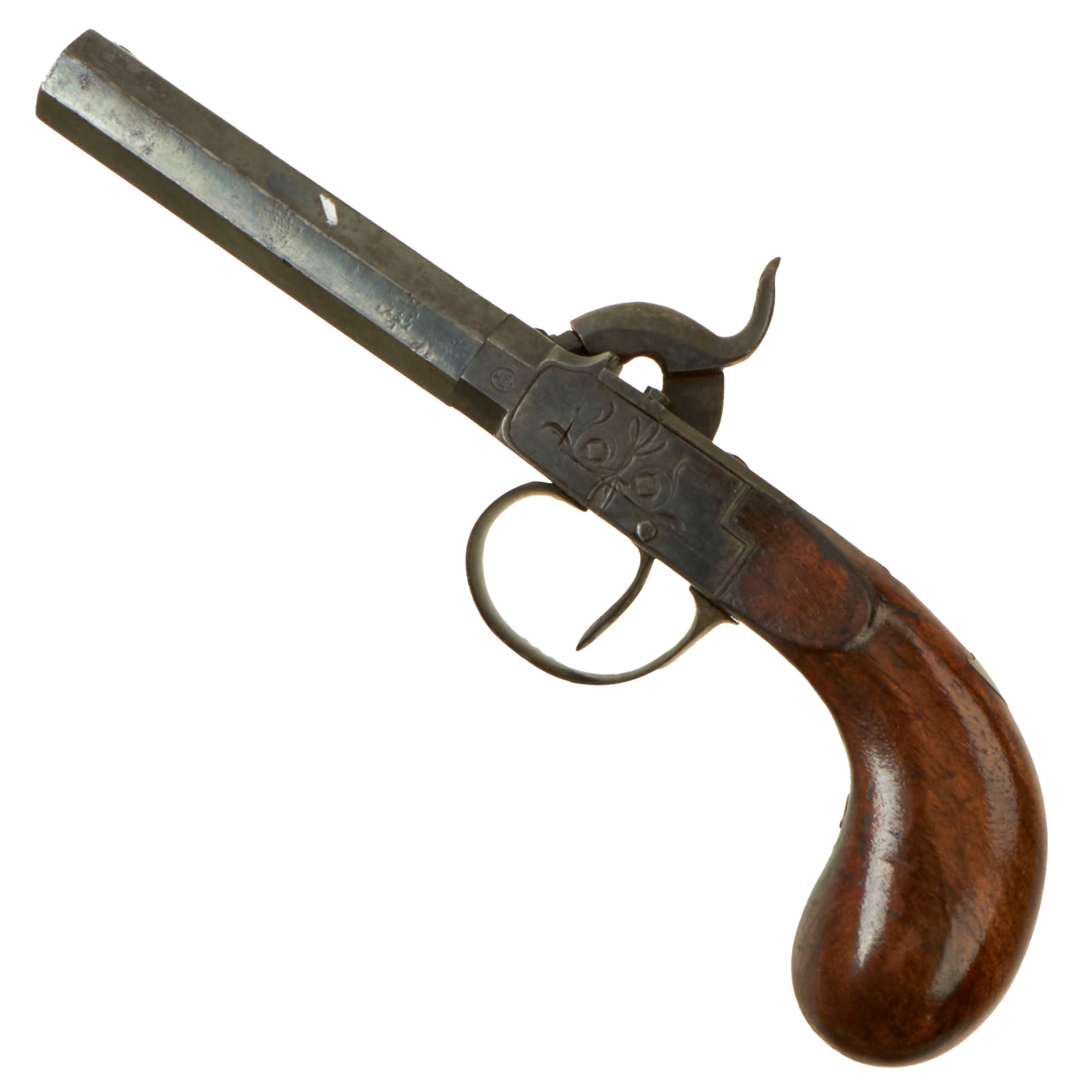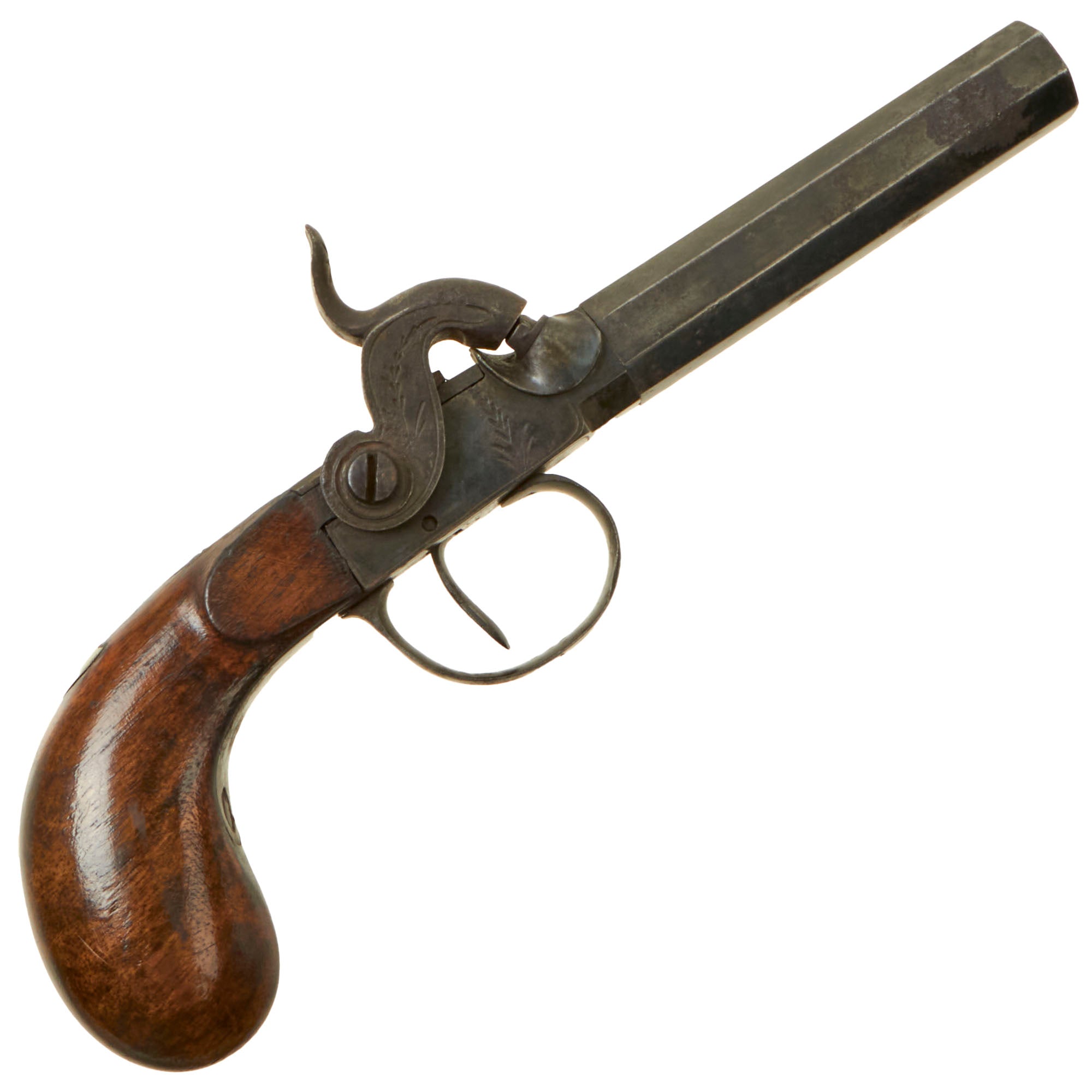 Original Item: Only One Available. This is a lovely percussion vest pistol, featuring an octagonal rifled "turn off" barrel and a lovely "bag" shaped wooden grip. The pistol was made in Liège, Belgium, almost certainly for the European and American export markets. These were quite popular for self-protection, and the small size made them easily concealable in a vest pocket. Pistols like this were equally at home on dark Streets of New York or of London in Victorian England.