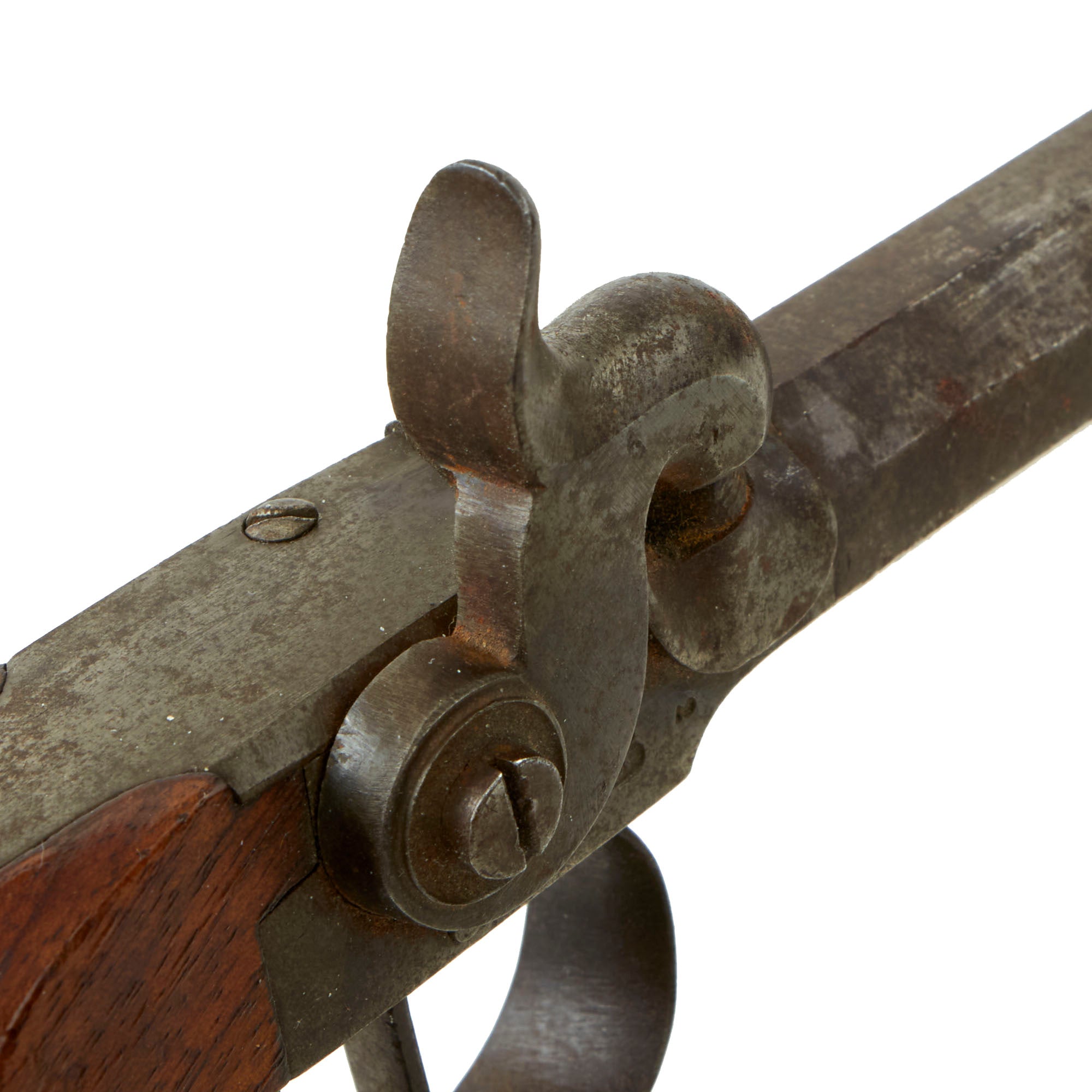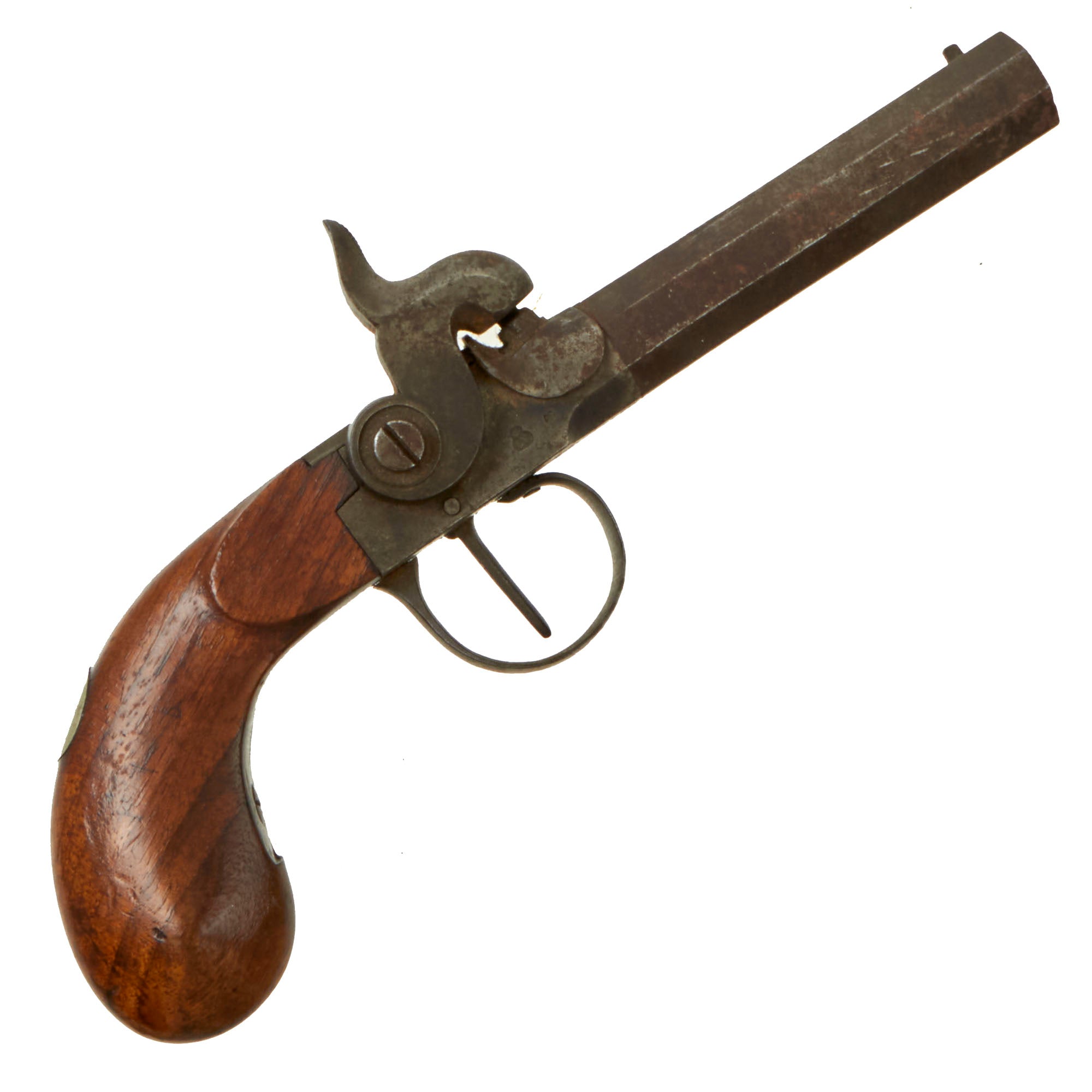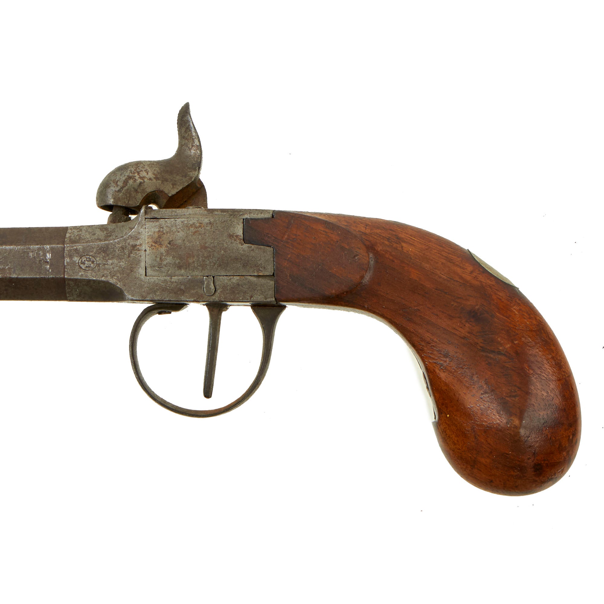 Original Item: Only One Available. This is a lovely percussion vest pistol, featuring an octagonal rifled "turn off" barrel and a lovely "bag" shaped wooden grip. The pistol was made in Liège, Belgium, almost certainly for the European and American export markets. These were quite popular for self-protection, and the small size made them easily concealable in a vest pocket. Pistols like this were equally at home on dark Streets of New York or of London in Victorian England.