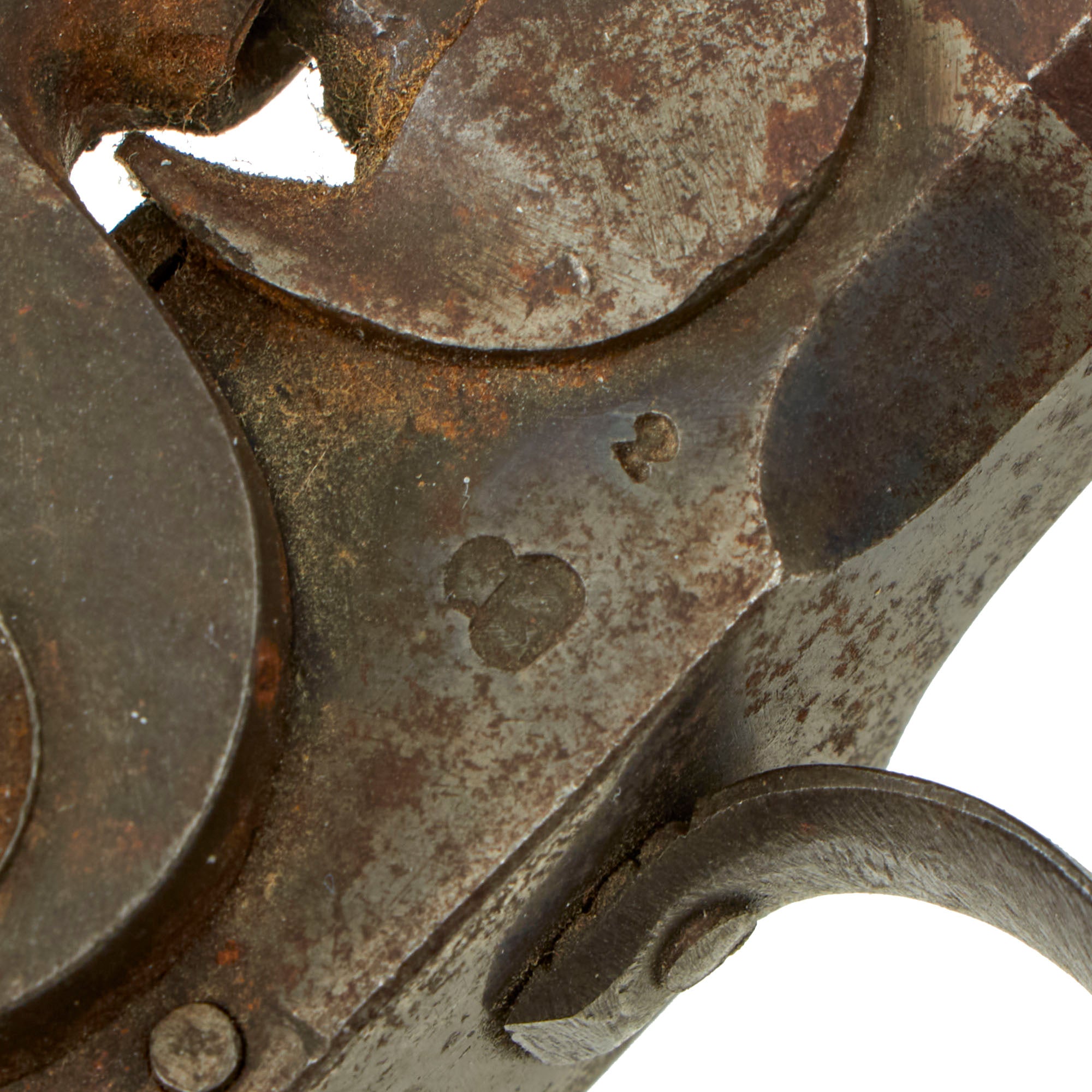 The pistol measures about 8 ¼" in overall length, with a 3 ¼ rifled barrel. There are cuts into the interior muzzle for removal of the turn-off barrel, however the barrel joint is unfortunately seized at present. It has the usual "box-lock" design, however unlike most we see, this has a hammer on the side of the action, and not on top. It is marked on the left side of the frame with an E / L G / * in an Oval proof, indicating manufacture in Liège, Belgium. The right side of the frame is marked with a CROWN / LH in an Oval, a Belgian "mark test of manufacture", which was seen on guns from various makers, including Emile et Léon Nagant. The left side of the barrel also looks to have a faded "Perron" Tower of Liège proof on it.
