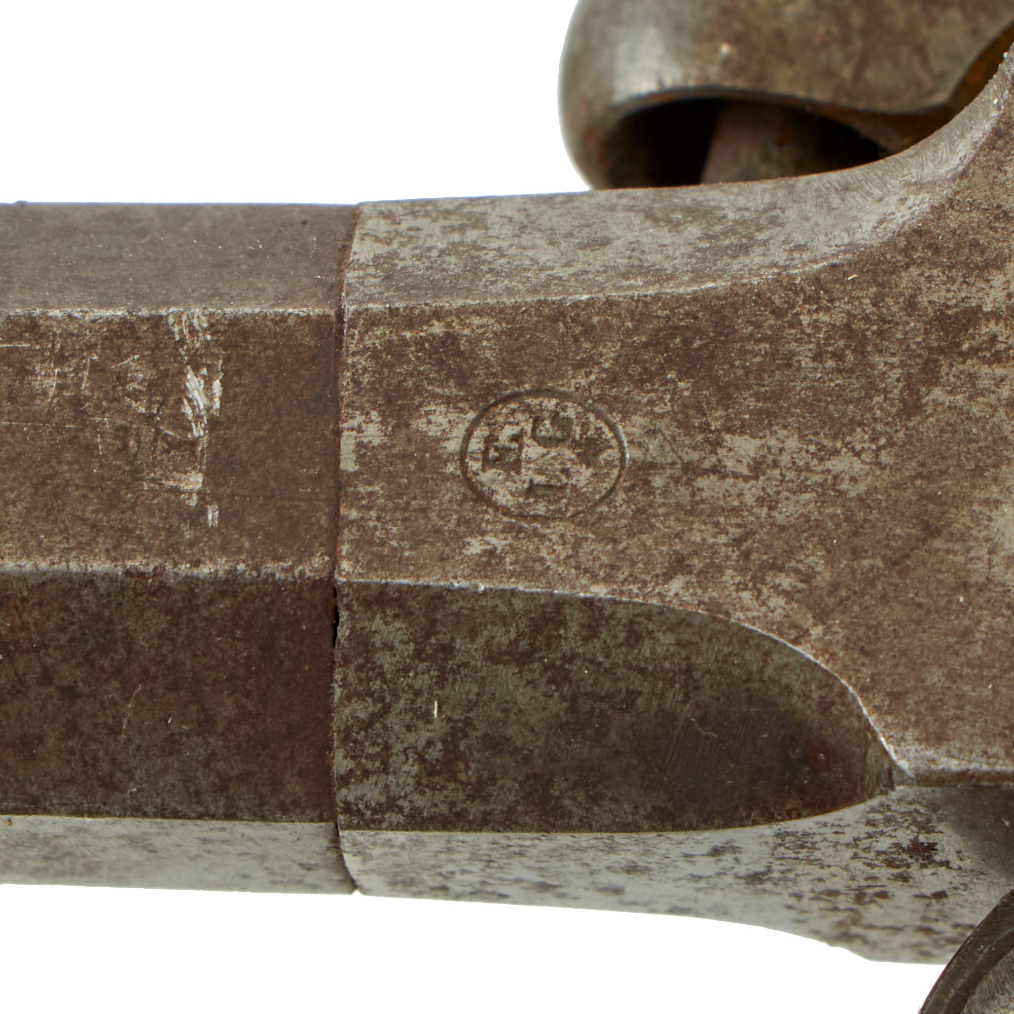 There are no other markings on the pistol that we can see, but this is not uncommon, as often these were sold to retailers, who would add their own markings and decorations if desired. The pistol features a very nice wooden "bag" style grip, which is very comfortable to hold and looks great. There is a small oval white metal escutcheon on the back of the grip where these were sometimes personalized, however this example is blank.