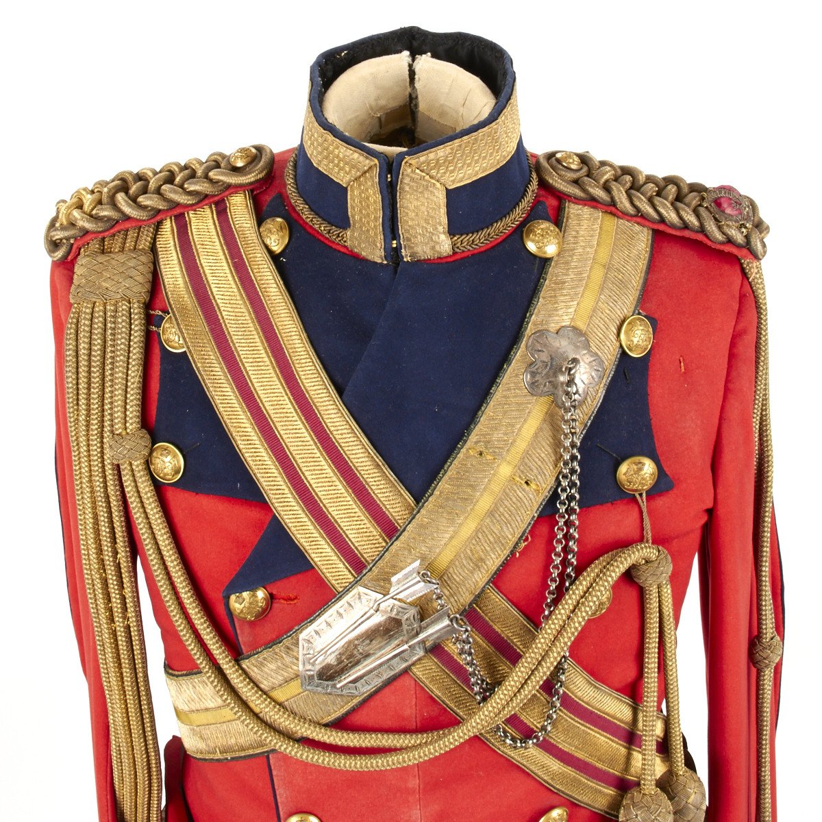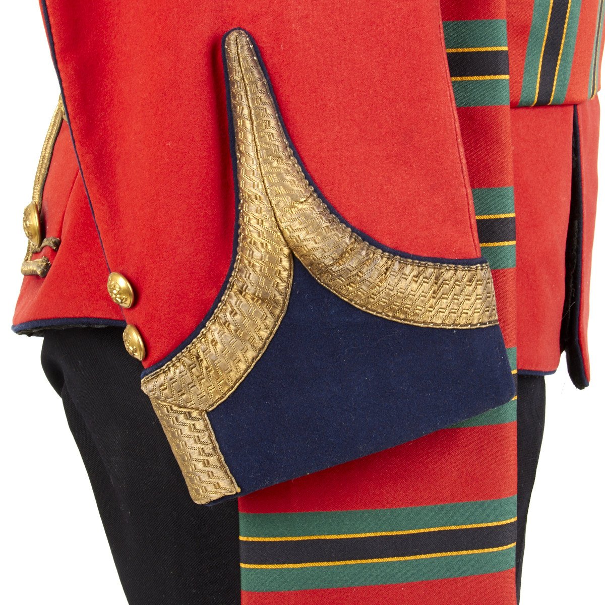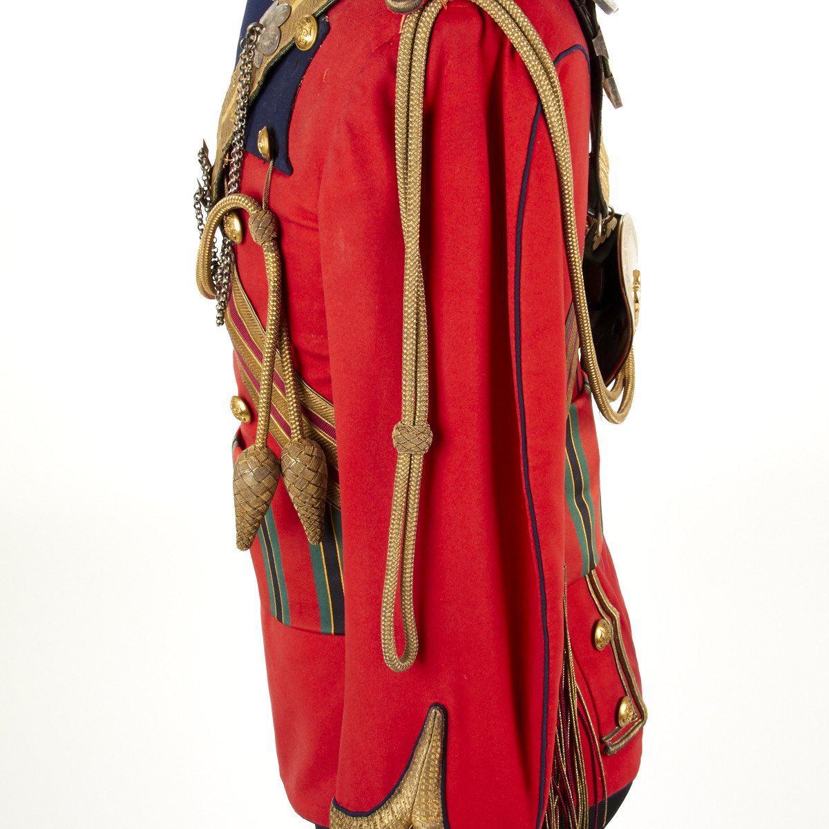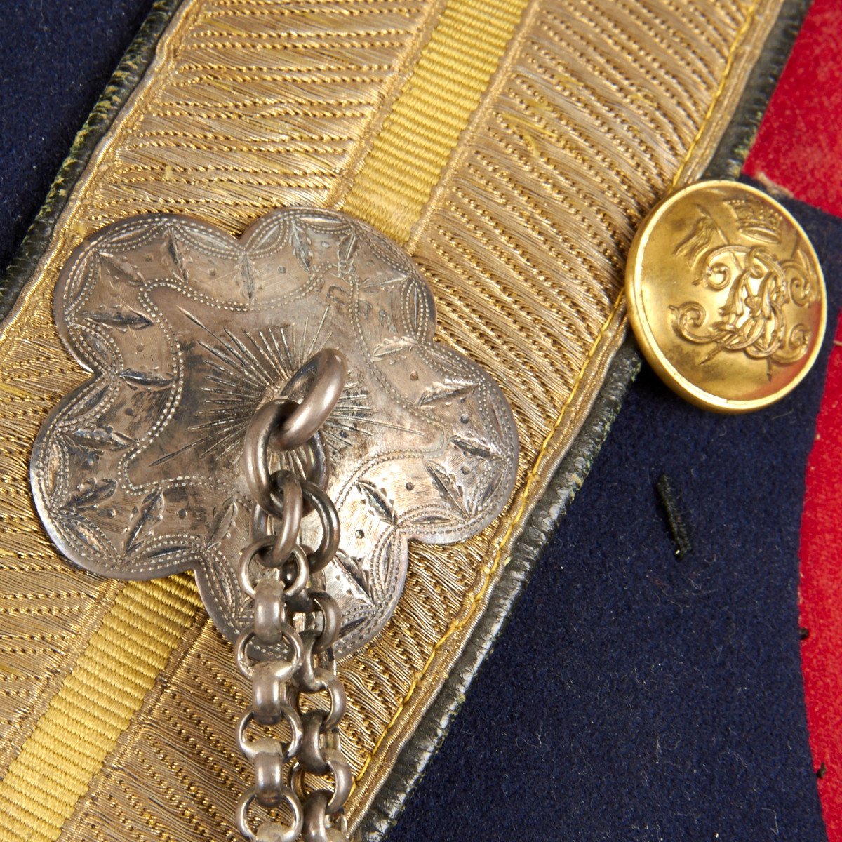 Red Melton cloth maternity style tunic with blue facings and cuffs heavily adorned with gilt braiding.