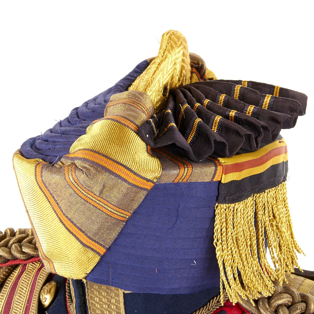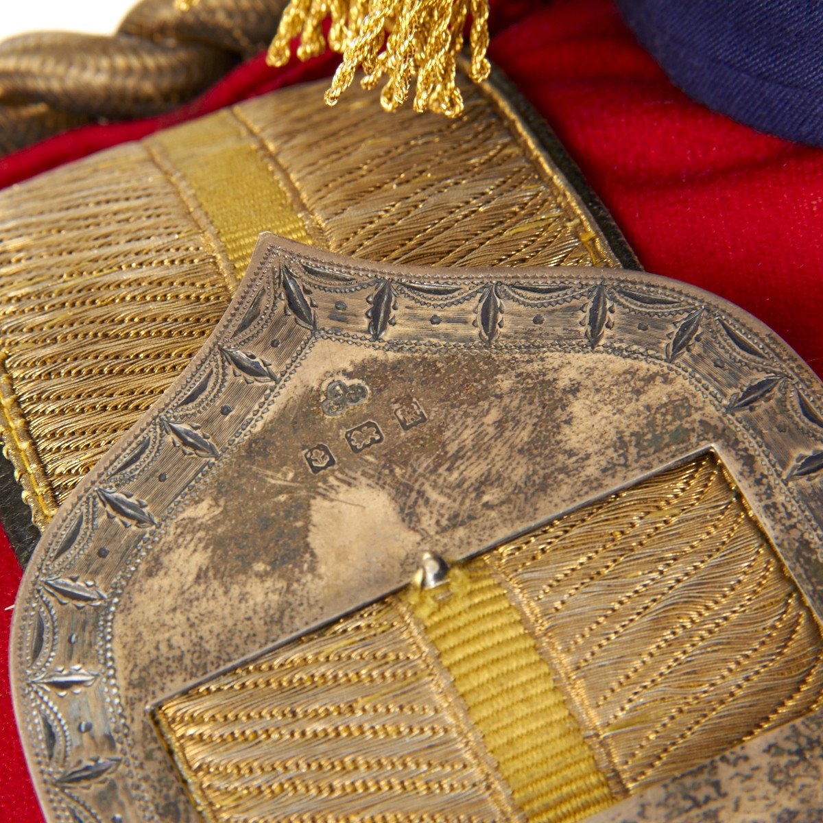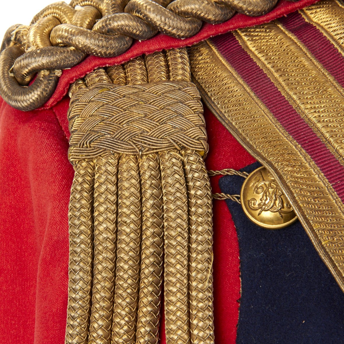 Epaulettes of gilt roping. One still retains the gilt and velvet rank insignia of Major.