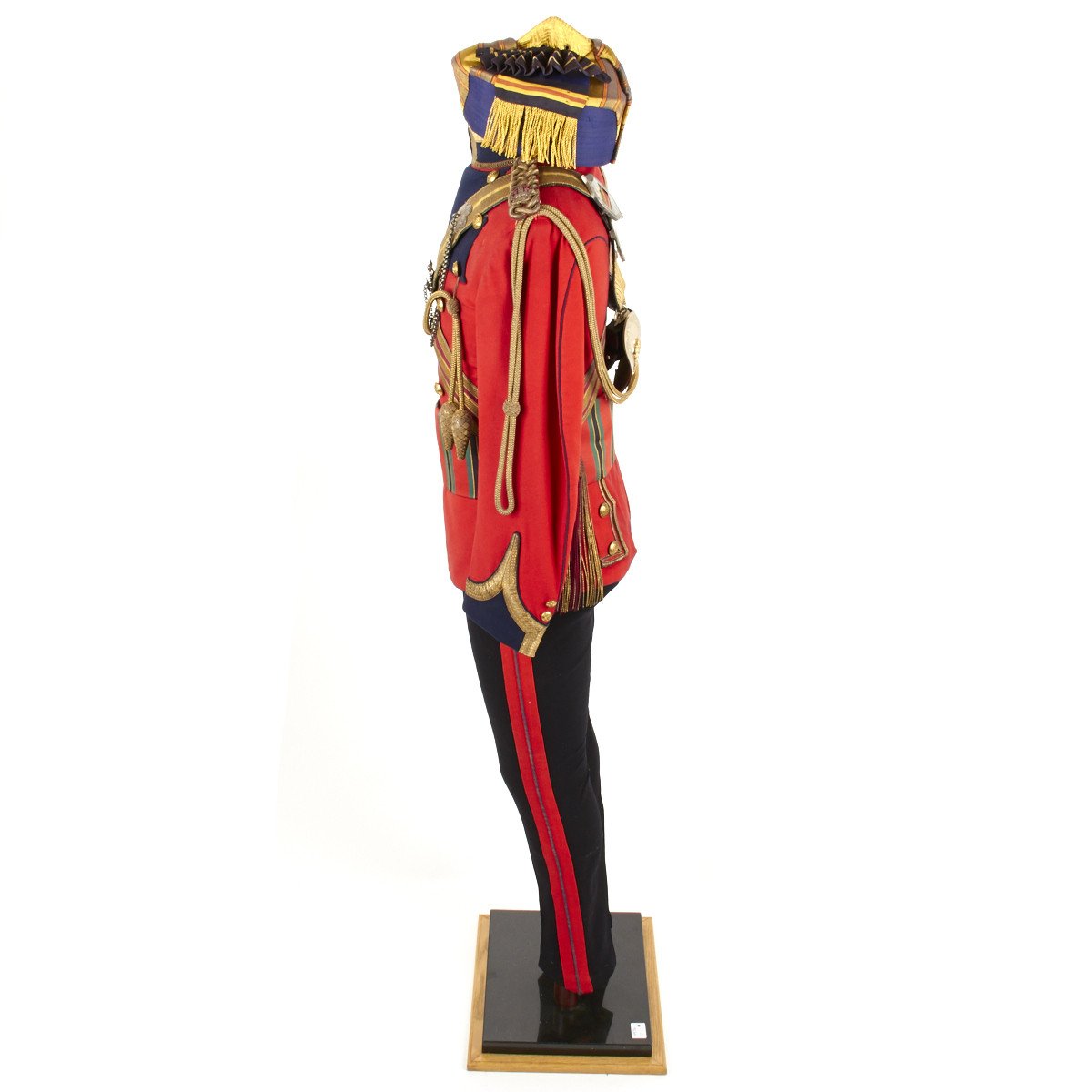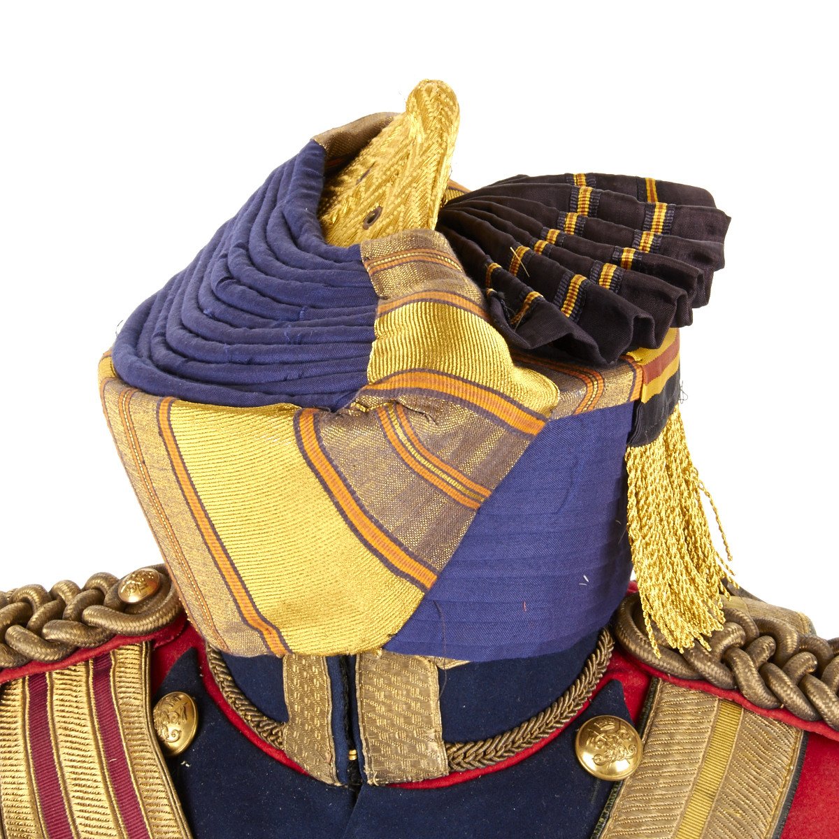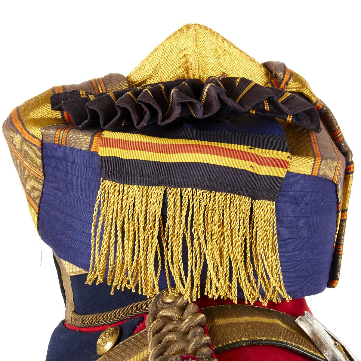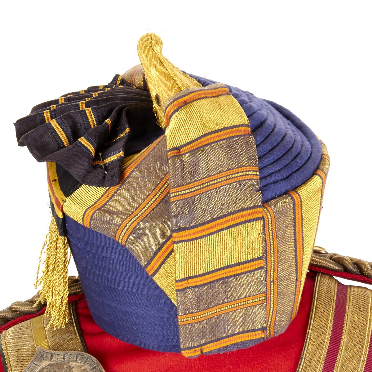 All this is set off with the officer's turban style helmet constructed of pleated gilt and orange lame fabric on a blue body.