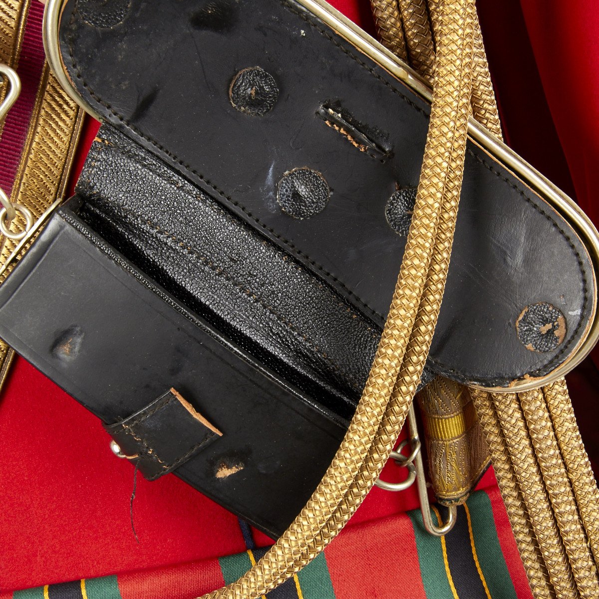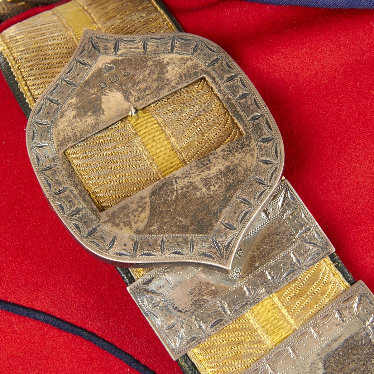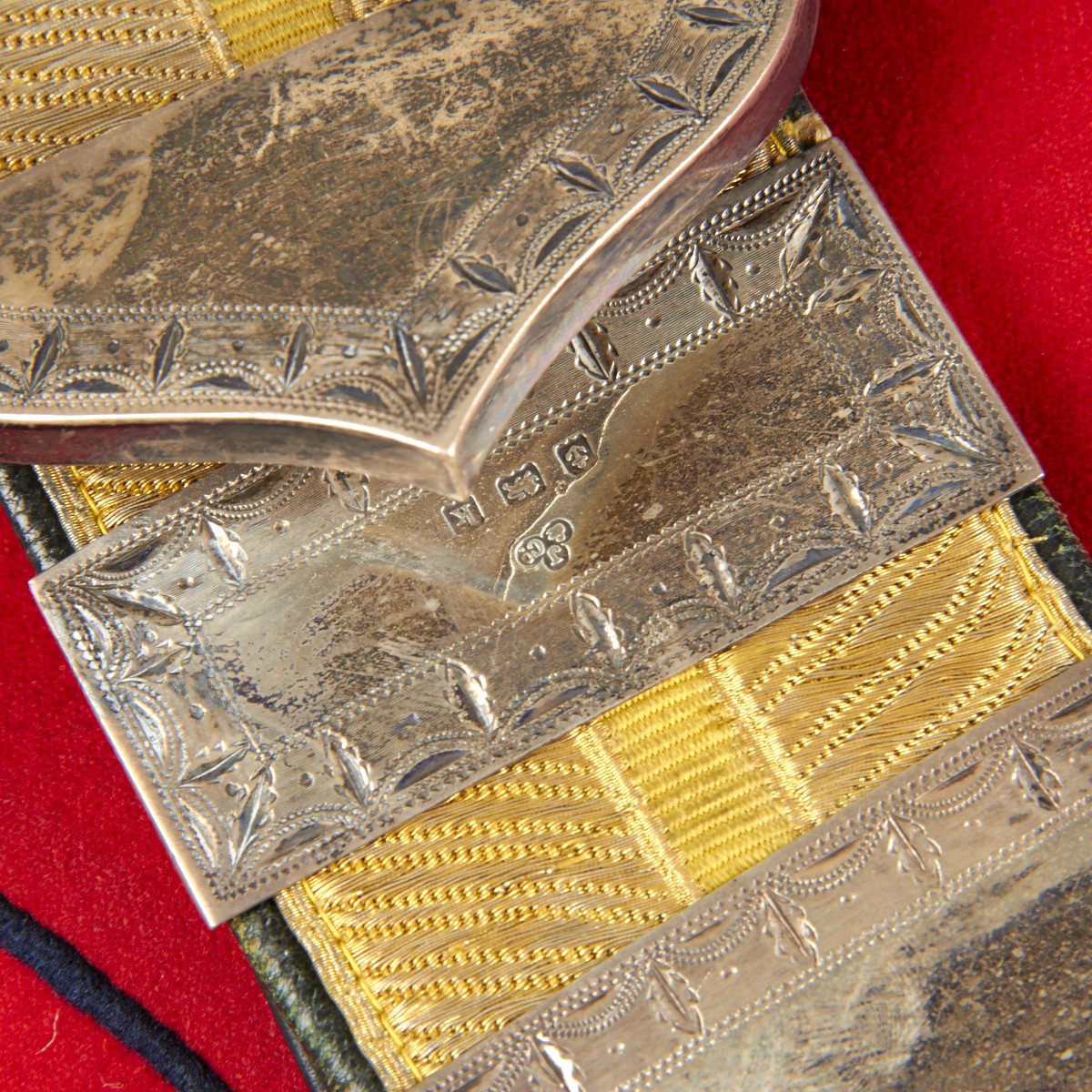 In the other direction, from the left shoulder to the right hip, is a magnificent similarly decorated cross belt that is secured by a sterling silver hallmarked buckle assembly and holds an unusually long sterling silver document box with regimental devise to central panel.
