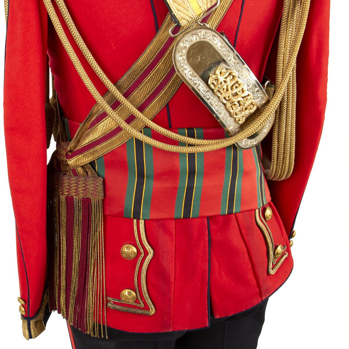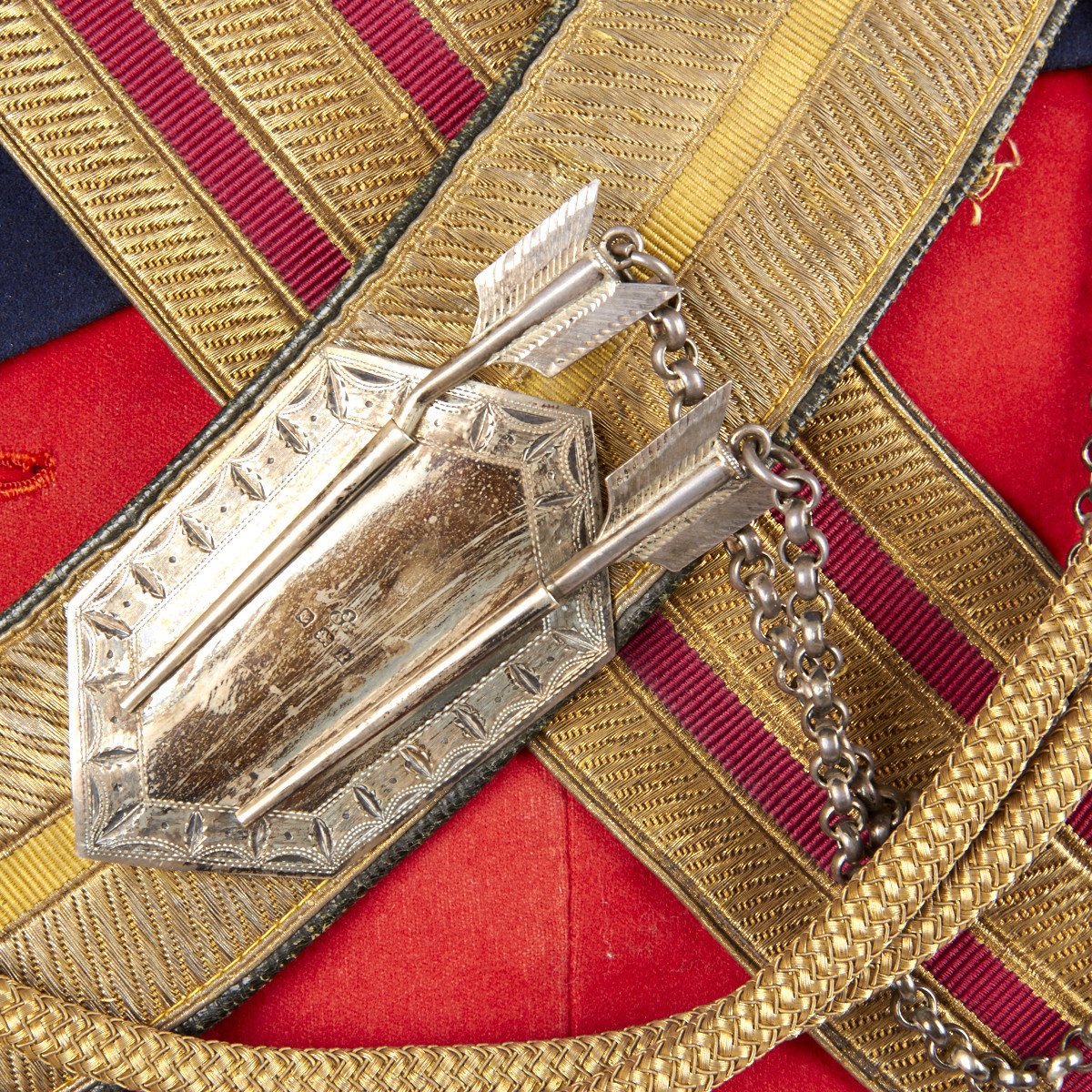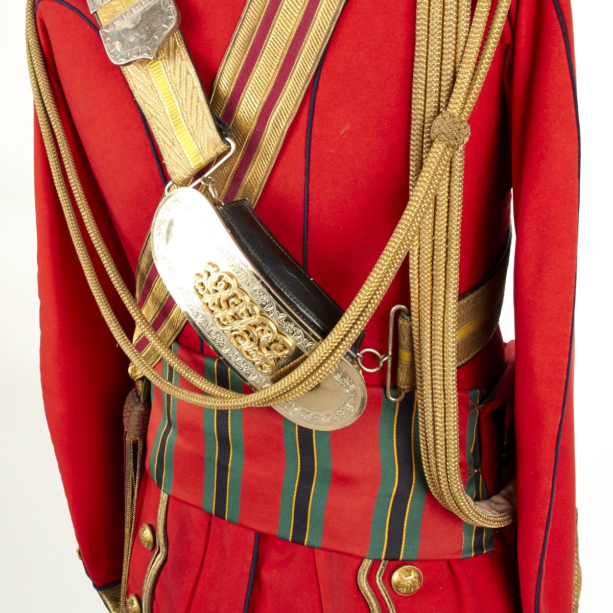 In the other direction, from the left shoulder to the right hip, is a magnificent similarly decorated cross belt that is secured by a sterling silver hallmarked buckle assembly and holds an unusually long sterling silver document box with regimental devise to central panel.