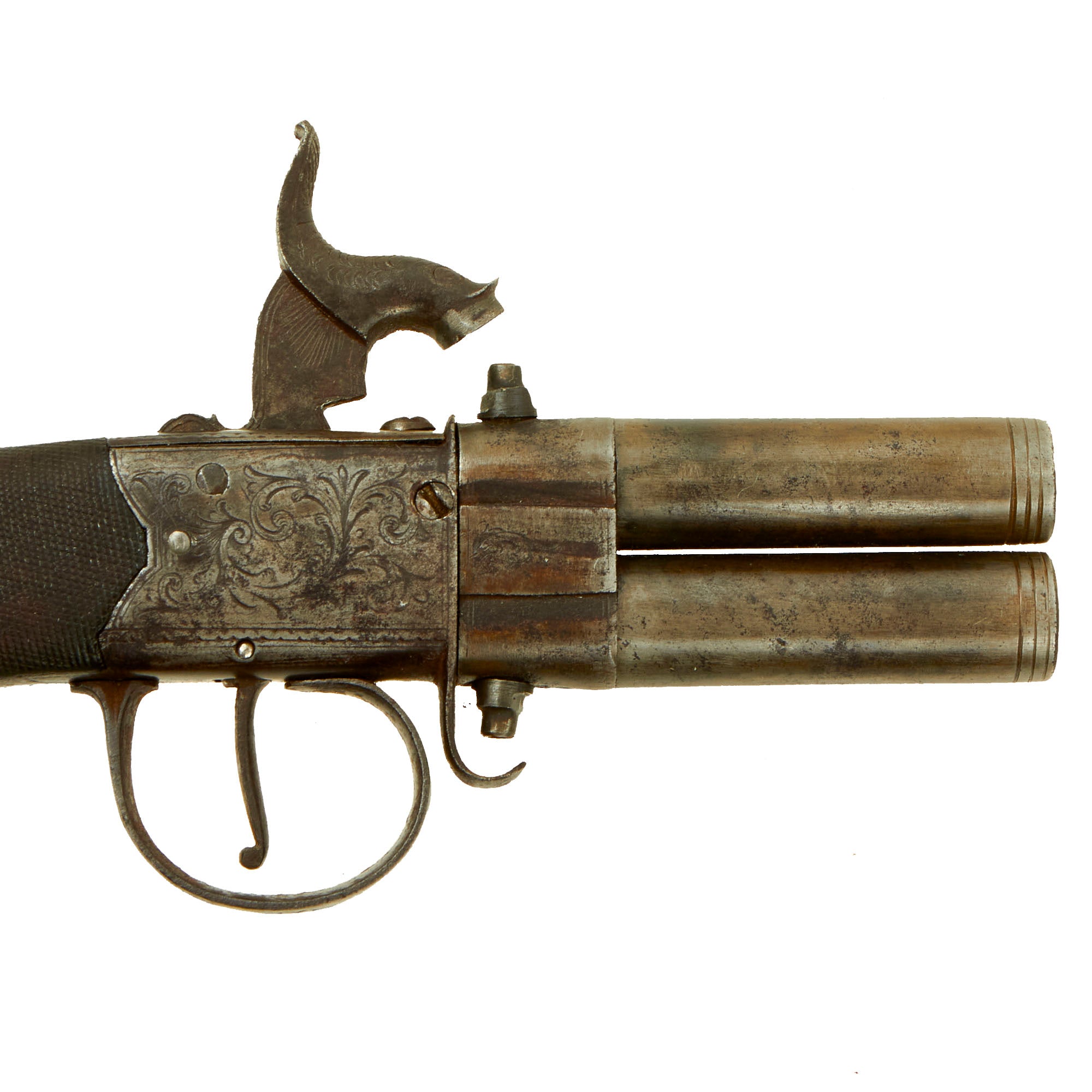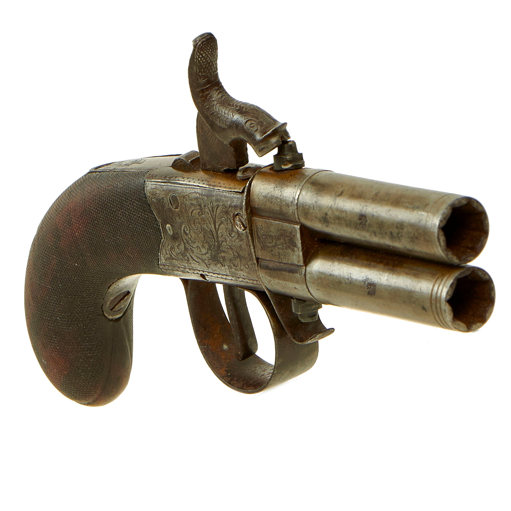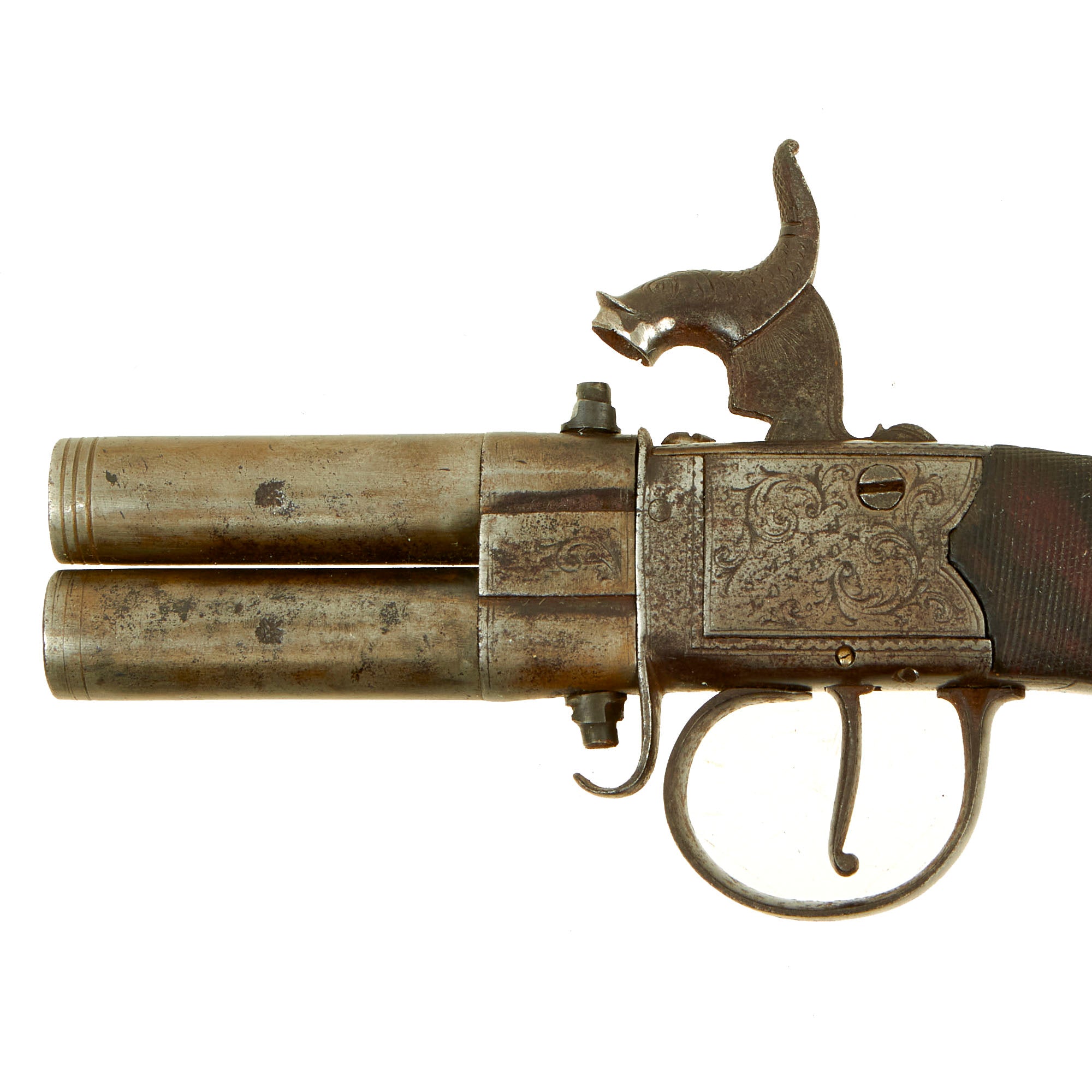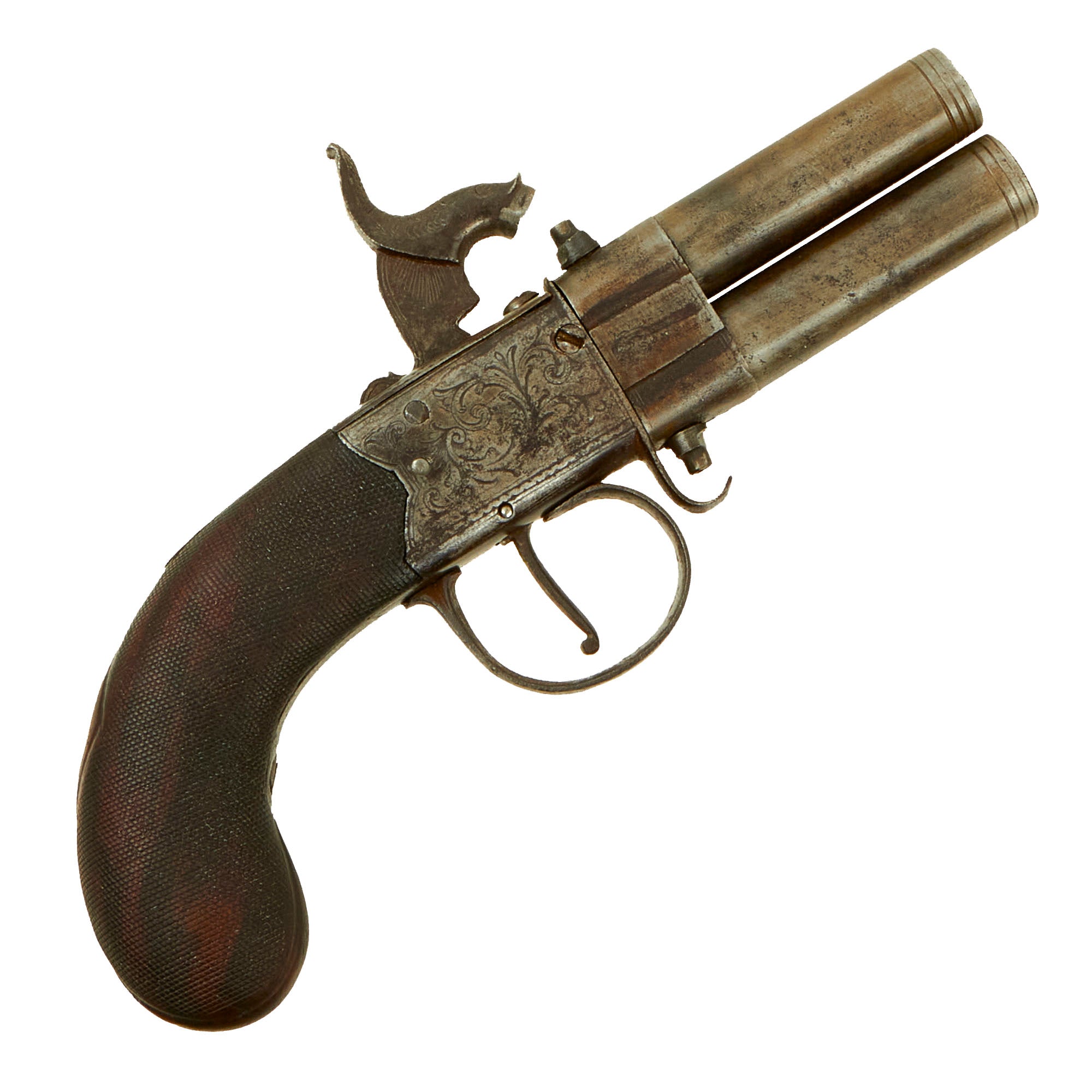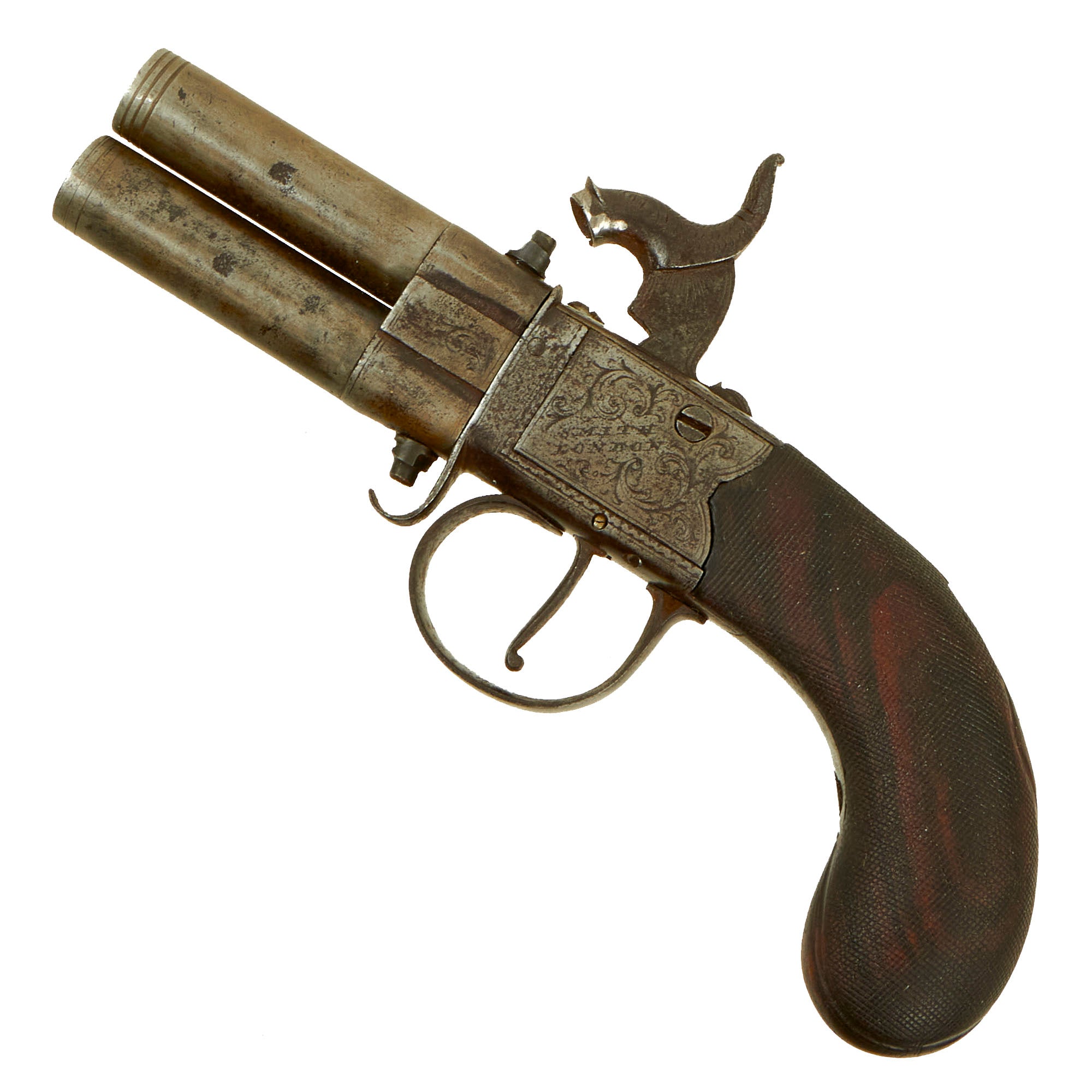 Original Item: Only One Available. This is a lovely British double barreled "turnover" pocket percussion pistol, marked on the left side of the box lock frame with SMITH / LONDON. This most likely refers to William Smith, who worked 1810-1845, but could also be Samuel & Charles Smith, who worked 1849-1874. It features double barrels, and a single trigger / hammer, with a pivot allowing the barrel assembly to "turnover", bringing a loaded barrel into position after the first barrel was fired. These were quite popular for self-protection, and having two barrels definitely would give the owner increased protection. Pistols like this were equally at home on dark Streets of New York or of London in Victorian England.