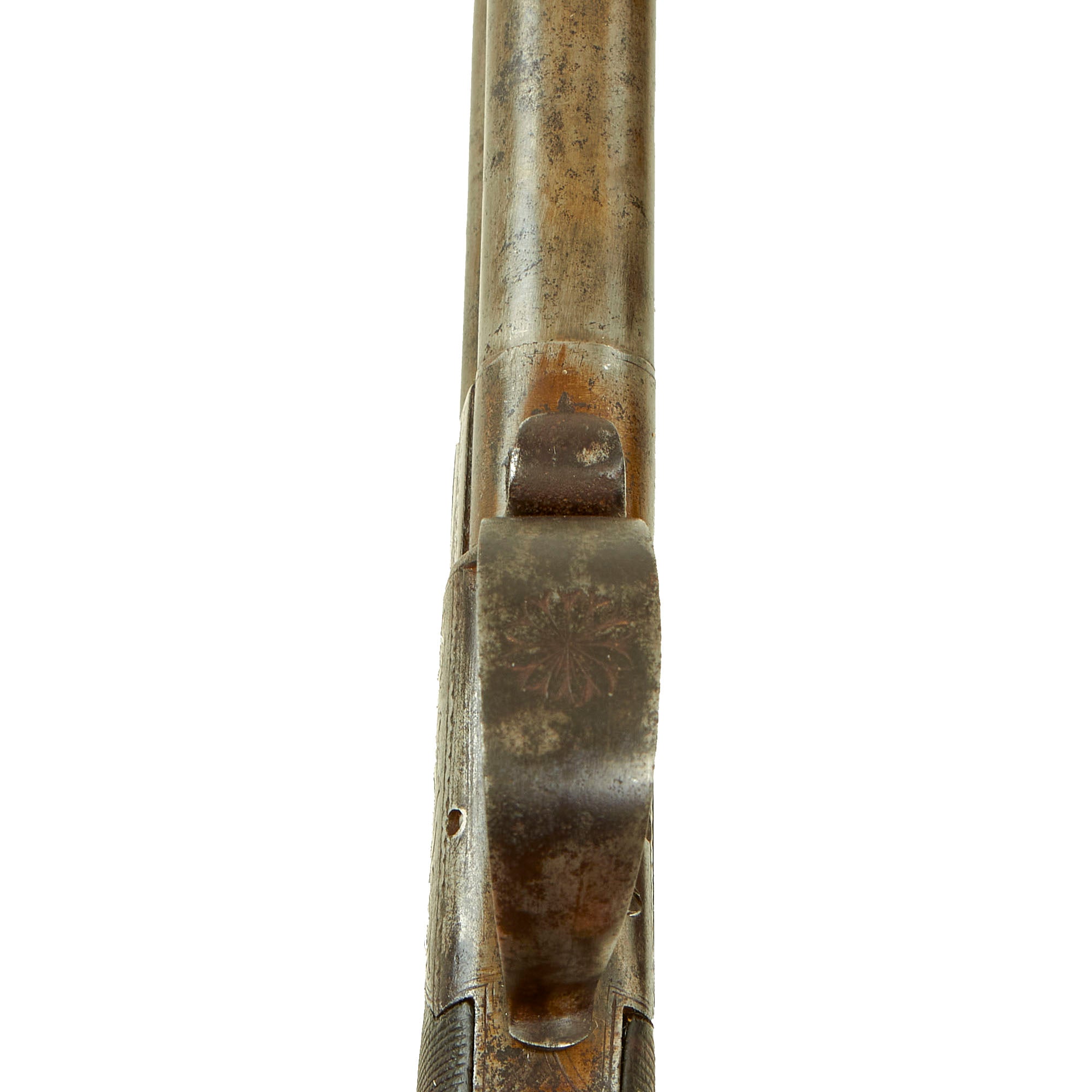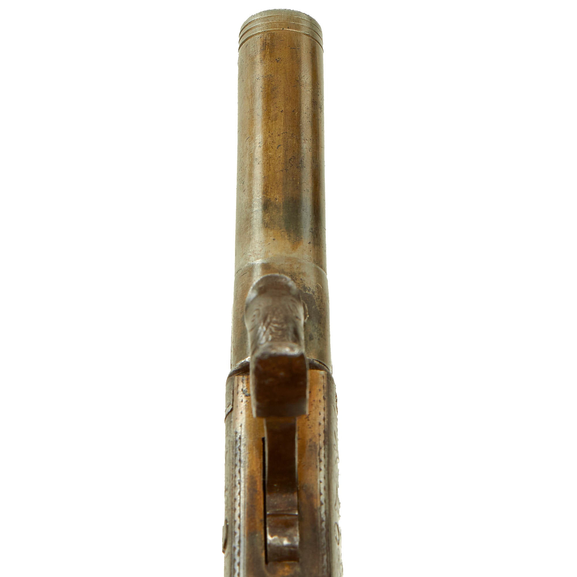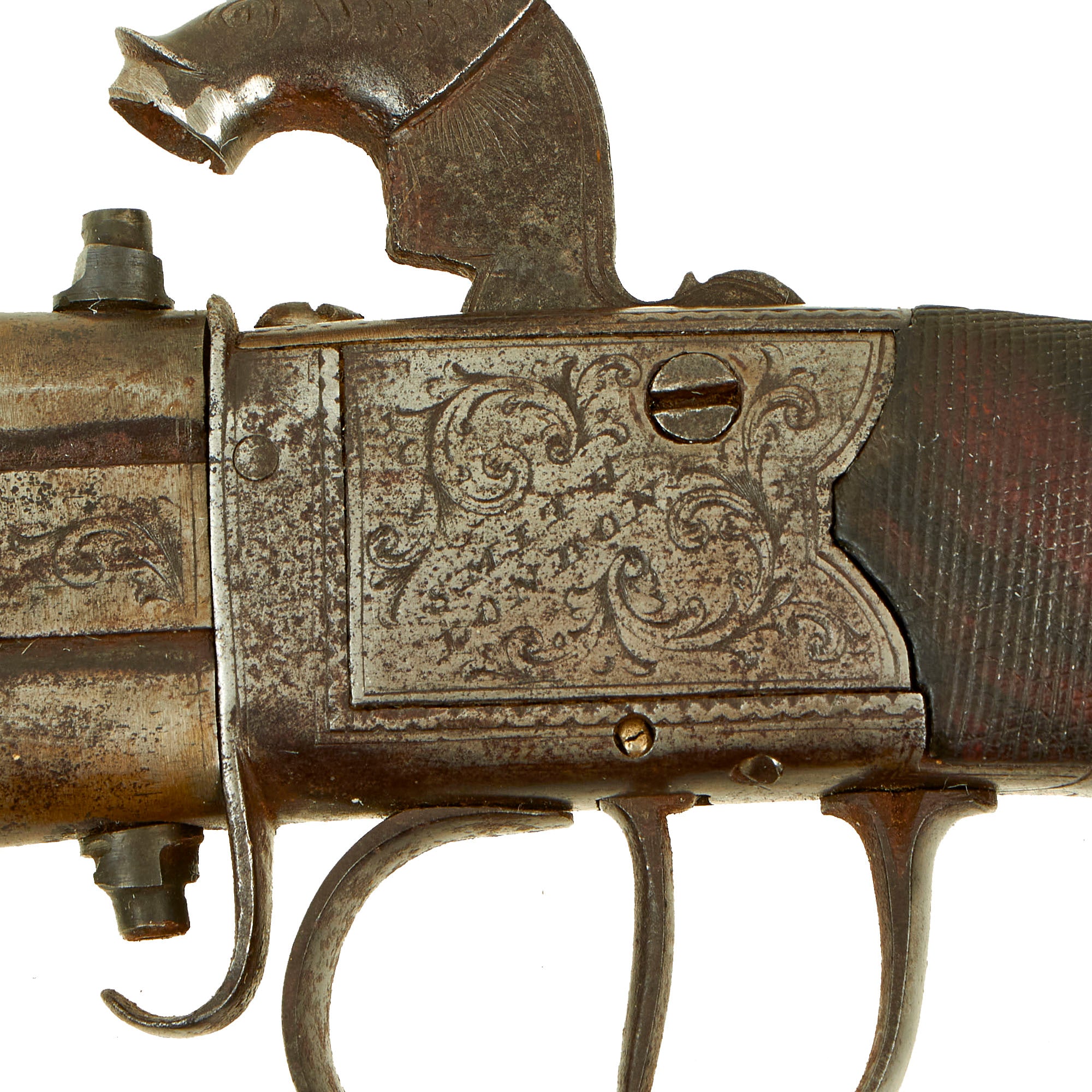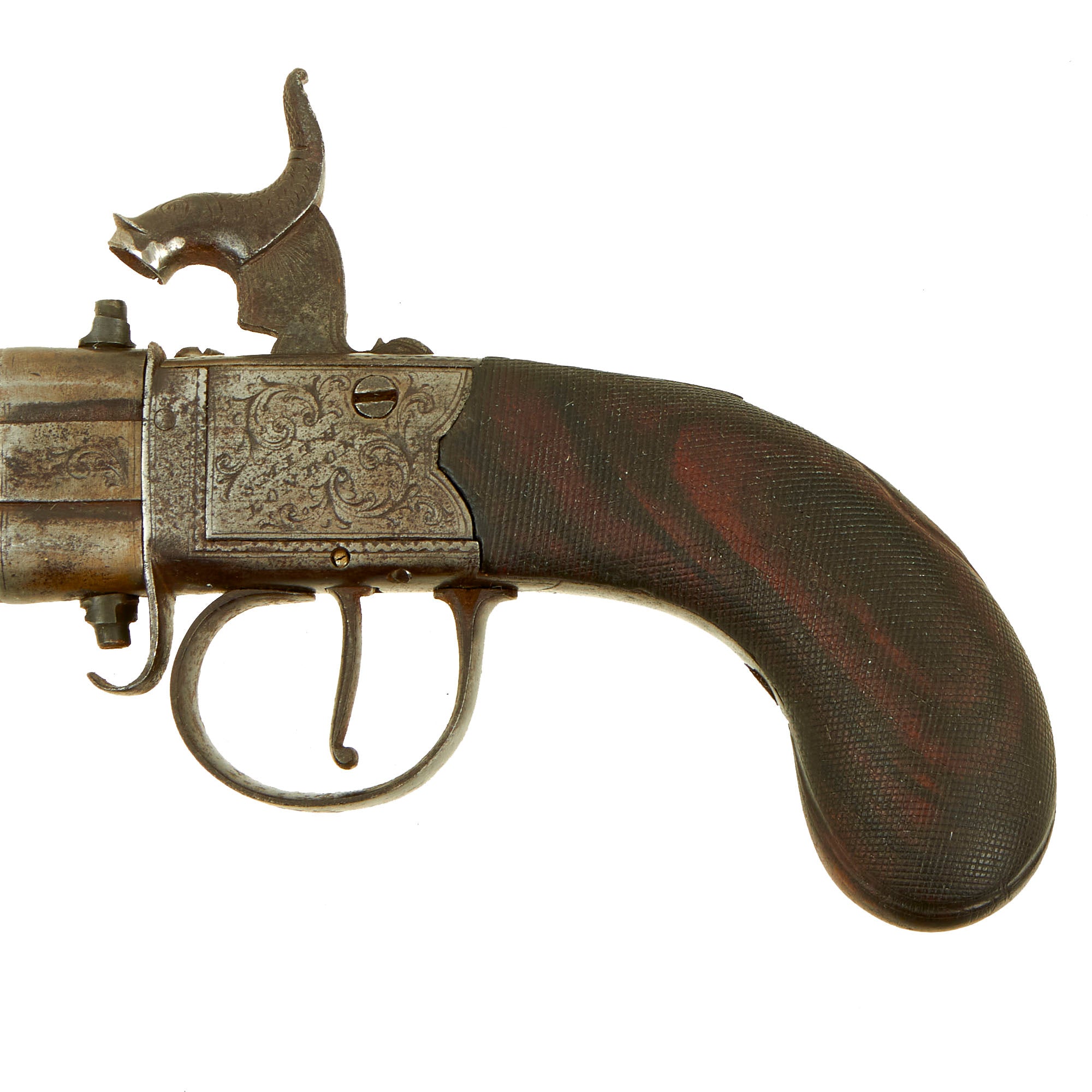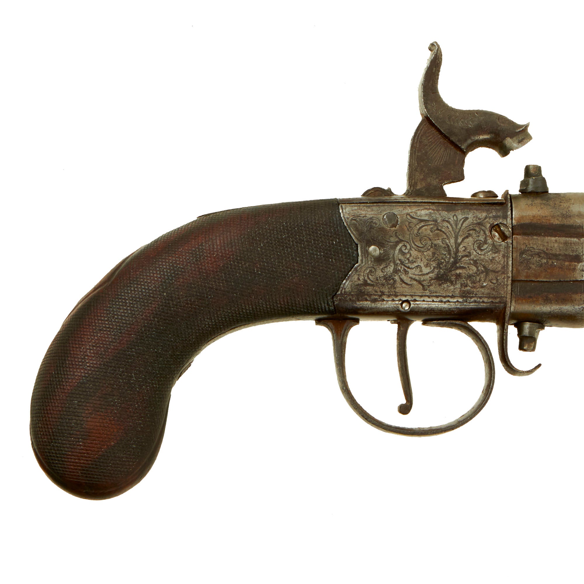 Original Item: Only One Available. This is a lovely British double barreled "turnover" pocket percussion pistol, marked on the left side of the box lock frame with SMITH / LONDON. This most likely refers to William Smith, who worked 1810-1845, but could also be Samuel & Charles Smith, who worked 1849-1874. It features double barrels, and a single trigger / hammer, with a pivot allowing the barrel assembly to "turnover", bringing a loaded barrel into position after the first barrel was fired. These were quite popular for self-protection, and having two barrels definitely would give the owner increased protection. Pistols like this were equally at home on dark Streets of New York or of London in Victorian England.