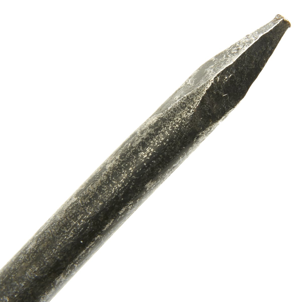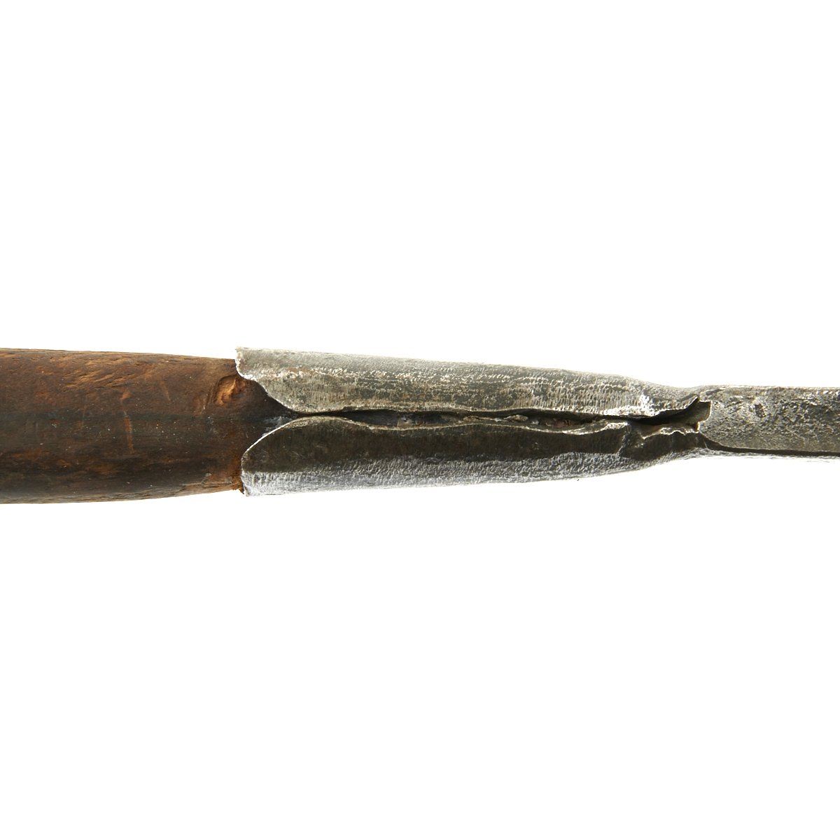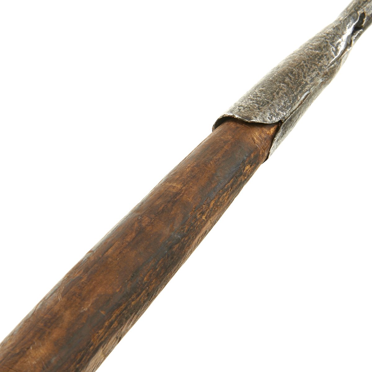 long spiked bottom end measuring 22". The center is made up of a wooden shaft section tapering at each end measuring 22" itself. Overall length is therefore 64" or there about. Use and age have taken their toll somewhat, as the ends are now loose on the wood center due to shrinkage, and can be pulled off by hand.