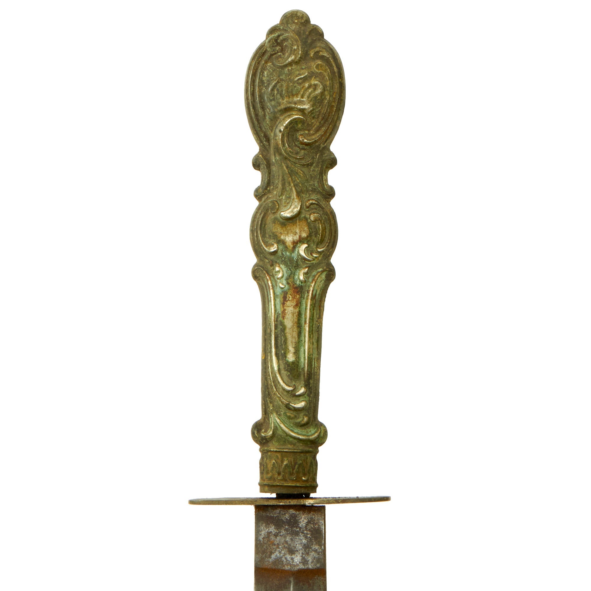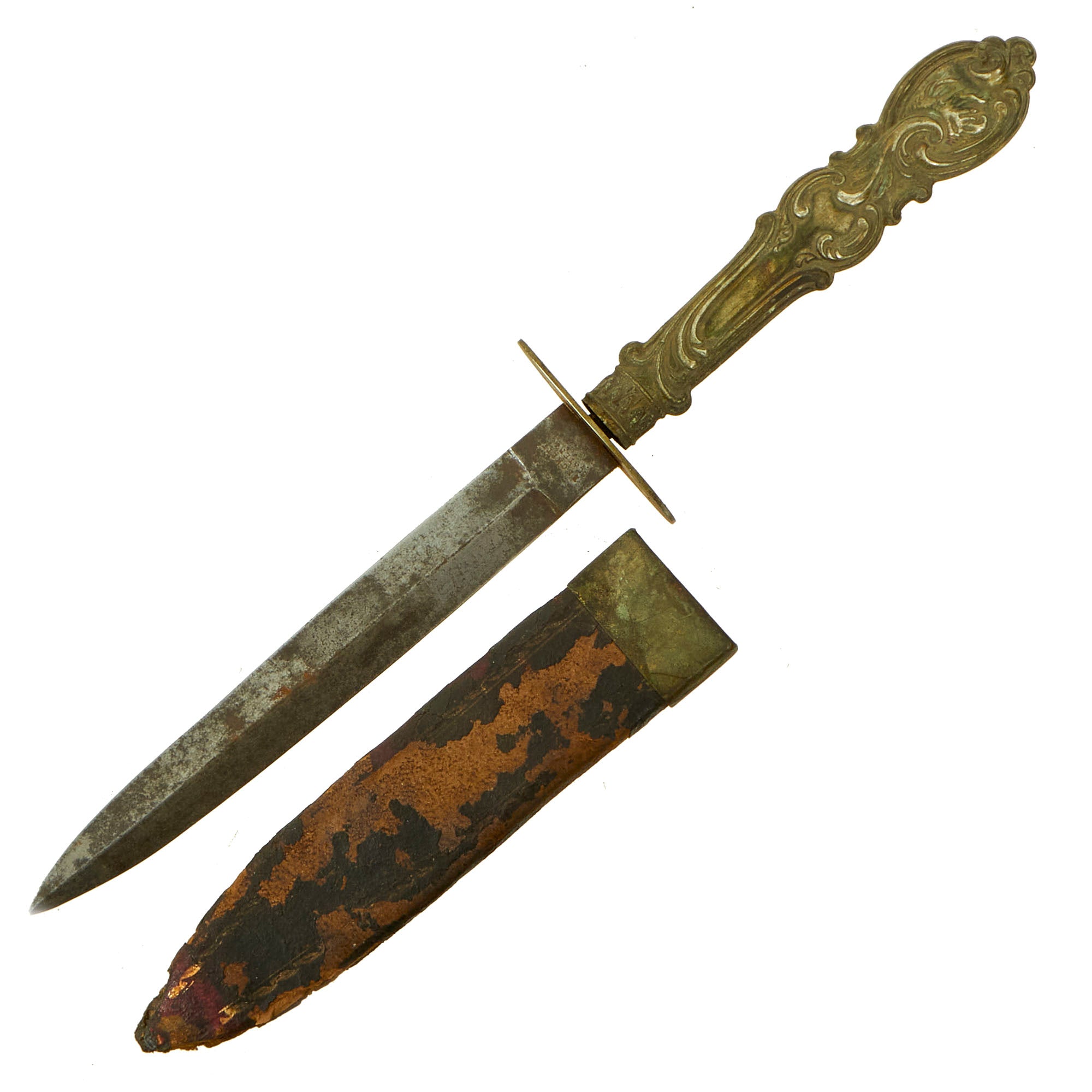 Original item: Only One Available. This is a very interesting and totally unresearched Victorian Era double edged fighting knife, which we believe to be of British or U.S. manufacture. It is marked BECKETT SLATER & Co. on the blade ricasso, a company that we have not been able to find any information on. The knife has a very nice tarnished embossed silver hilt, and what looks to be a brass cross guard. It comes with a weathered leather scabbard, which is missing the drag mount, but looks to have originally been quite smart looking.