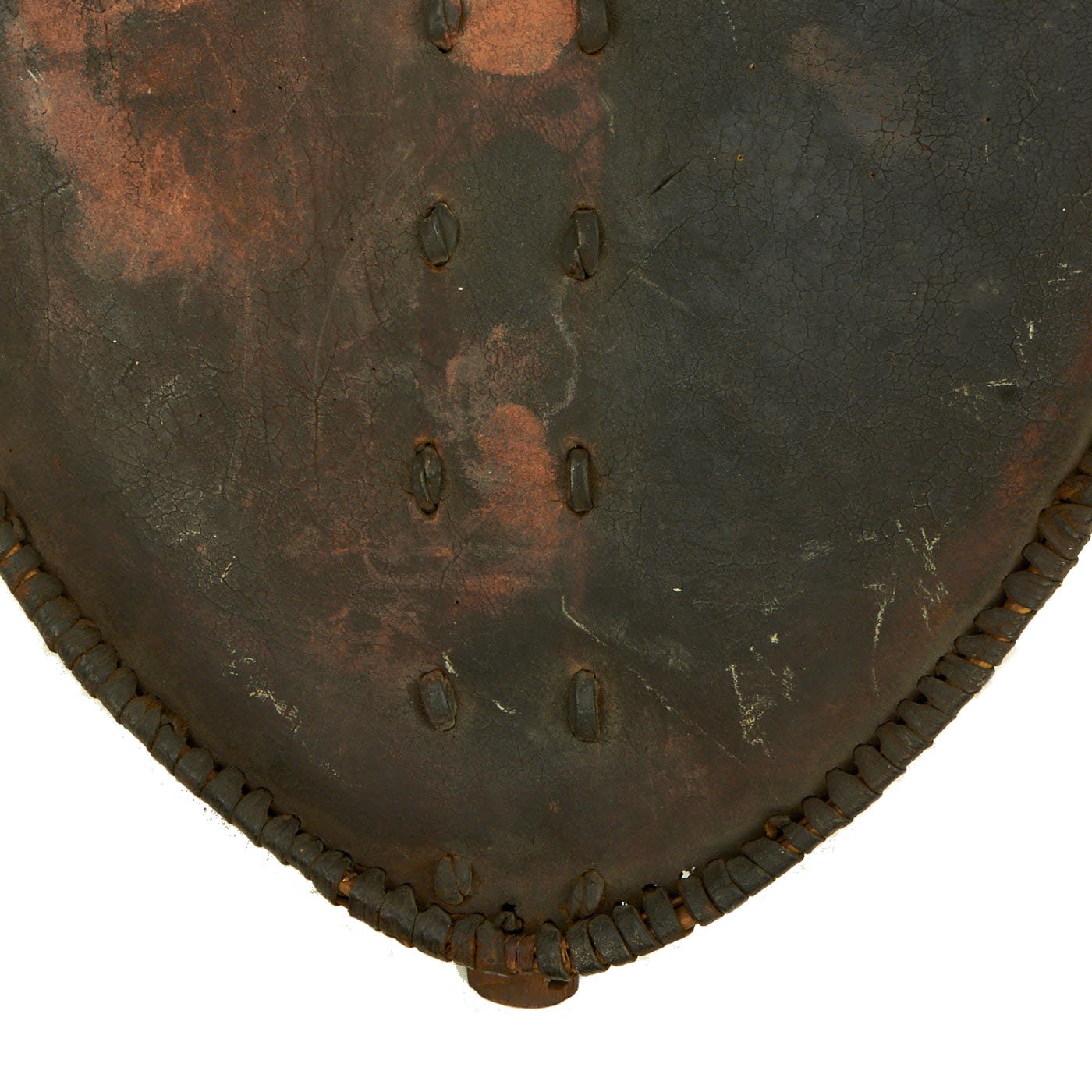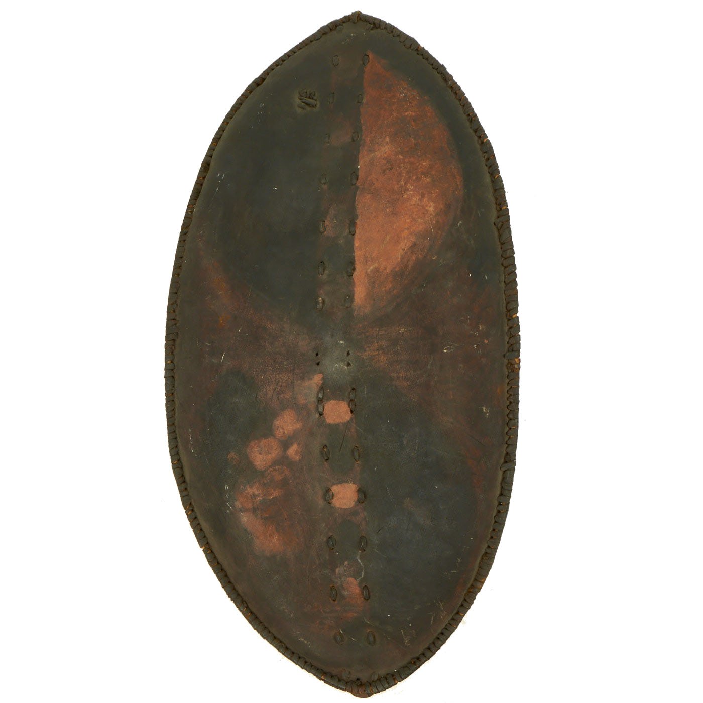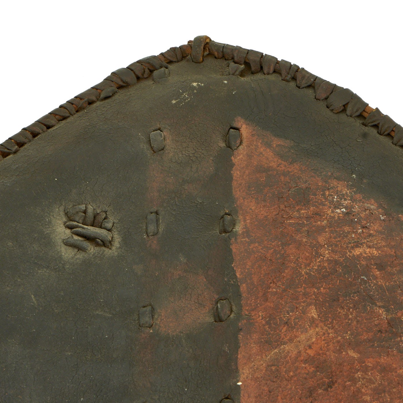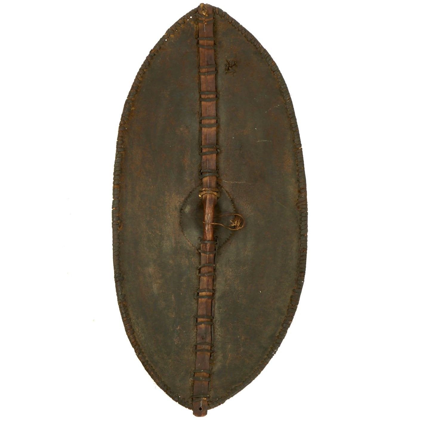 The last part of the set is a magnificent painted shield, which we suspect is made from rhino hide. It measures 42" in height and 21" in width, with a wood spine to the inside bound in old leather thonging.
