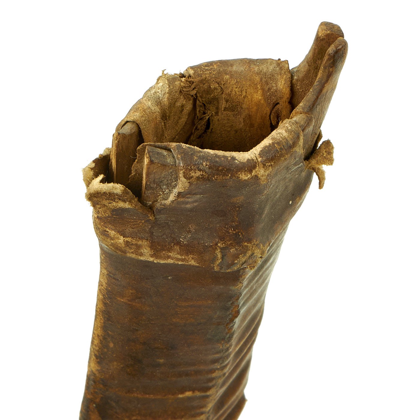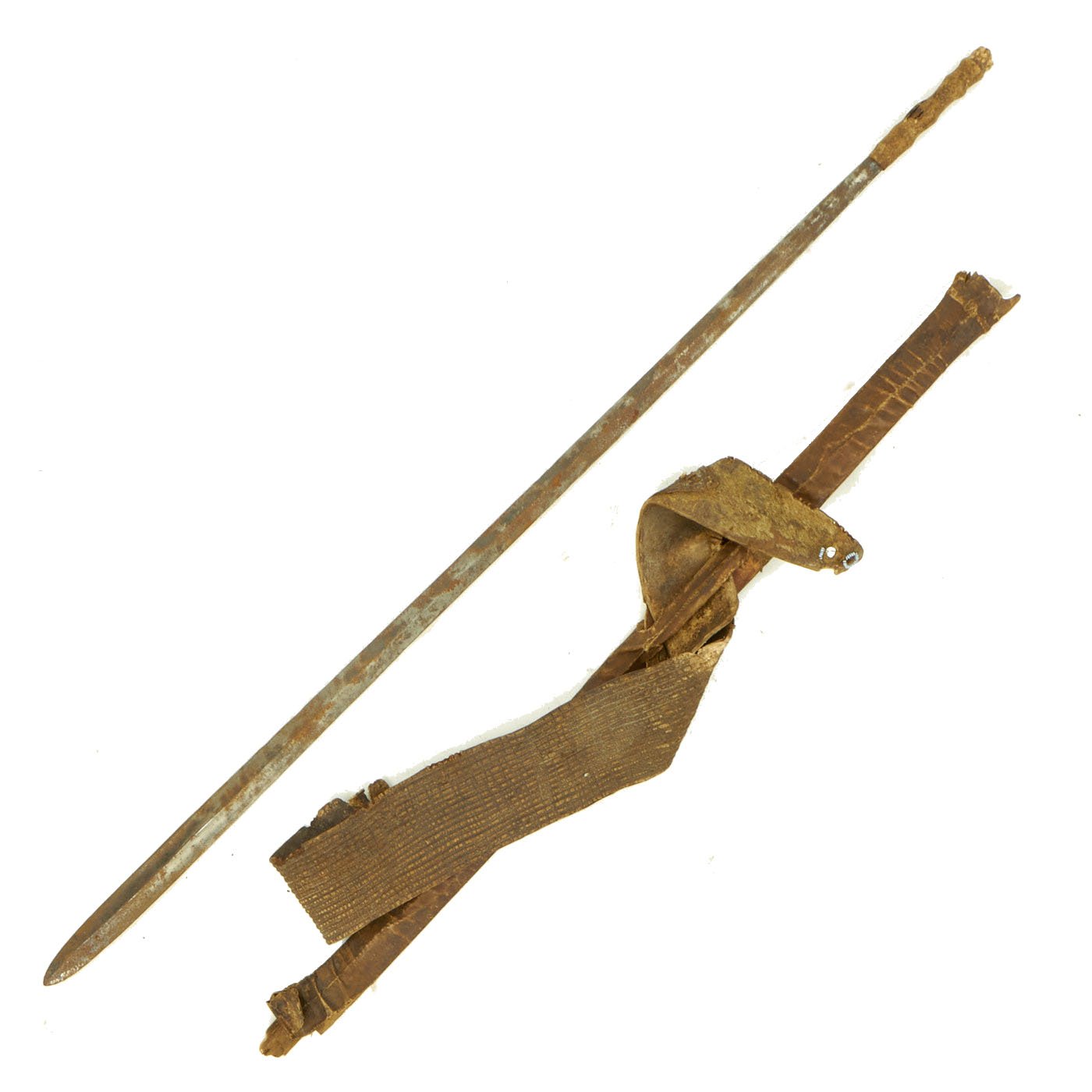 The first piece of the set is a typical Maasai short sword, known as a "semi", which comes with most of its original leather scabbard and a section of leather waist/shoulder belt. The sword measures 33 ½” overall, with a thin 29 ¾” long blade, which is quite sturdy. The handle is wood wrapped with leather.