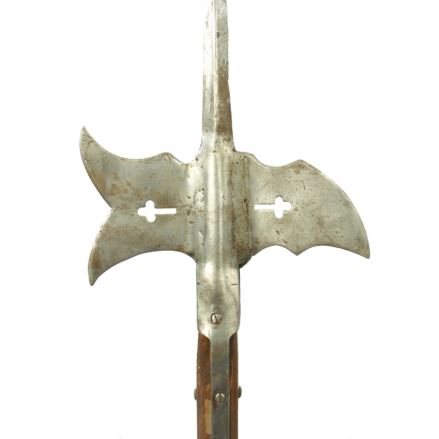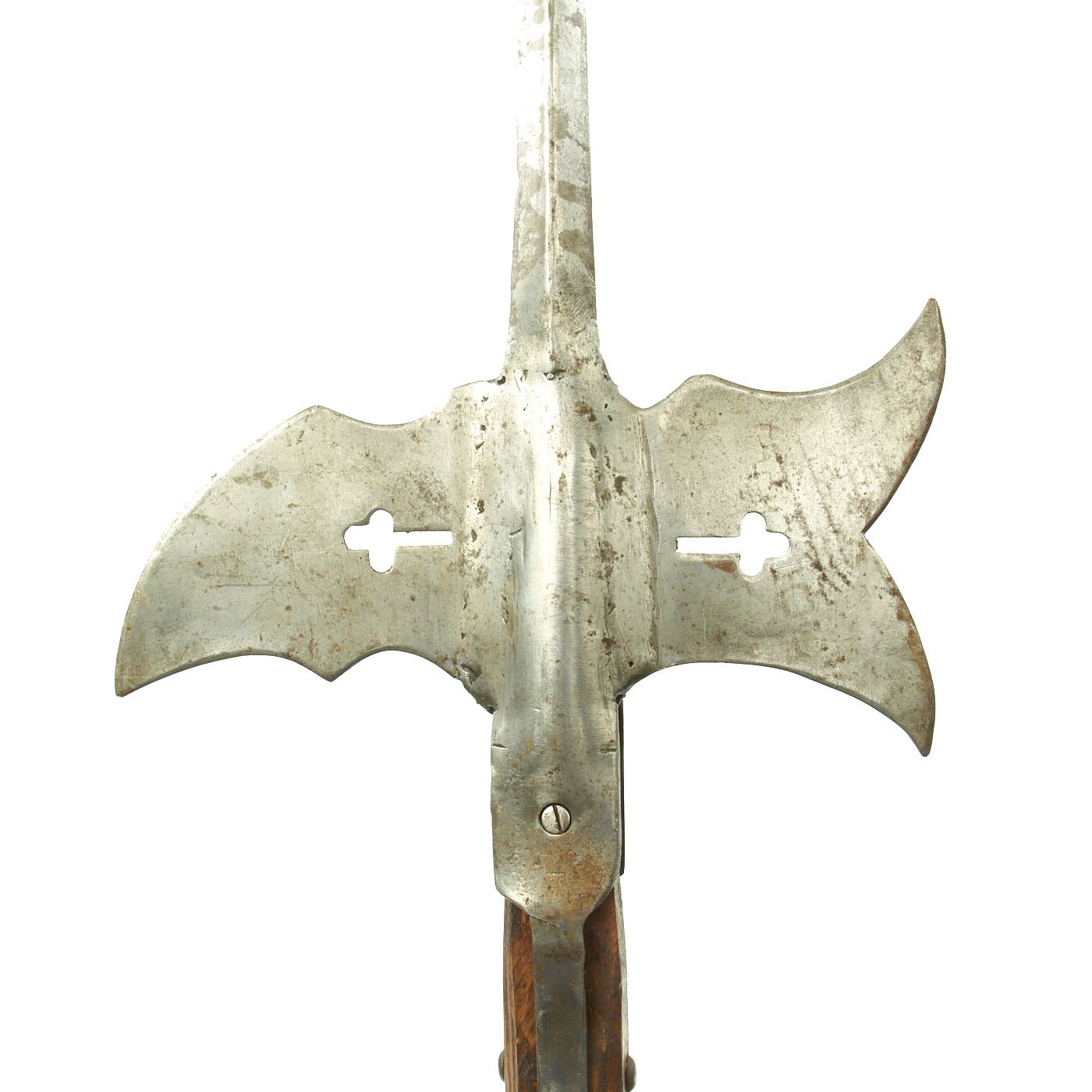 For ease of transportation the haft has been sawn at an angle, with a fat wooden dowel inserted so it can be reassembled for display, each section measuring approximately 52". The iron head displays an AXE on the one side and a spiked HOOK on the other, both decorated with Christian symbol Crucifixes. These 1500-1600 Halberds are known for the extra long spike to the tops which were largely obsoleted by the English Civil War of 1640.