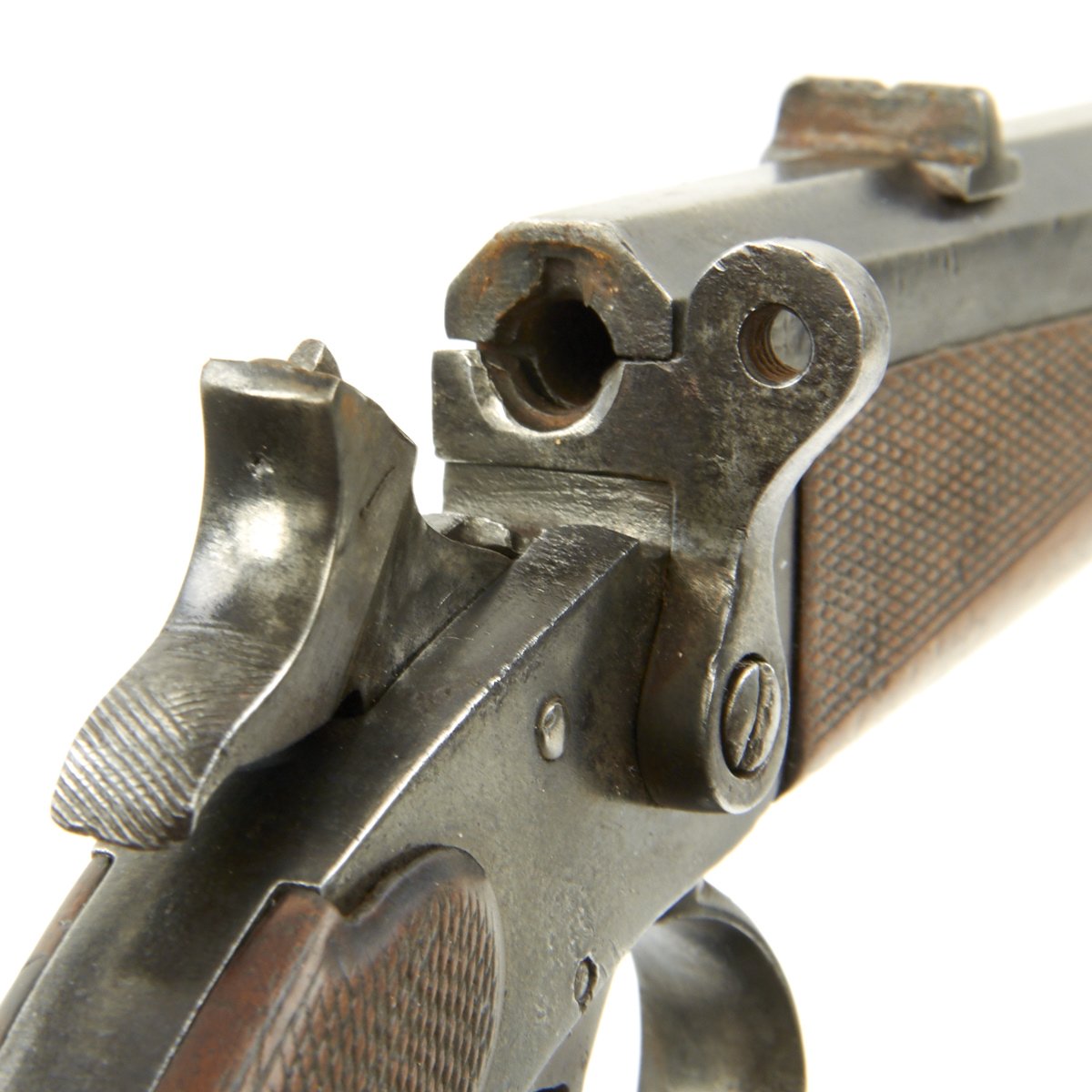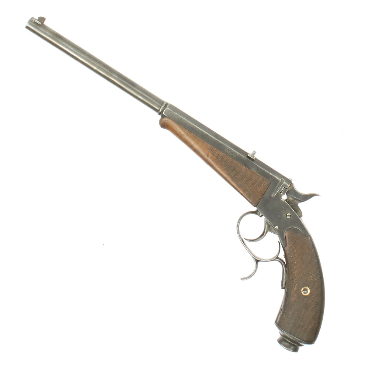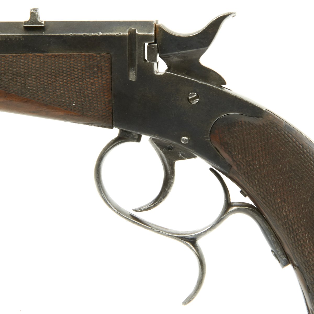 Original Item: Only One Available. In really nice condition, this is a Victorian era .22 short rimfire caliber single shot Target Pistol, with a very nice checkered walnut grip. The barrel and frame bear German proof marks on the right side of the chamber, and the left side is marked with information on the pistols specifications: