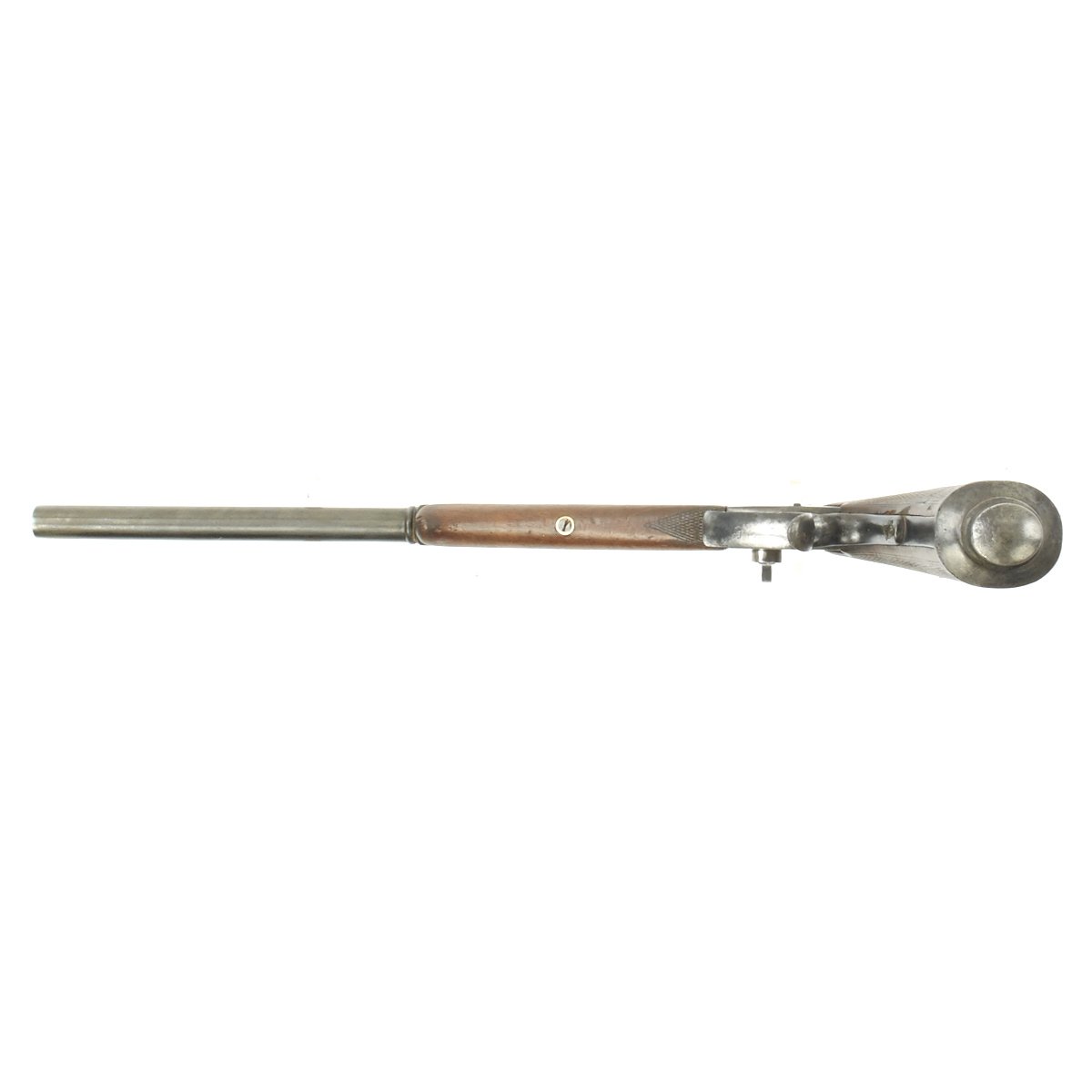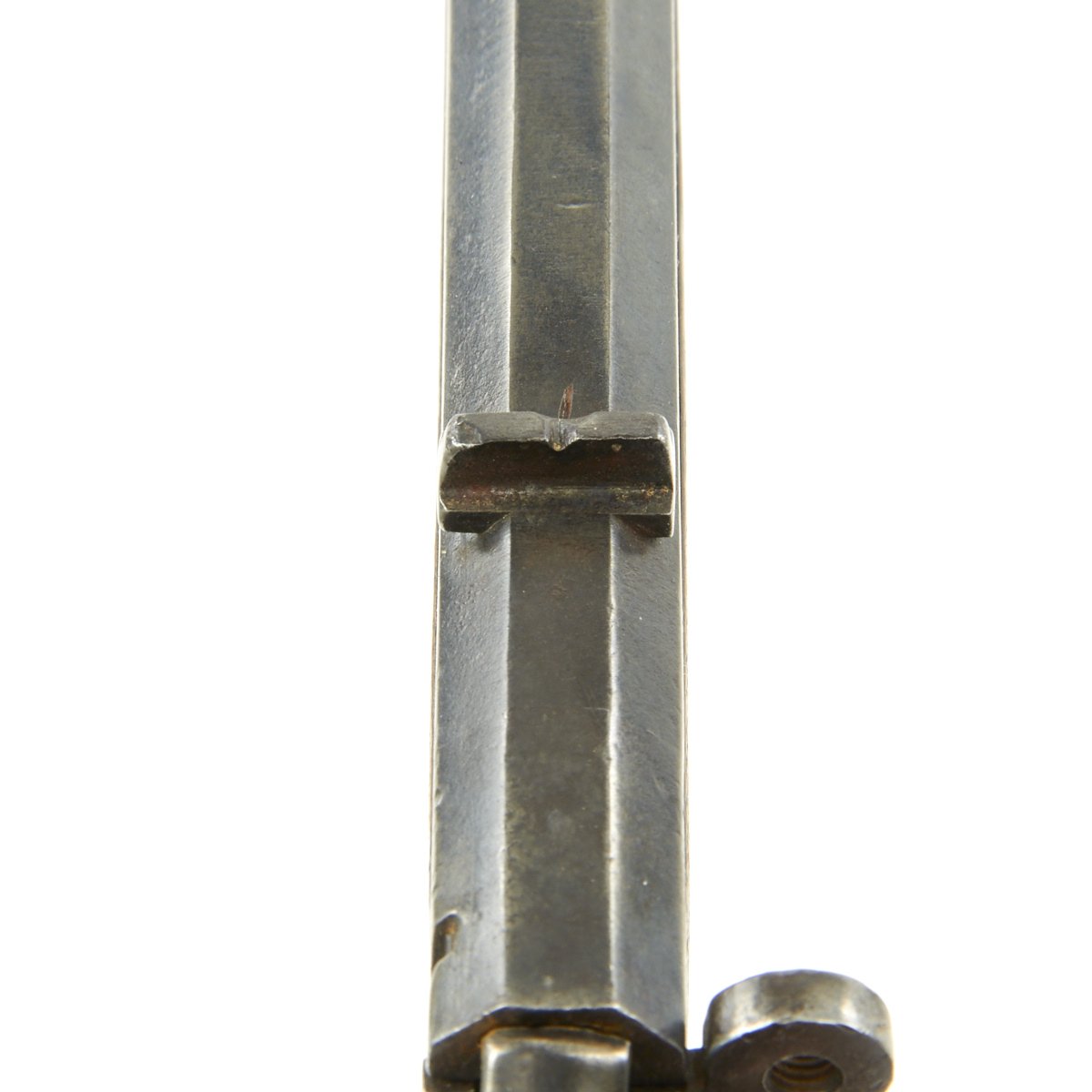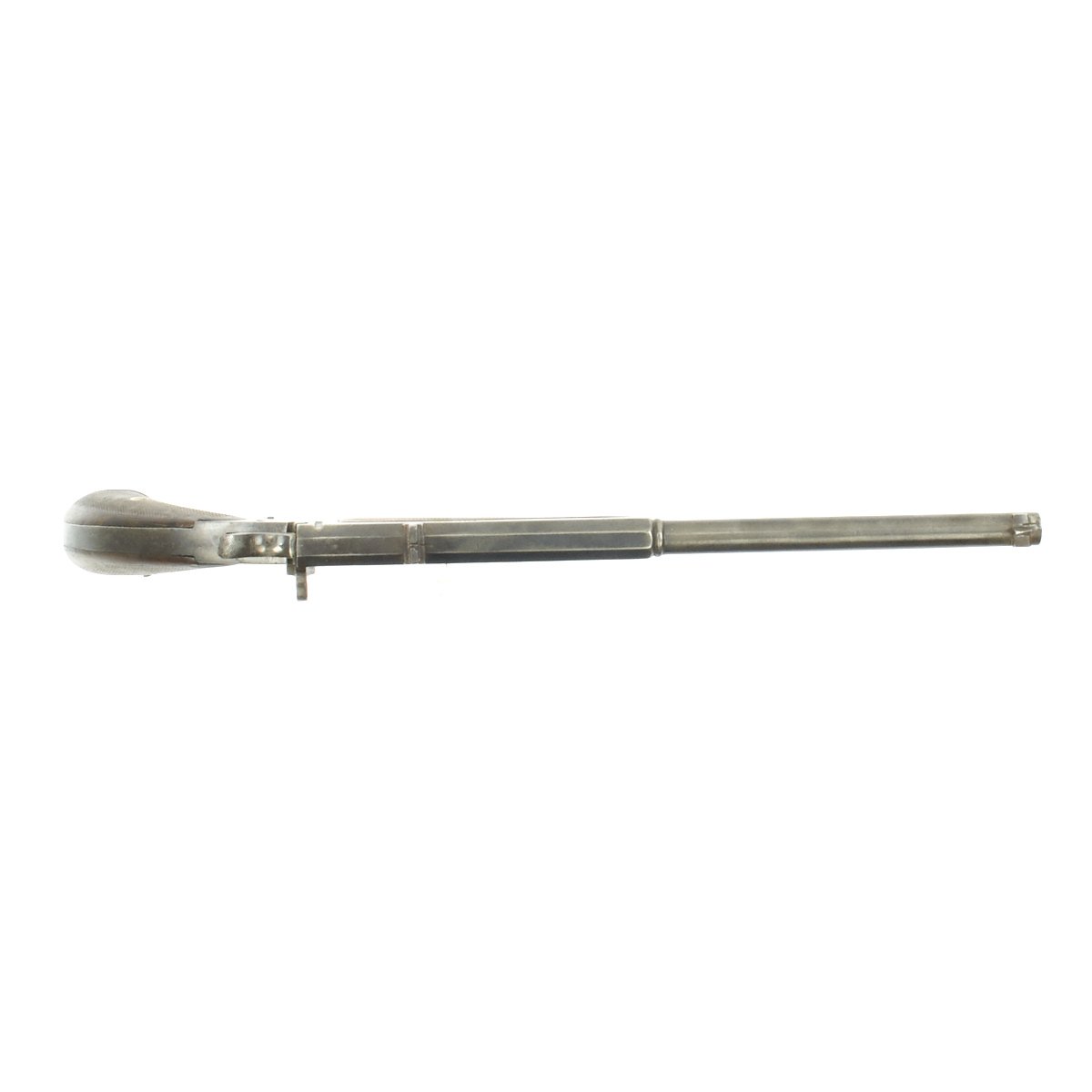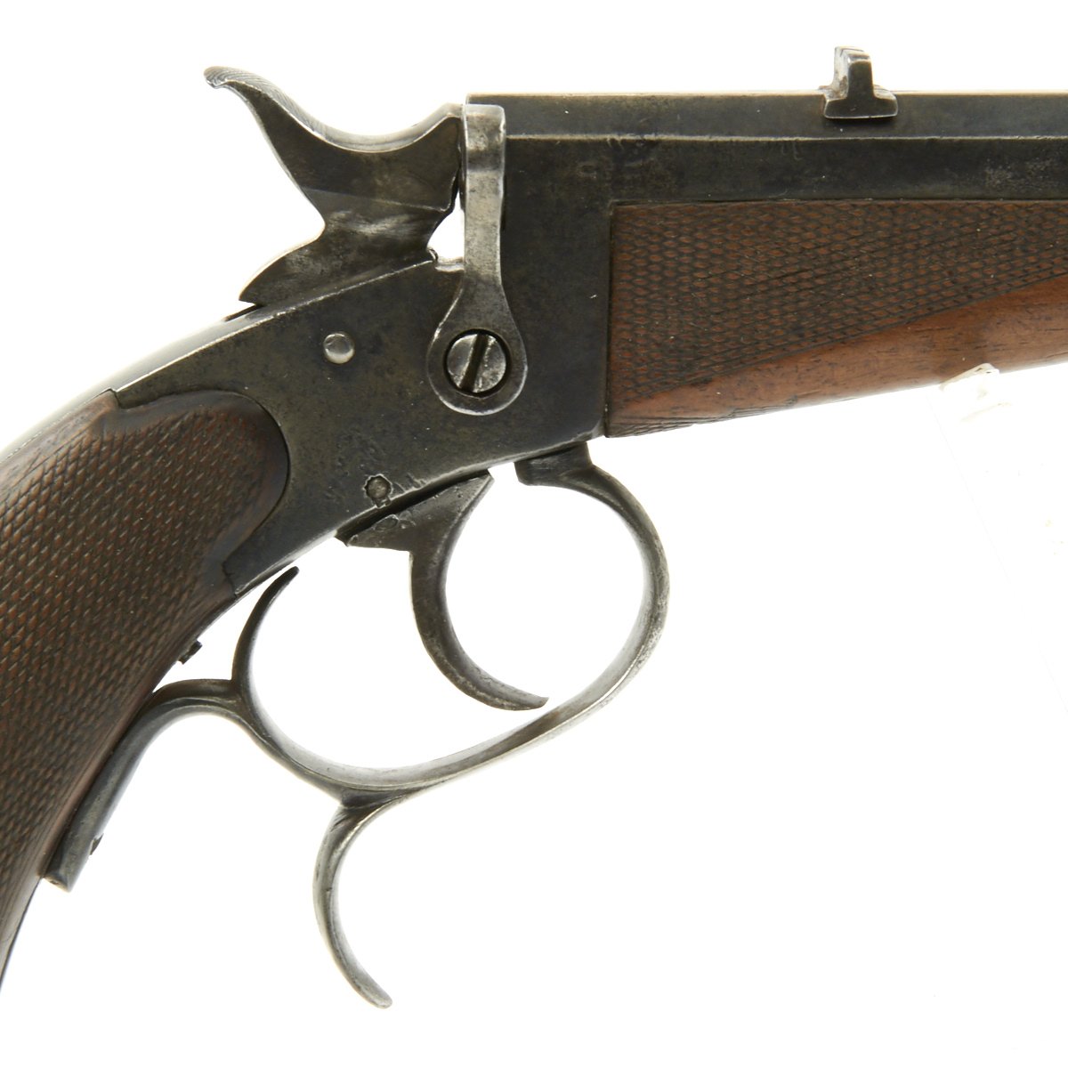 These were often used for indoor shooting, a rage which swept Europe in the late 19th Century. Trigger guard has an extra finger spur on the bottom for a second finger to help stabilize the pistol. This pistol also has an open breech, with lever extractor. These were designed for very small powder loads, as they were usually used indoors.