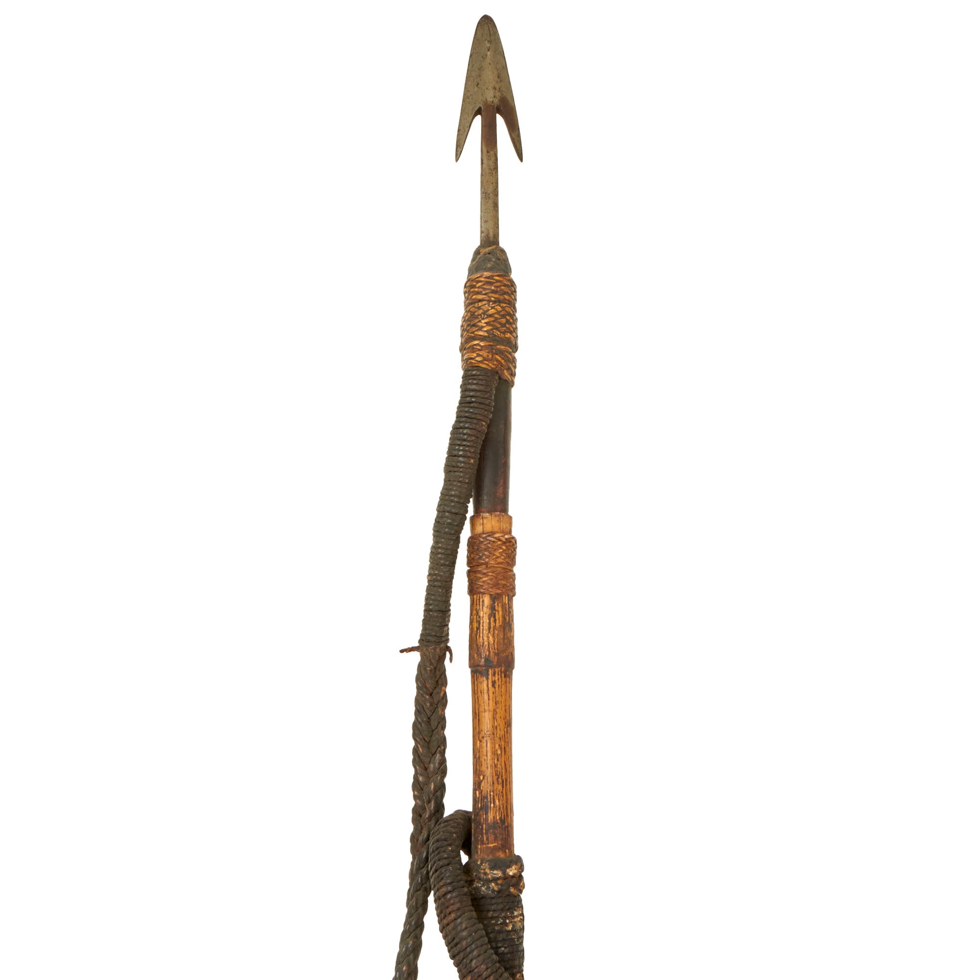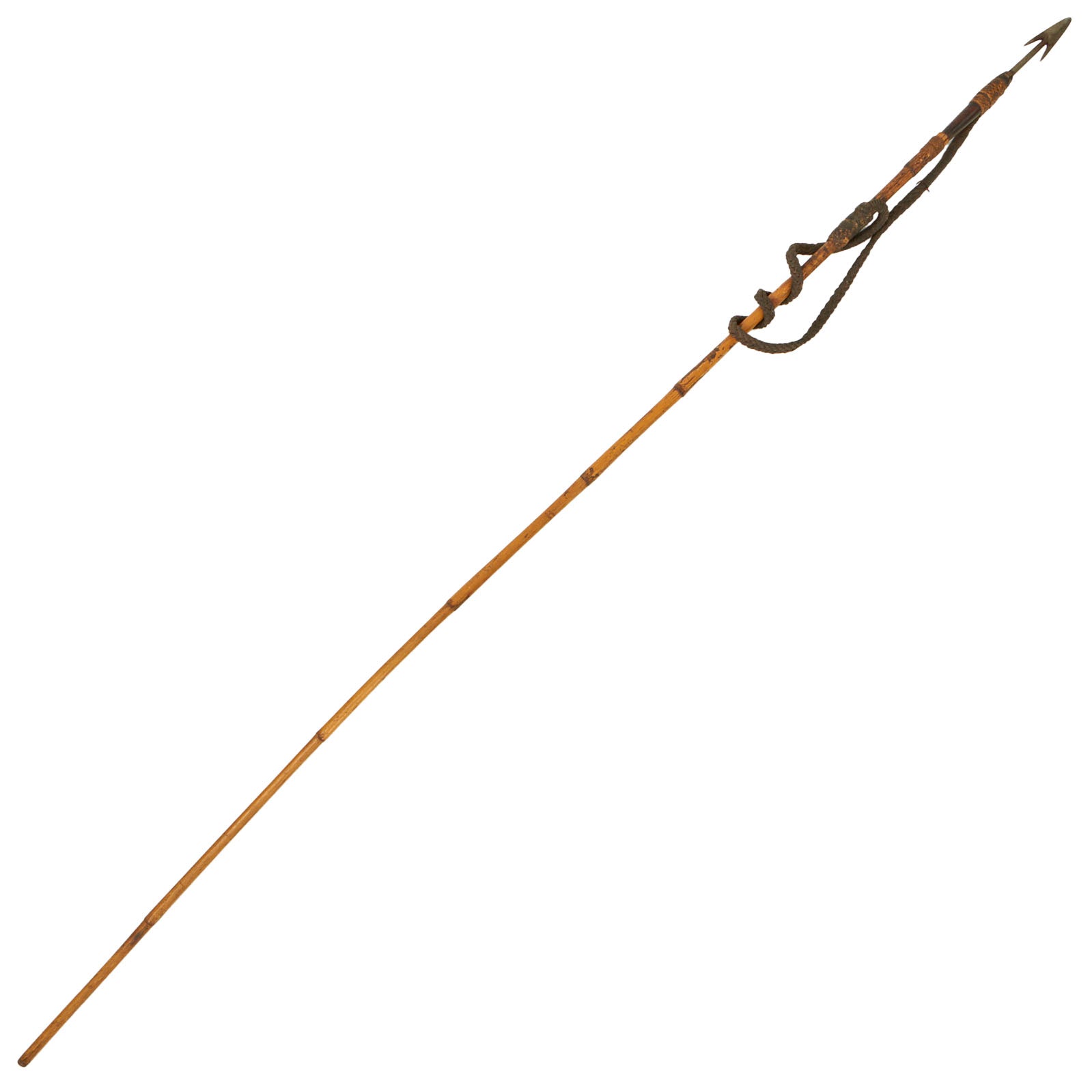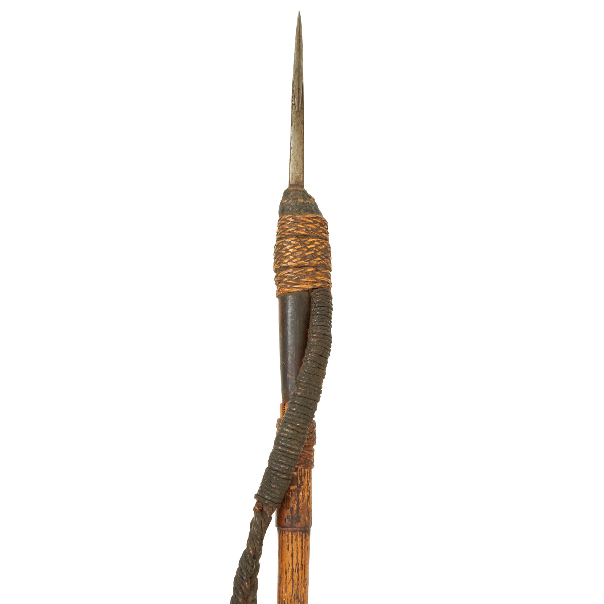 The shaft of the spear appears to be made of either bamboo or cane. It starts small at the bottom but becomes larger the further up it goes. The spear insert does not hold very well in the hole and must be kept upright to stop it from falling out. The ropes are very thick and are strengthened to handle being thrown. The ropes are very dark and show a great deal of age. This is a very unique piece that could use a great deal more research. Ready for display.