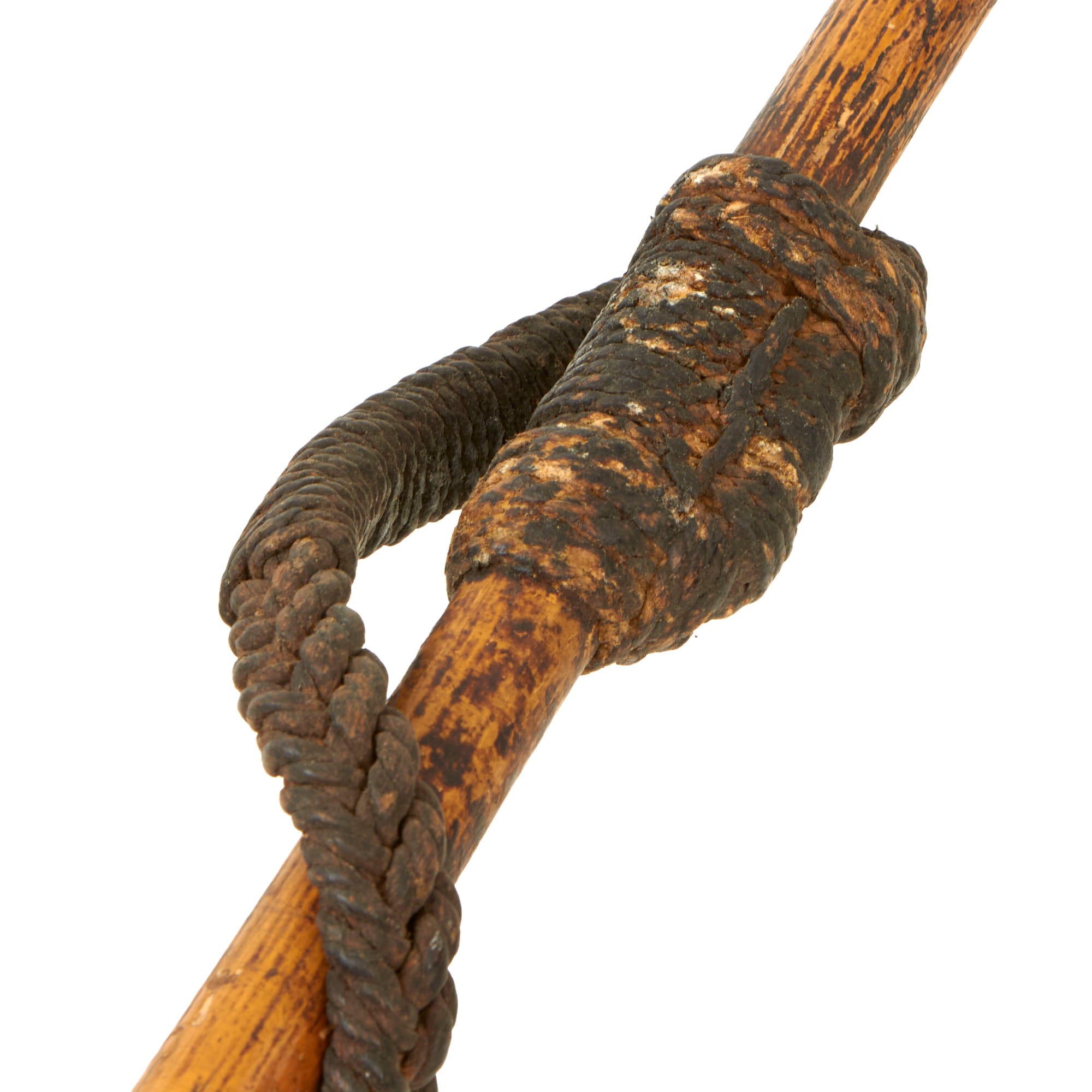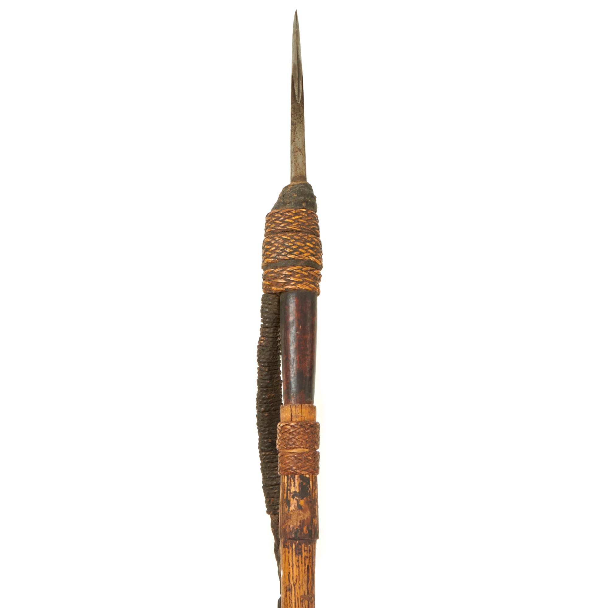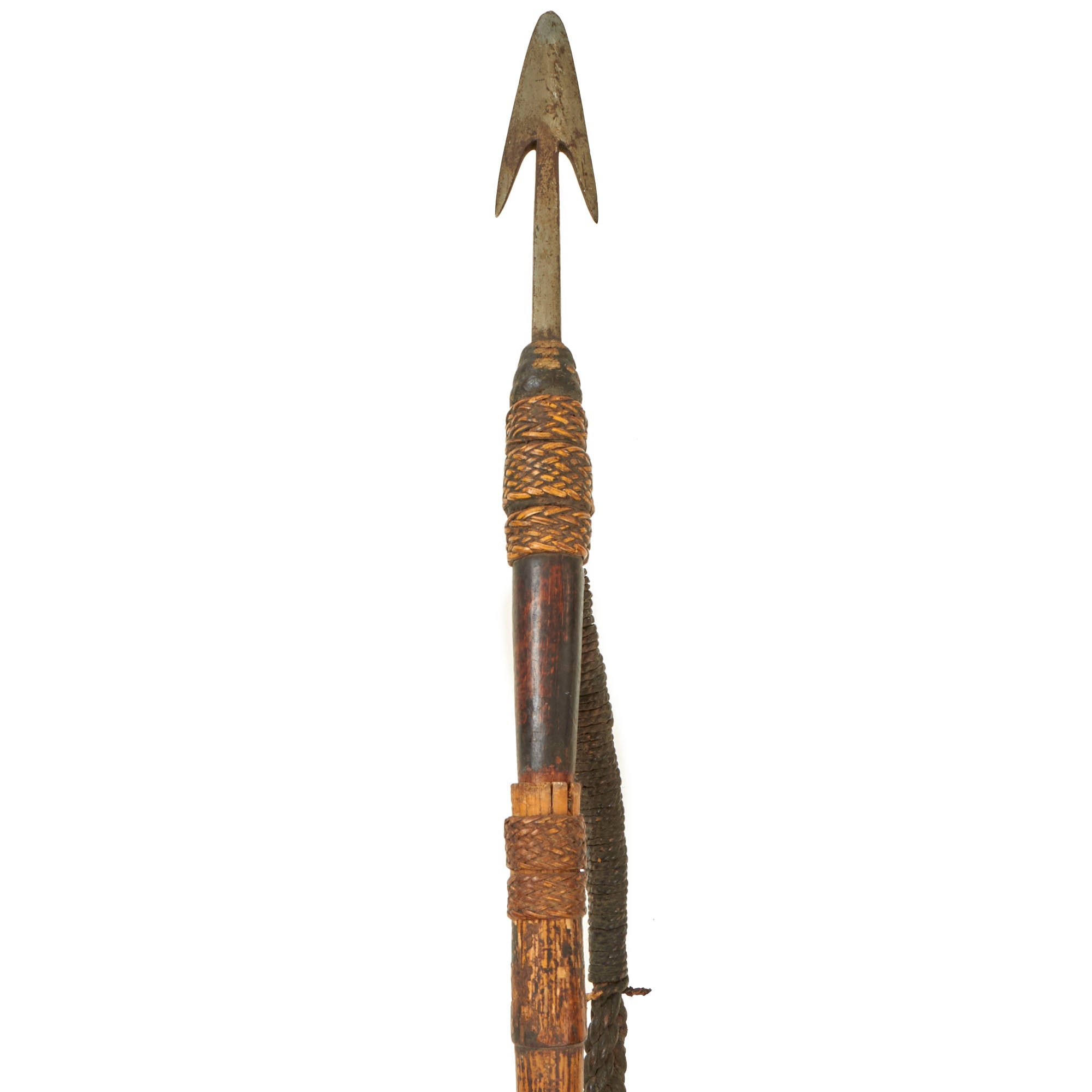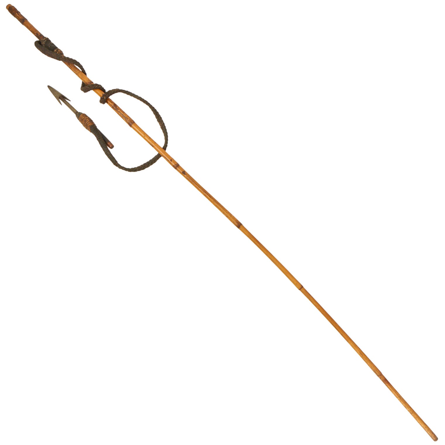 The shaft of the spear appears to be made of either bamboo or cane. It starts small at the bottom but becomes larger the further up it goes. The spear insert does not hold very well in the hole and must be kept upright to stop it from falling out. The ropes are very thick and are strengthened to handle being thrown. The ropes are very dark and show a great deal of age. This is a very unique piece that could use a great deal more research. Ready for display.