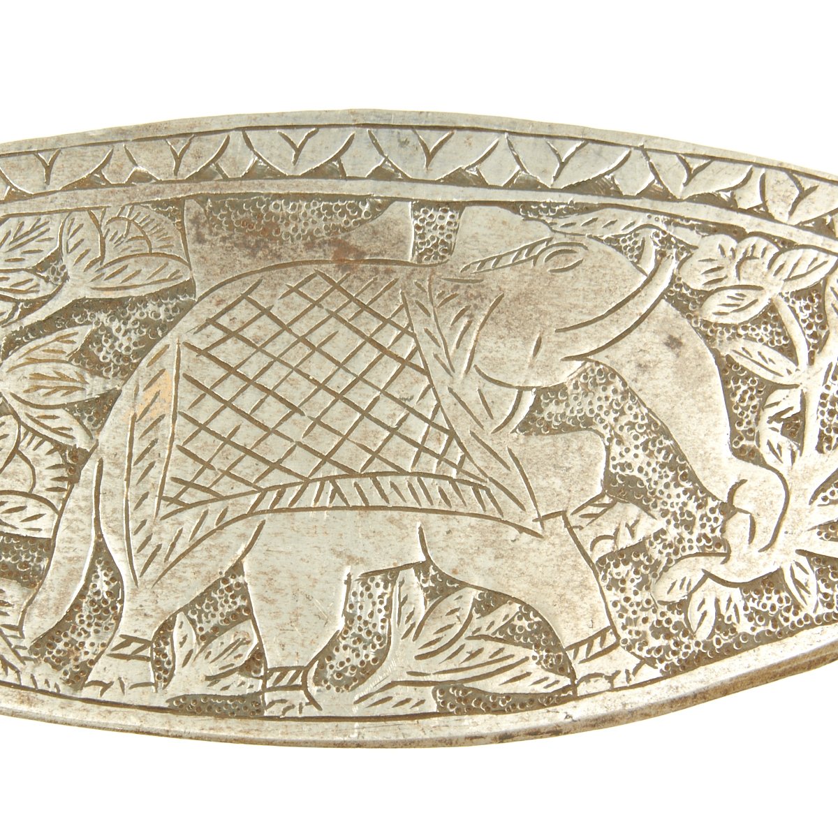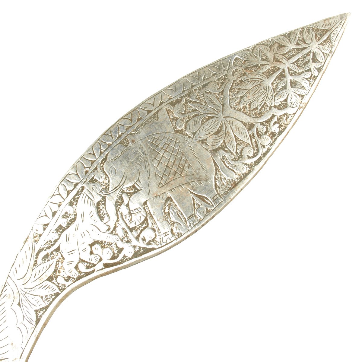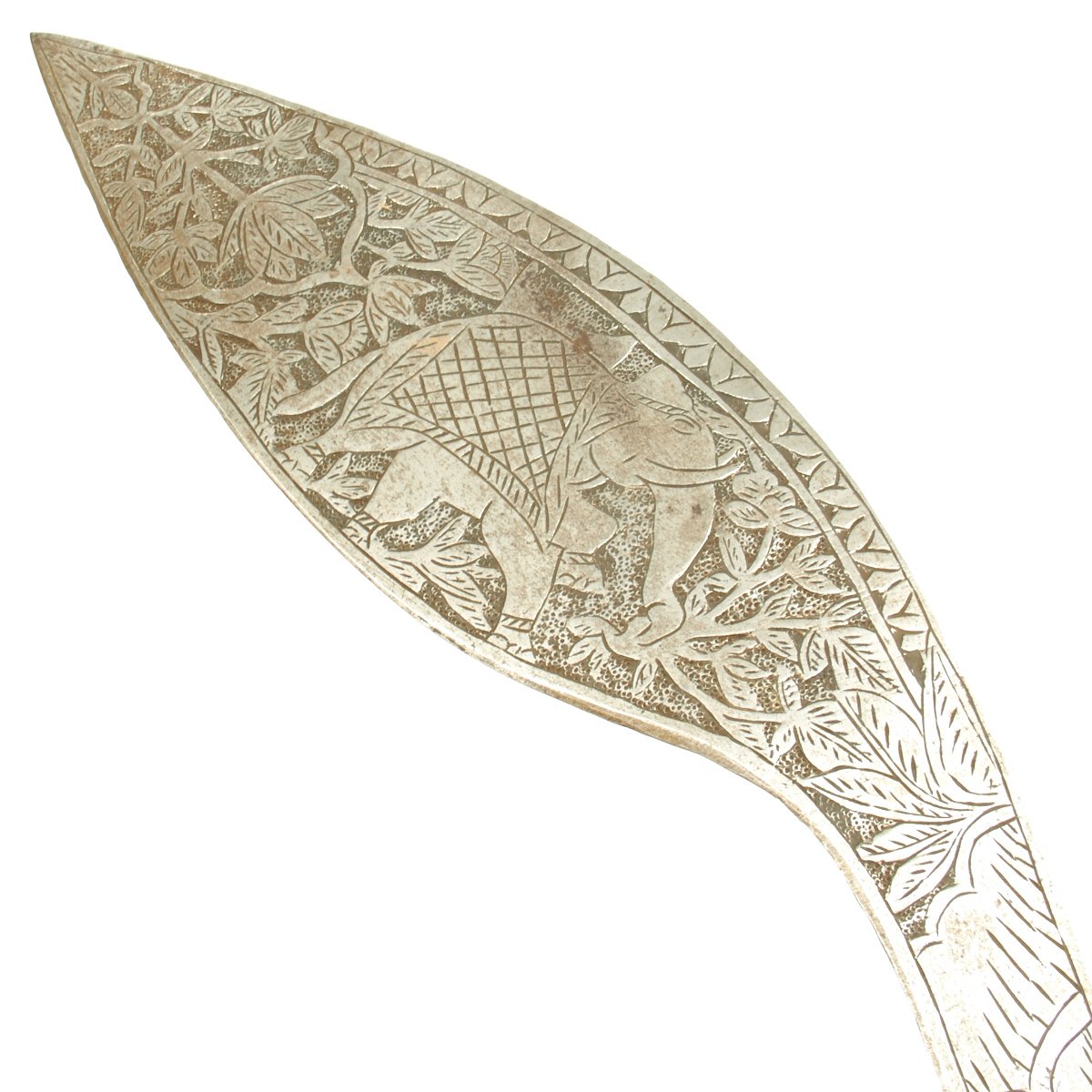 Clearly intended for Ceremonial use, this huge steel Kukri knife measures 20 " overall with a 16" long very wide blade. The blade flat is smothered all over with embossed depictions of Elephants and Tigers amid foliage.