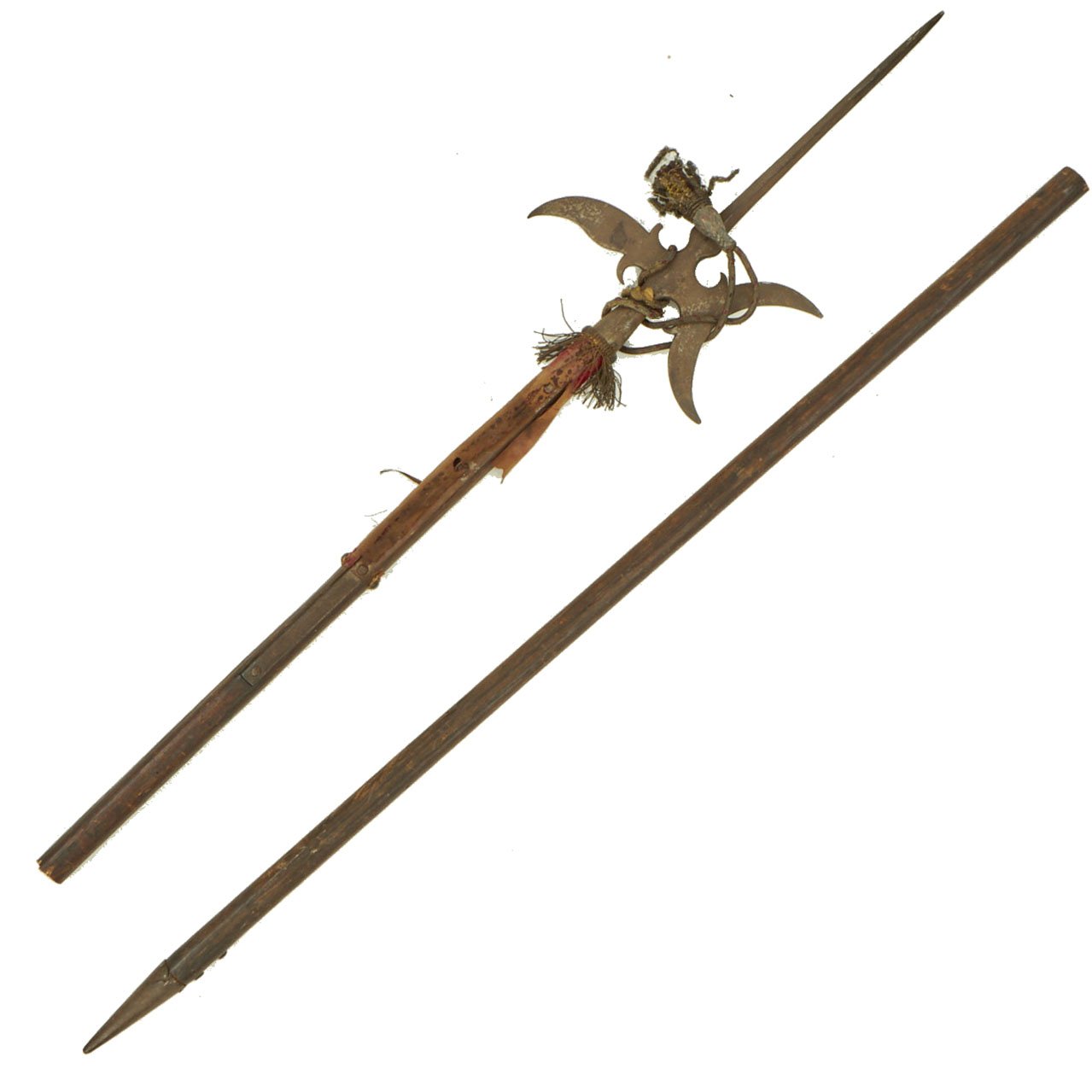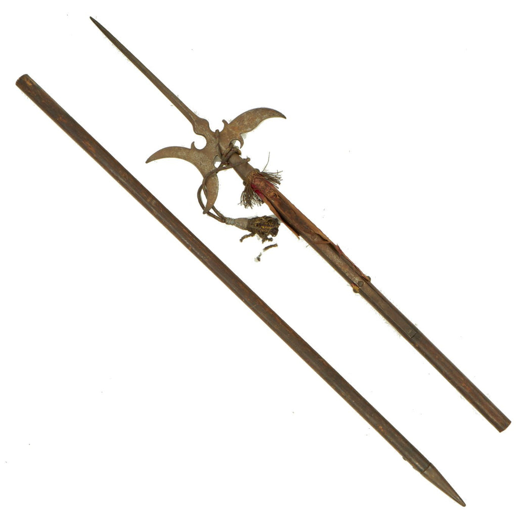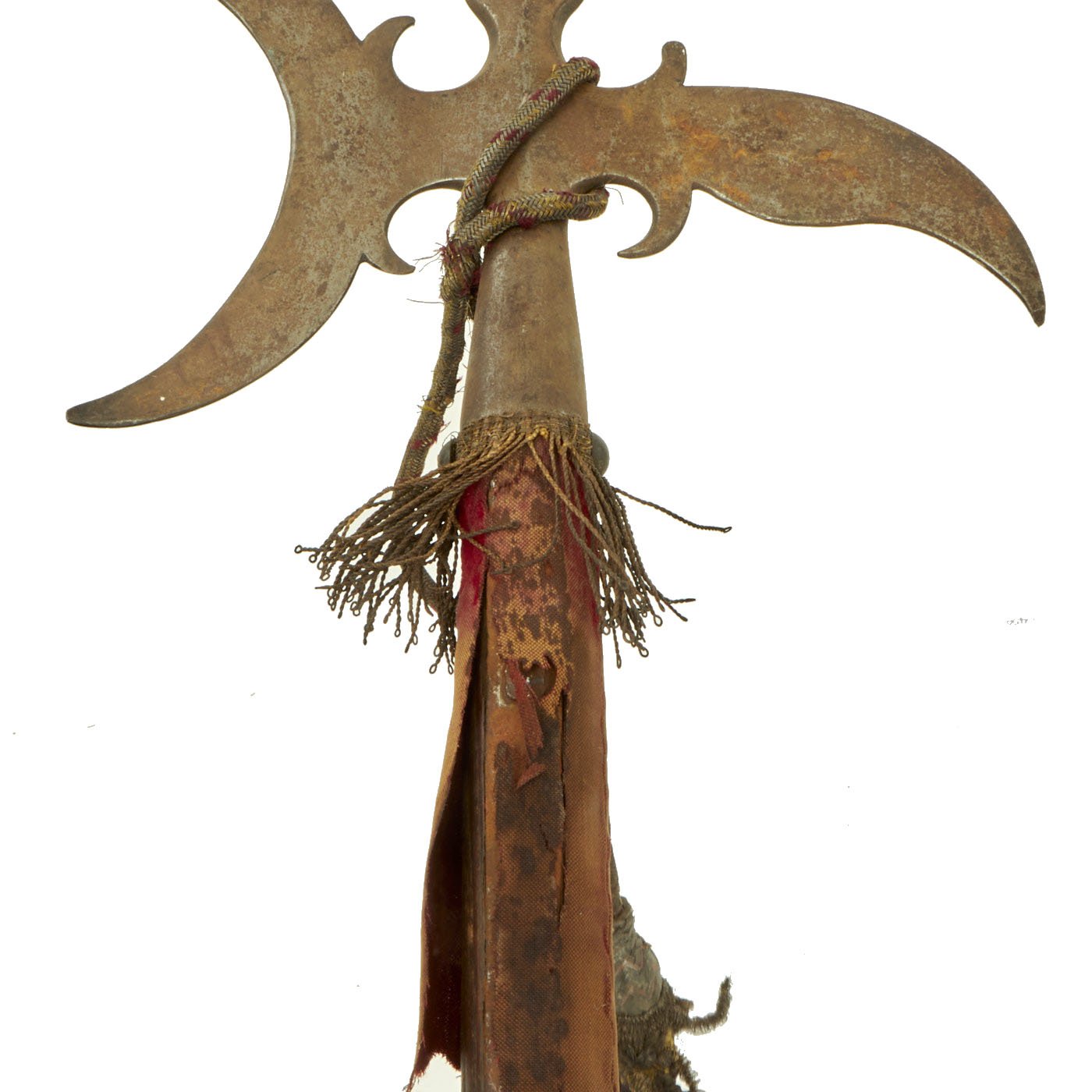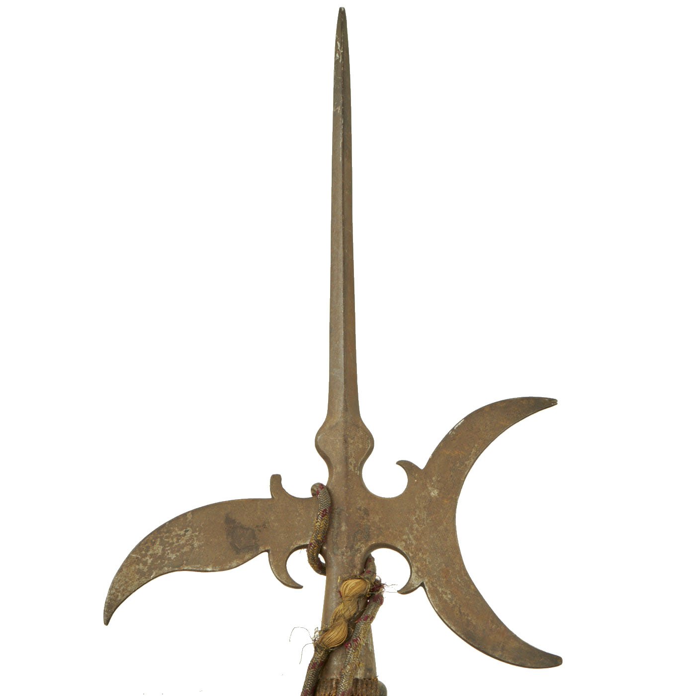 The spike alone is 12" long, the head including the Axe and support langets are a further 19" in length. The remainder is a round wooden haft, formerly adorned with either a wrapping or pennant near the top, which is now mostly gone. There is also a bullion cord with an end tassel present, which definitely is of great age. The bottom end of the haft has a metal spike fitting. These 1500-1630 Halberds are known for the extra long spike to the tops which were largely obsoleted by the English Civil War of 1640.
