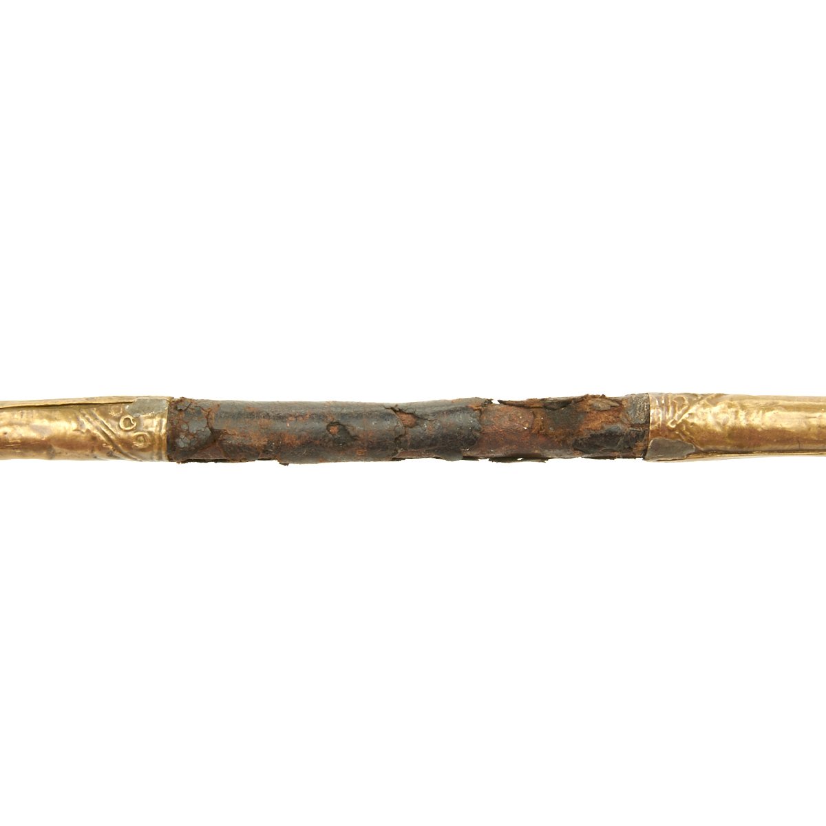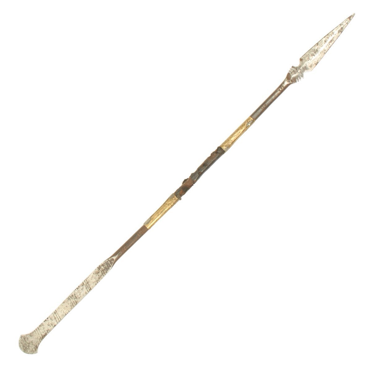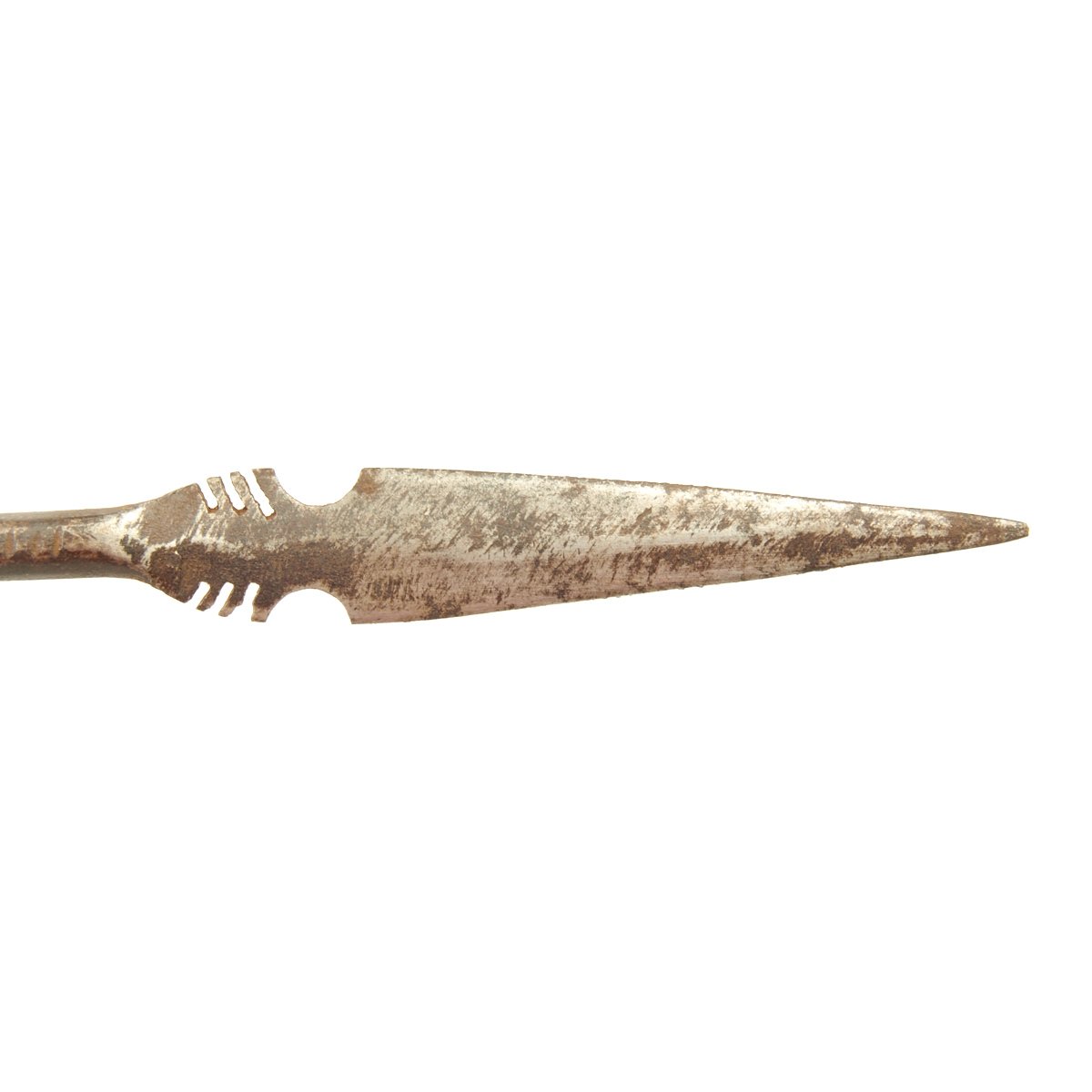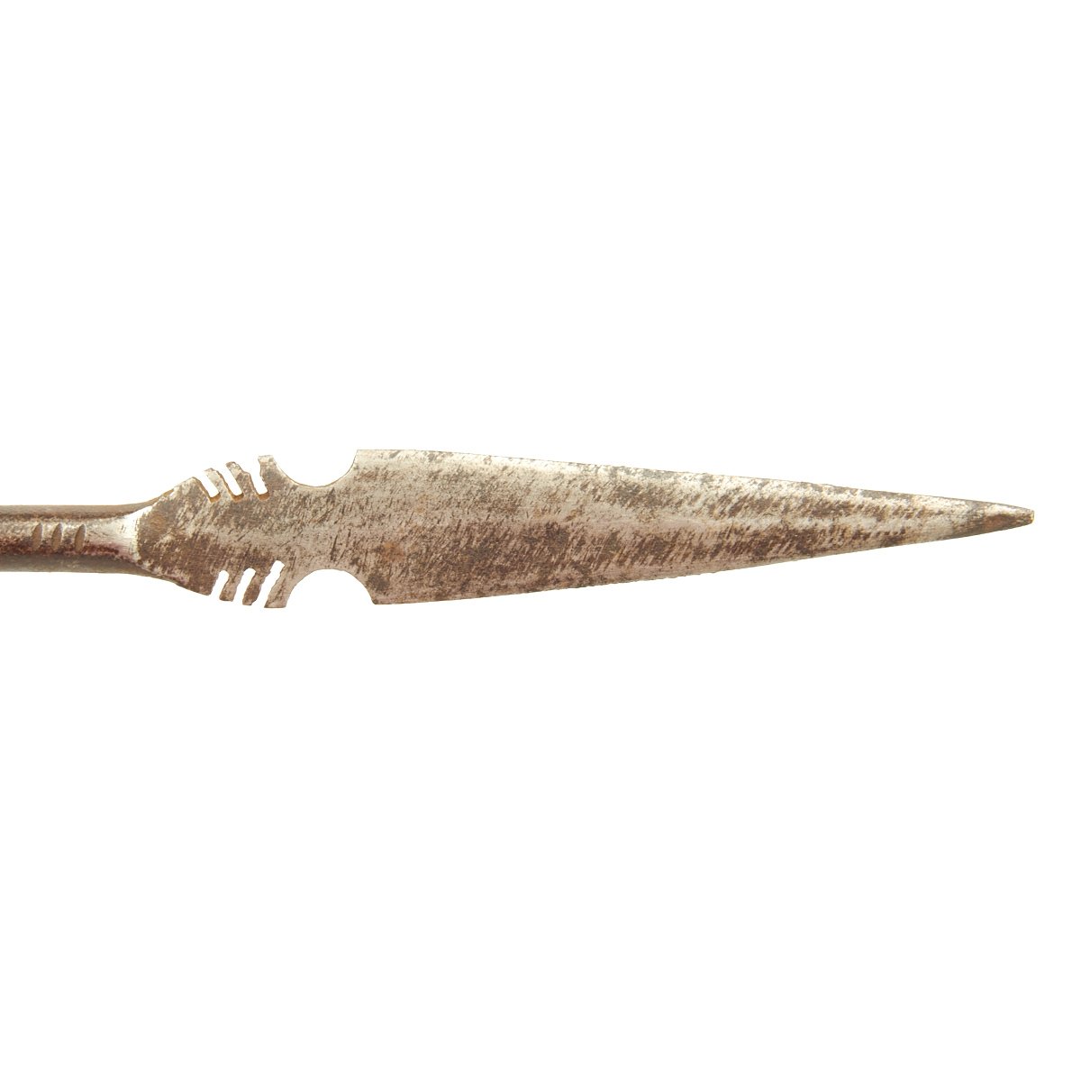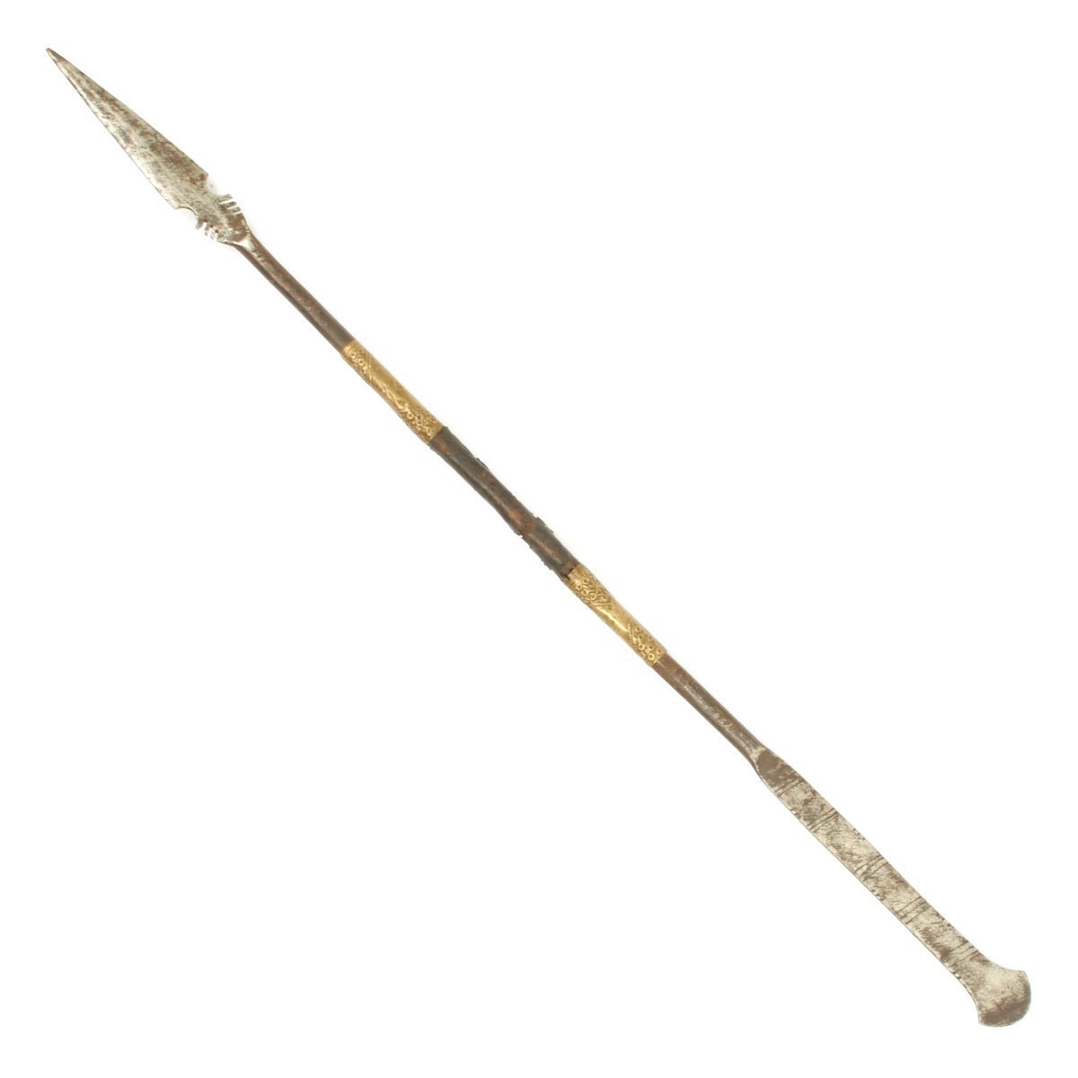 21" overall length with two decorated brass collars with leather bound grip in between. Wicked 4" head with barbs behind.