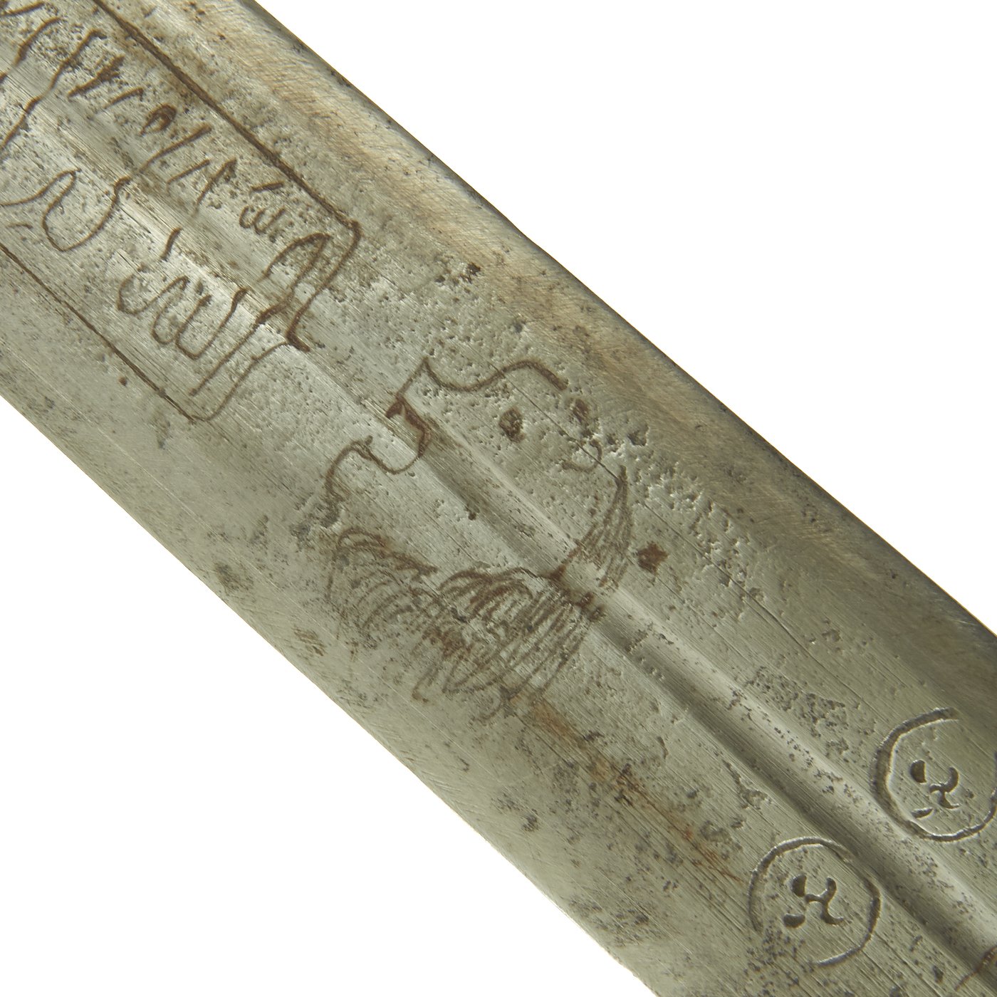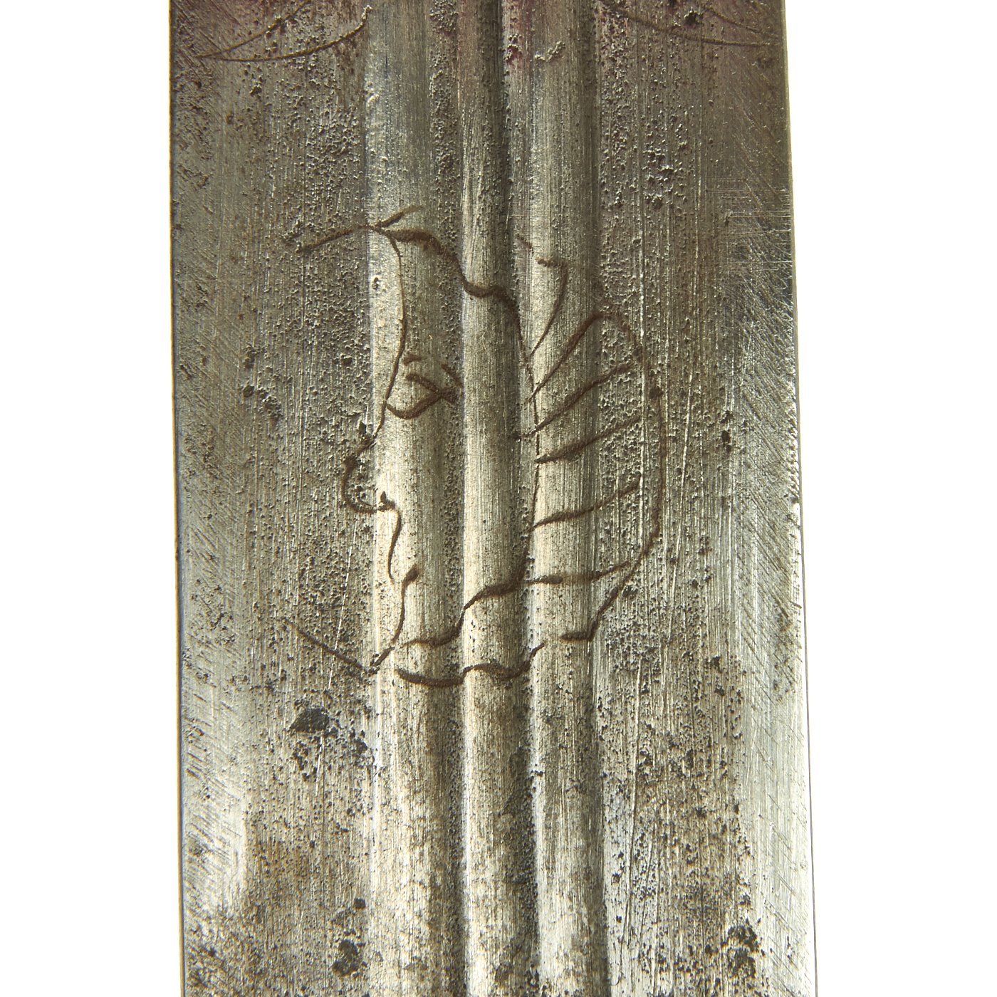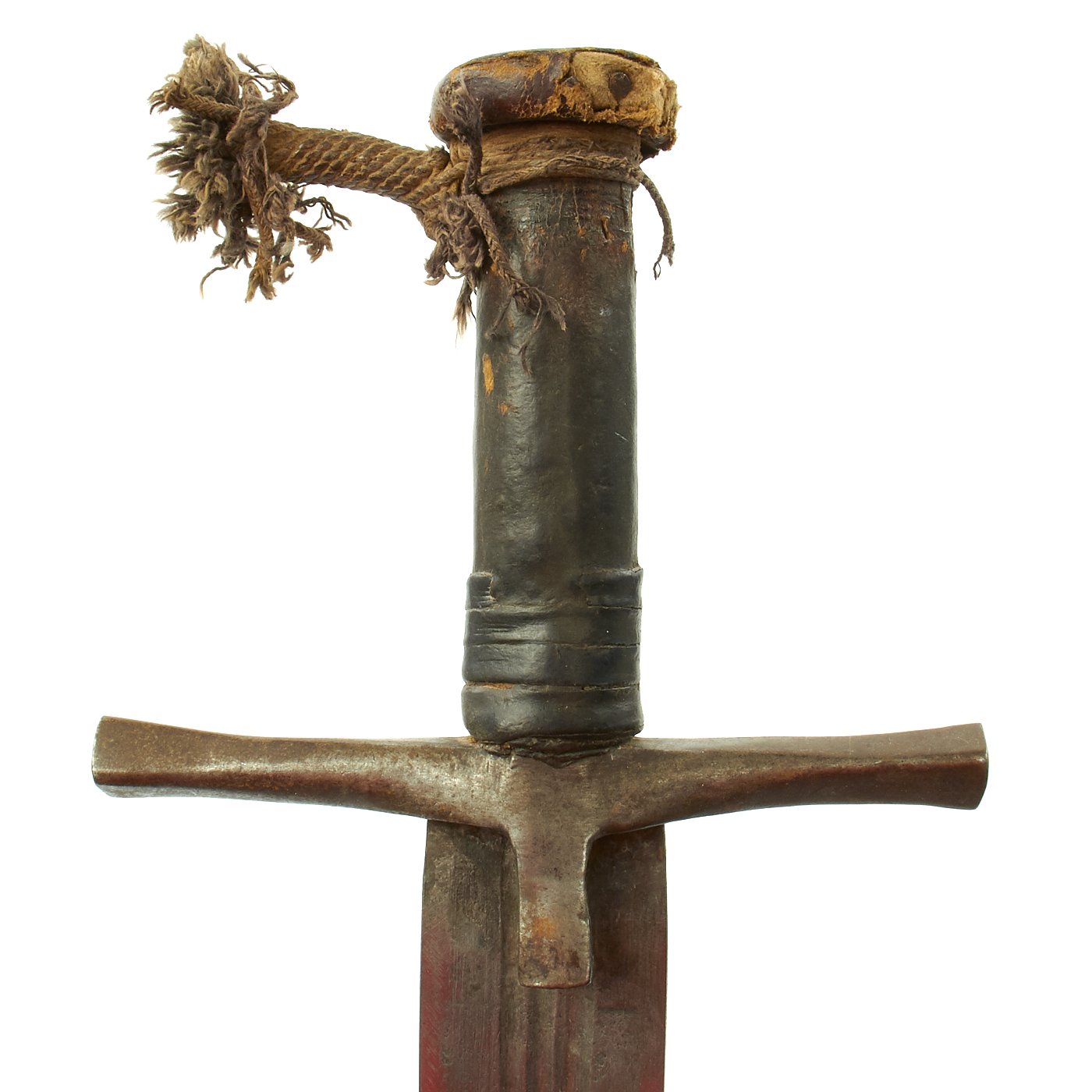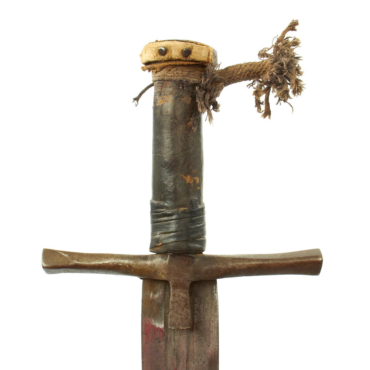 This particular example is, as they all were, based on the Crusader's massive Broad Swords of the 12th, 13th and 14th Centuries being of crucifix shape with huge broad double edged blades. This one has an overall length of 44" and a 39" X 1 3/4" blade. This is a classic Dervish Kaskara Broad Sword, a fine example, the blade which still shows the typical double Crescent Moon proof marks to either sides of the blade as well as other Islamic engravings. Comes with its original tooled brown leather scabbard complete with the remains of its leather body sling. The decoration on this example is quite ornate, and the drag and throat are made of engraved white metal, probably tin or aluminum