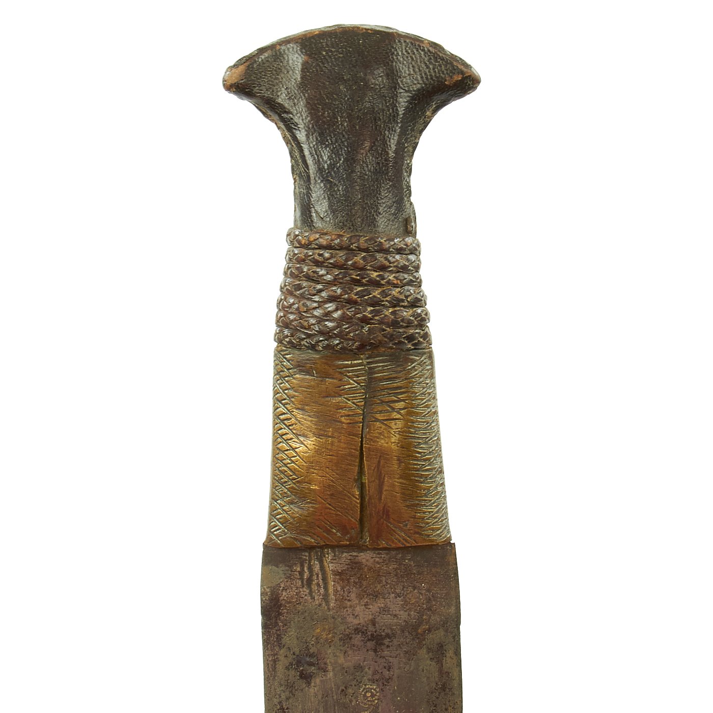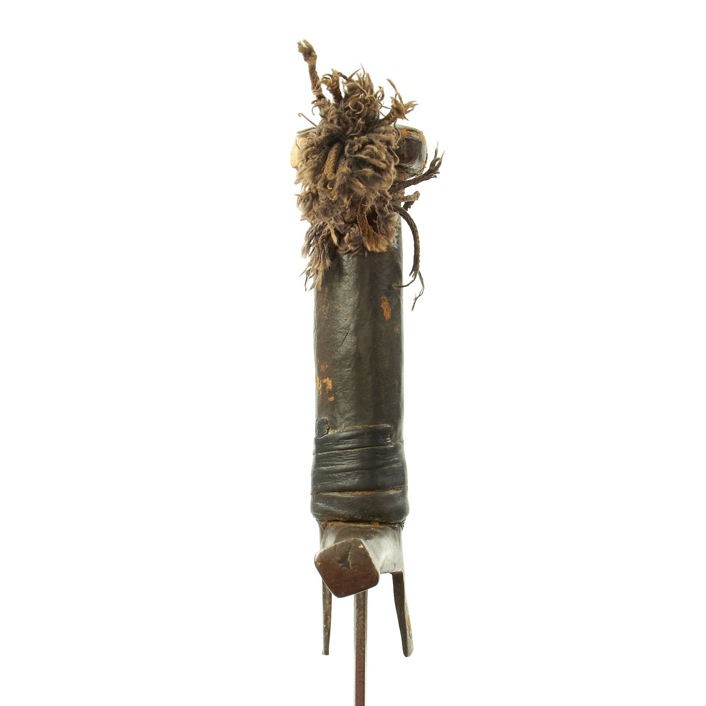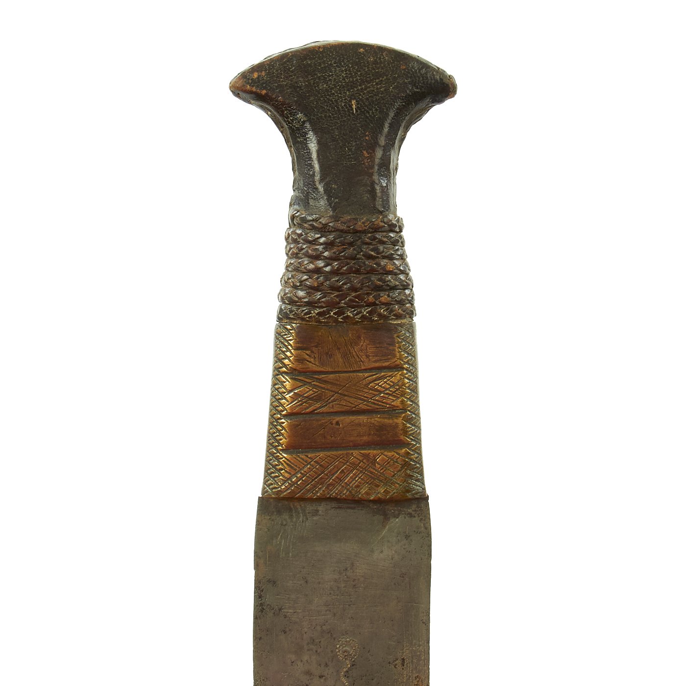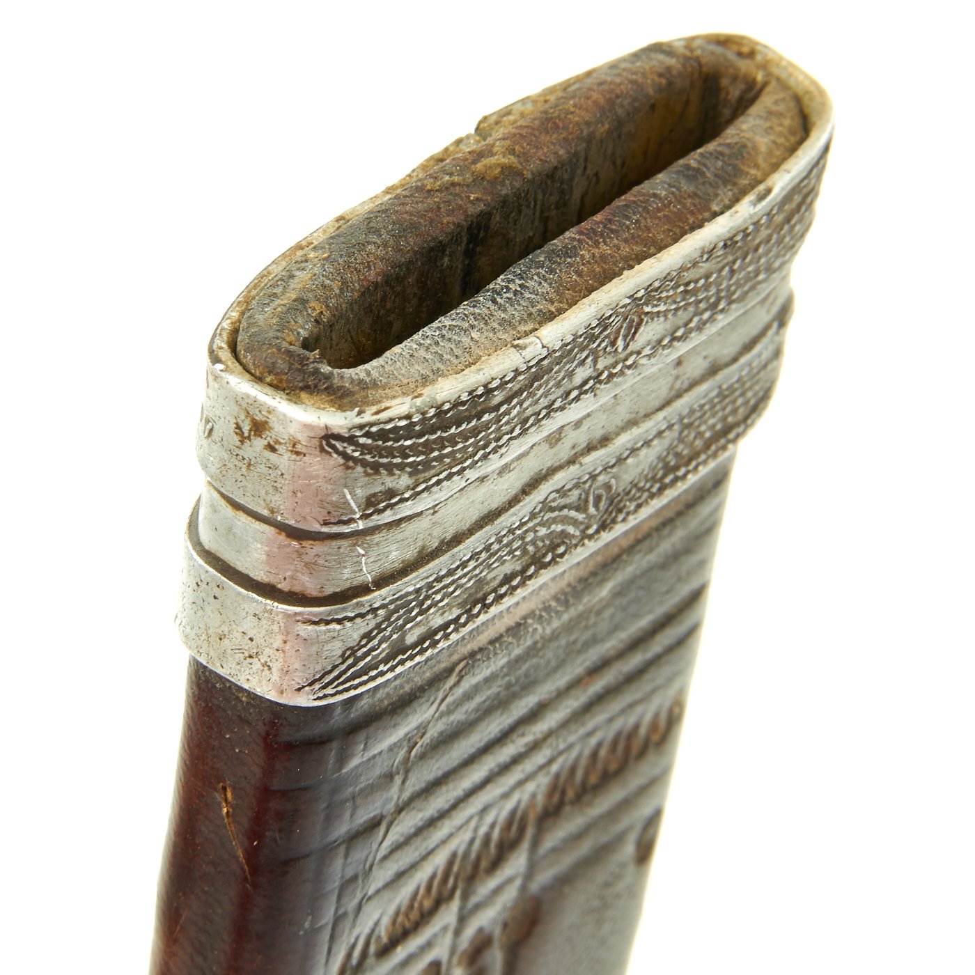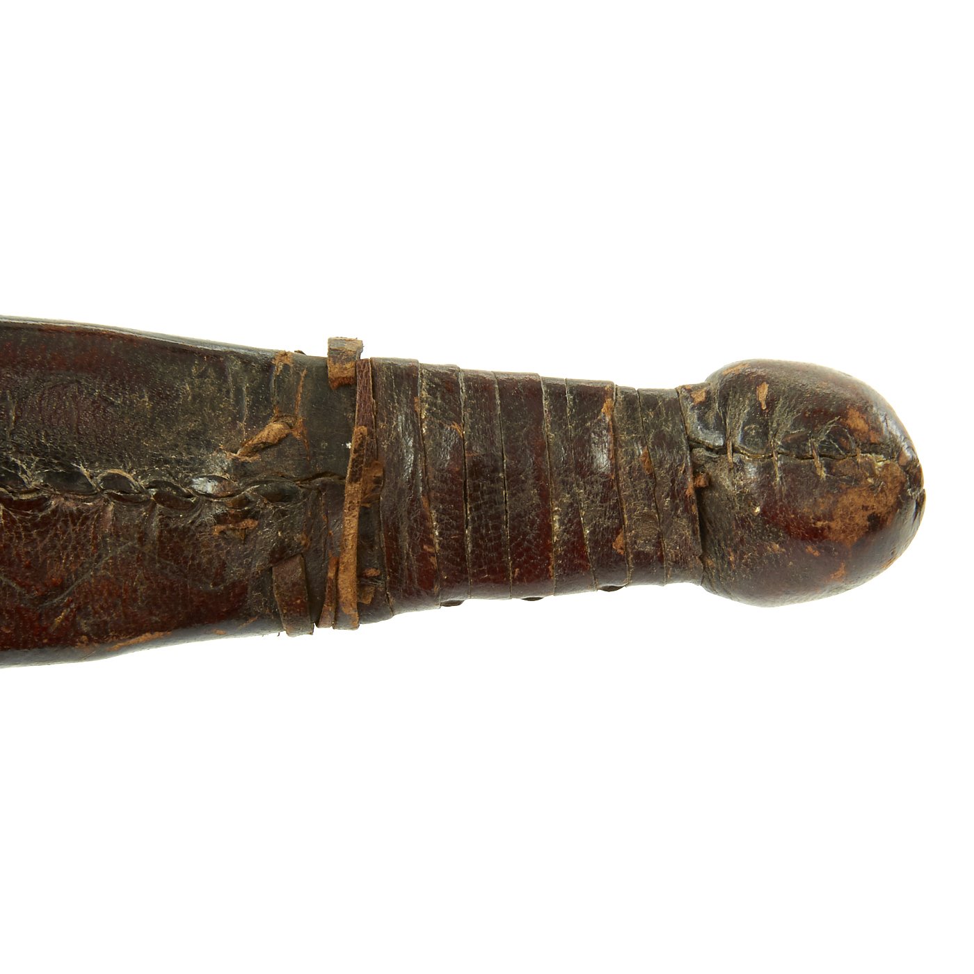 It is accompanied by a similarly decorated Belt Dagger in its tooled leather scabbard. The dagger is 15" overall, with a 10 1/2" leaf-shaped blade, which is fitted with a large brass ferrule, and plaited leather handle. There is some simple engraving on both sides of the blade. The scabbard is highly decorated, with both plaited and embossed leather.