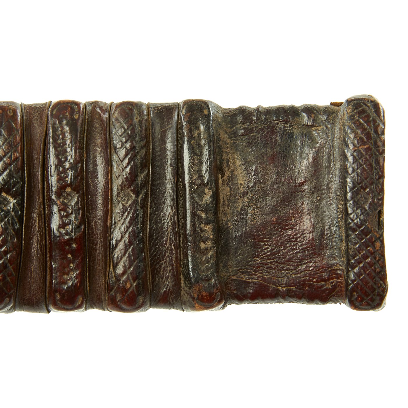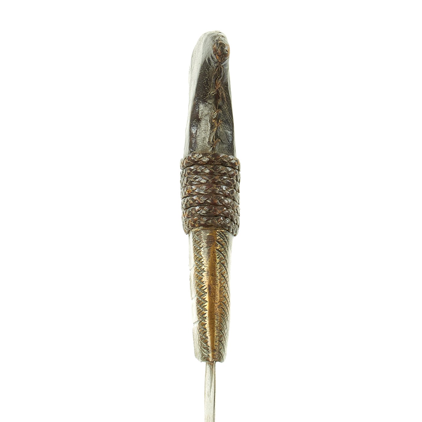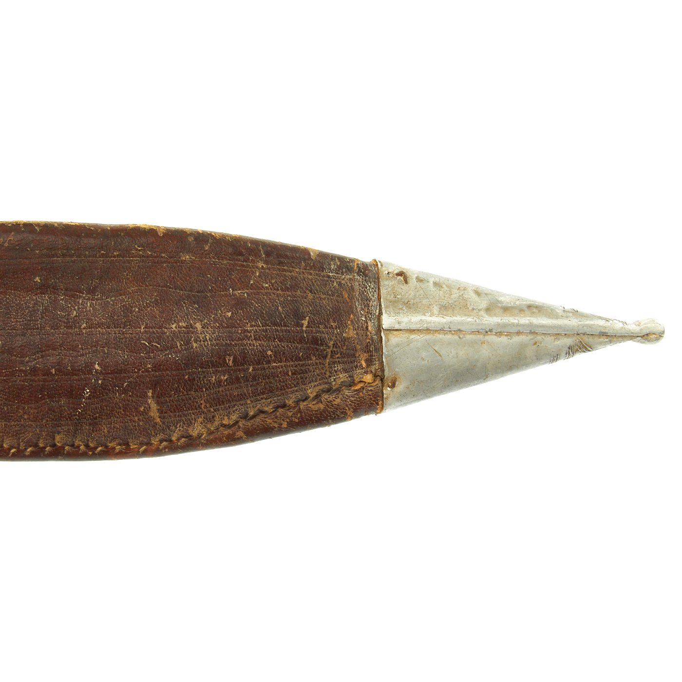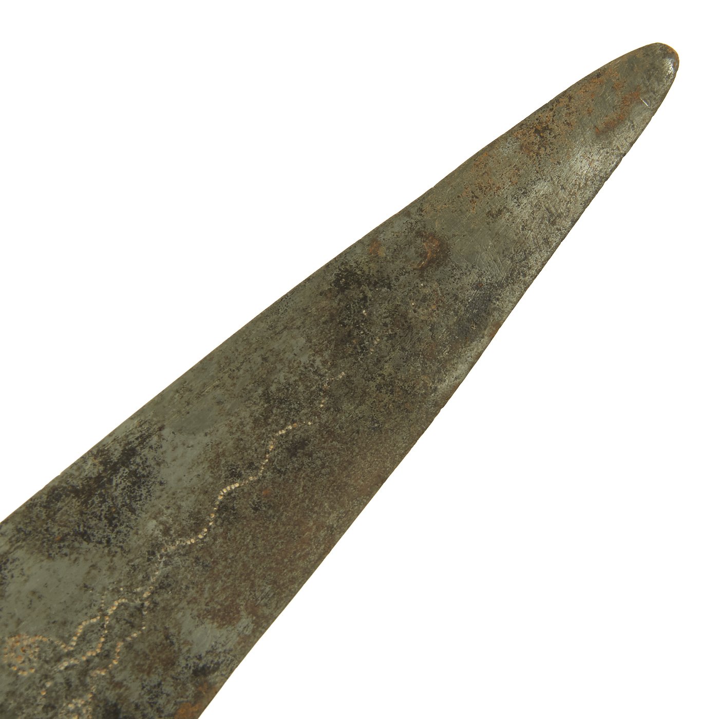 It is accompanied by a similarly decorated Belt Dagger in its tooled leather scabbard. The dagger is 15" overall, with a 10 1/2" leaf-shaped blade, which is fitted with a large brass ferrule, and plaited leather handle. There is some simple engraving on both sides of the blade. The scabbard is highly decorated, with both plaited and embossed leather.