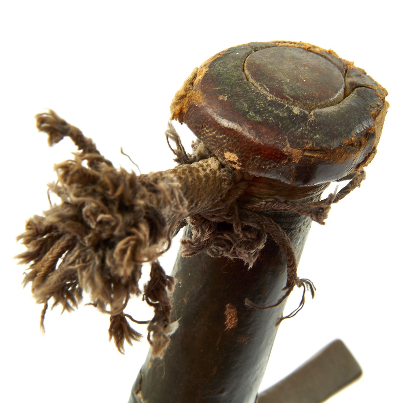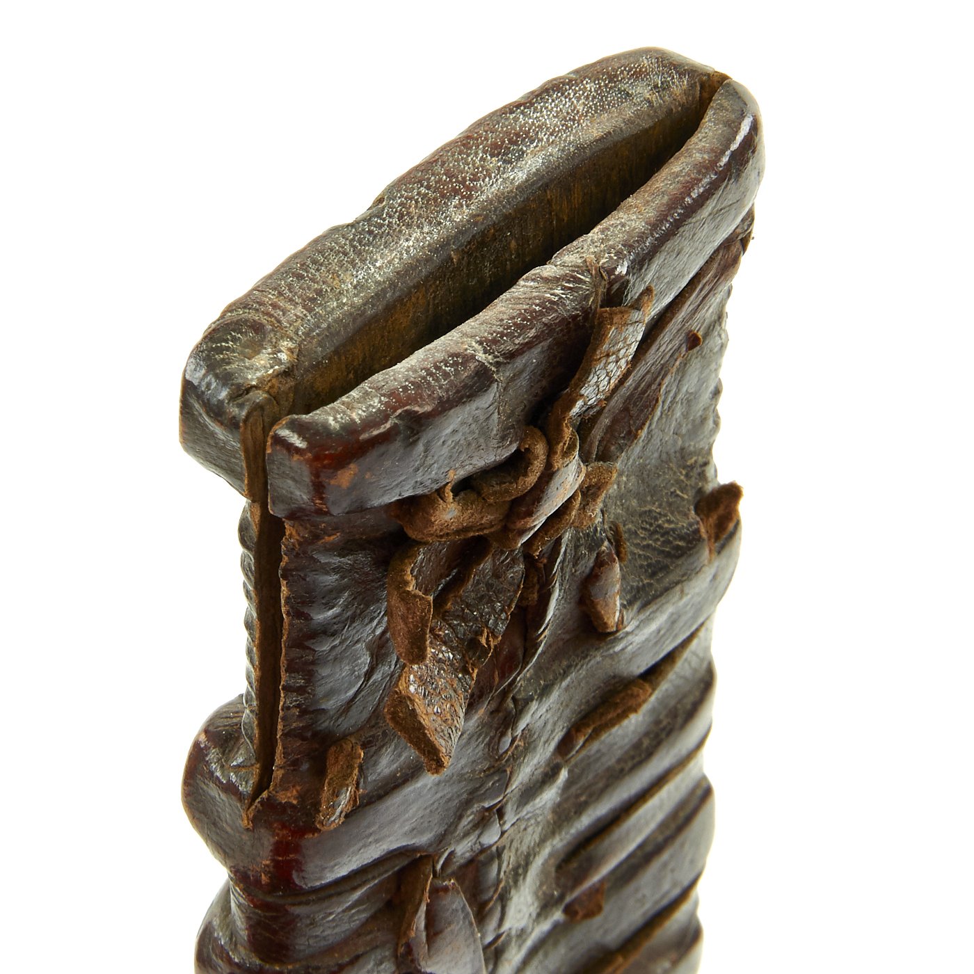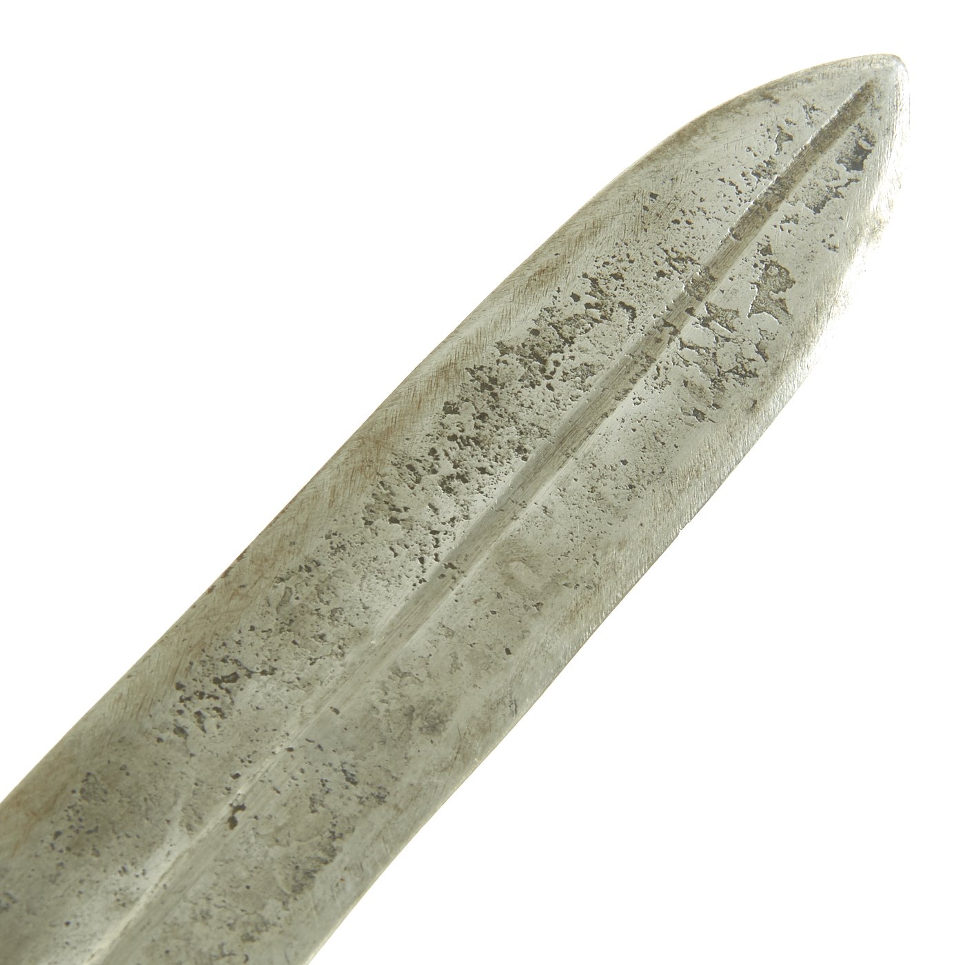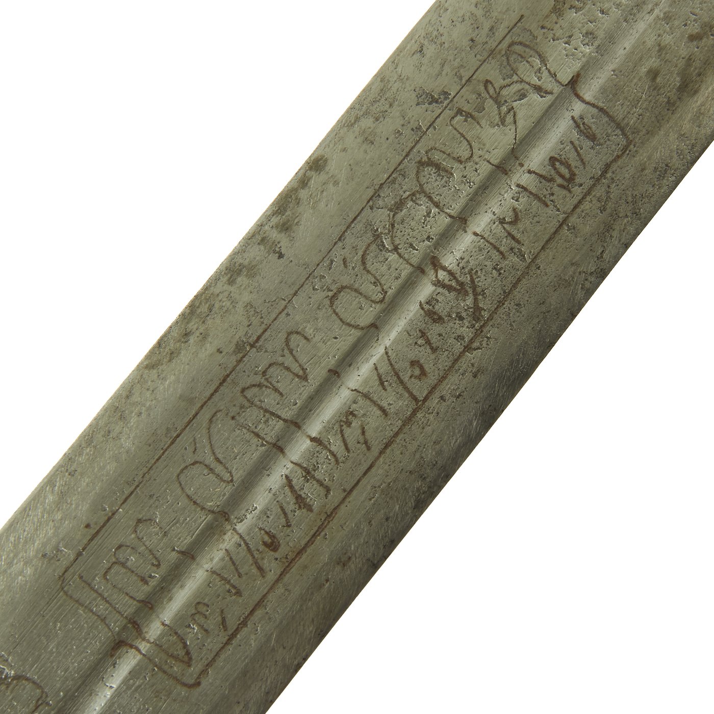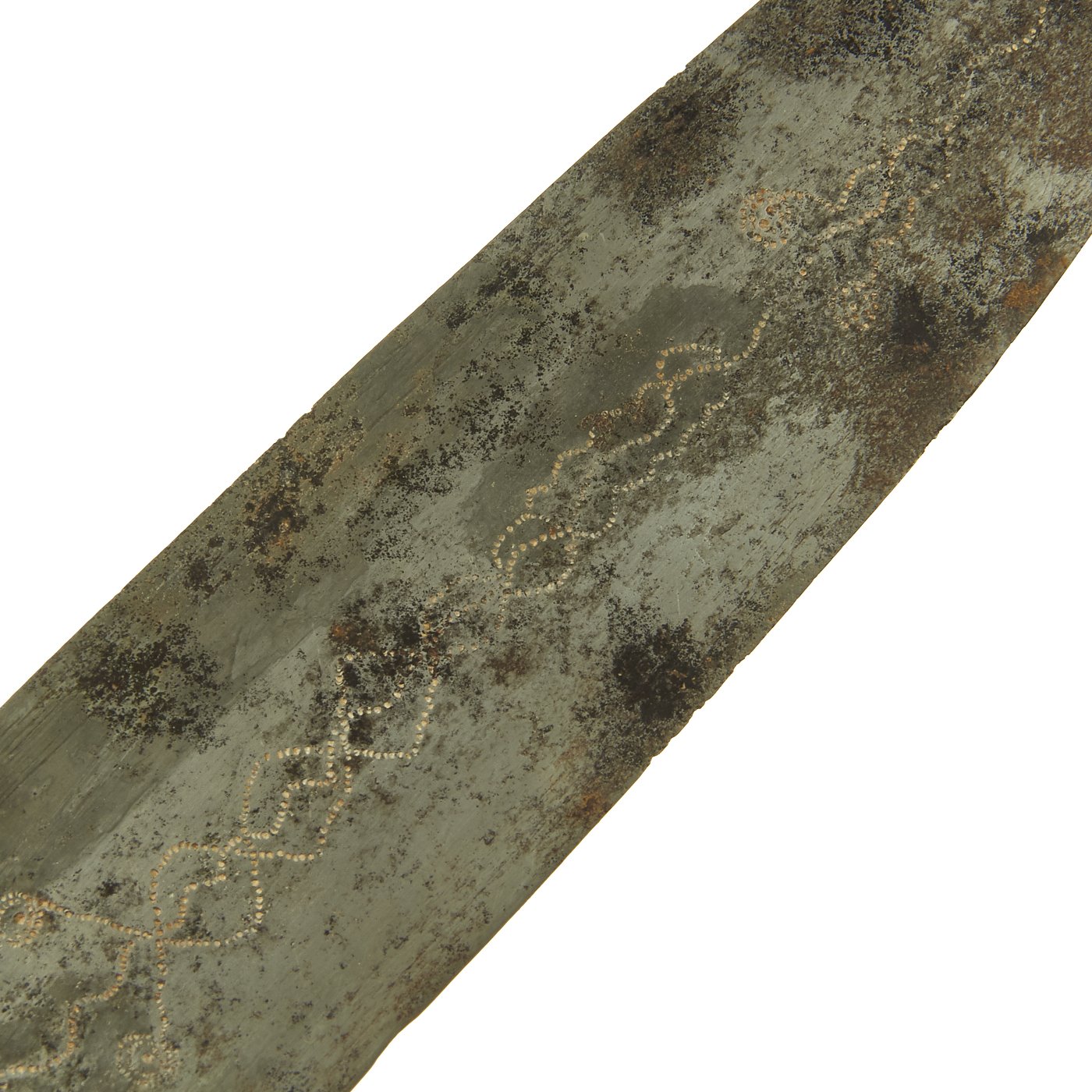 It is accompanied by a similarly decorated Belt Dagger in its tooled leather scabbard. The dagger is 15" overall, with a 10 1/2" leaf-shaped blade, which is fitted with a large brass ferrule, and plaited leather handle. There is some simple engraving on both sides of the blade. The scabbard is highly decorated, with both plaited and embossed leather.