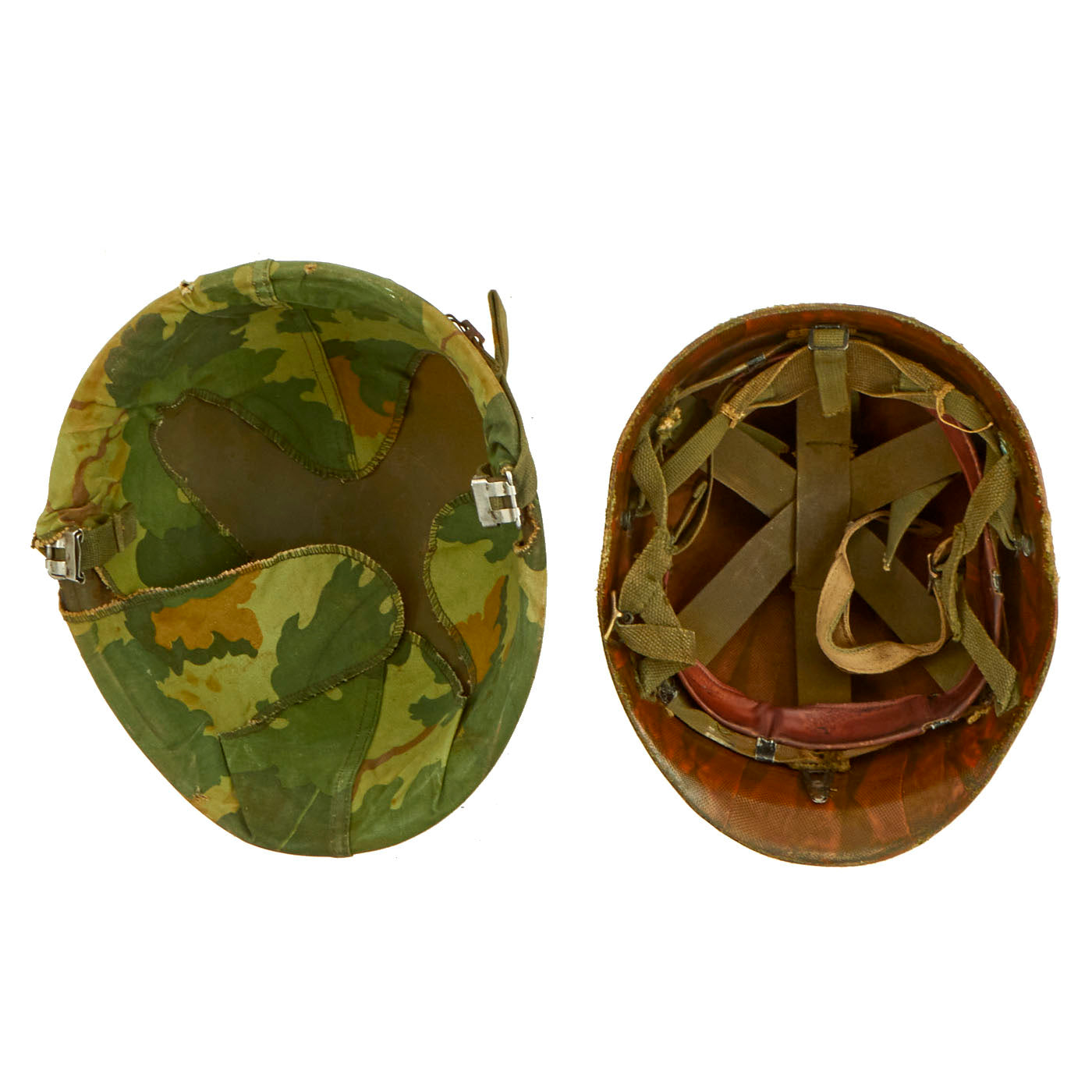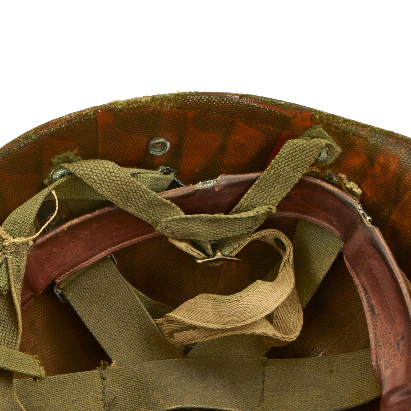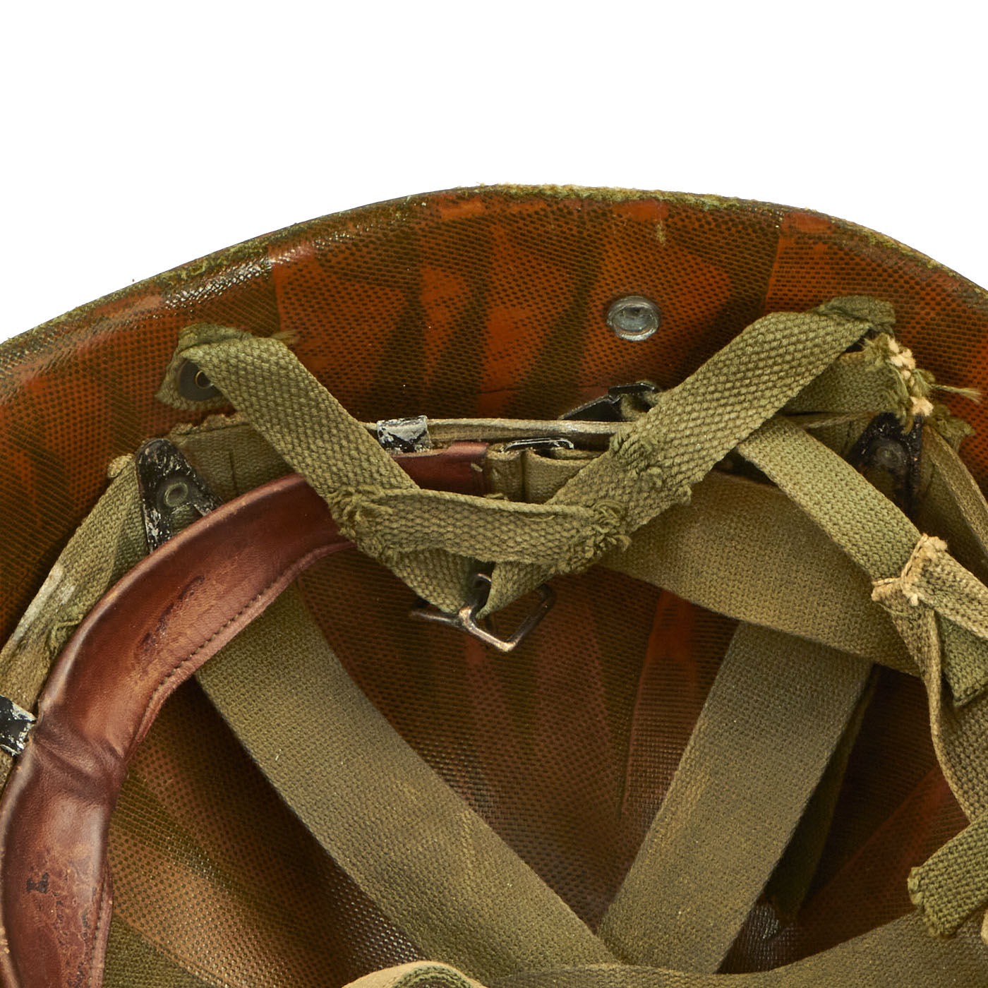 The helmet liner is in mint condition, and has the original stamping on the webbing still visible, showing a clear 1967 date. The chin straps are both intact, with the main helmet chinstrap having the extensions with snaps on the end, which secure the liner to the shell for paratrooper use. Nape Strap and Sweatband also exhibit DSA codes and vietnam dates as well. The foliage band is the correct Vietnam issue variety, that is devoid of the commonly encountered postwar “cat eyes”, and clearly marked “Band, Helmet, Camouflage, US”.