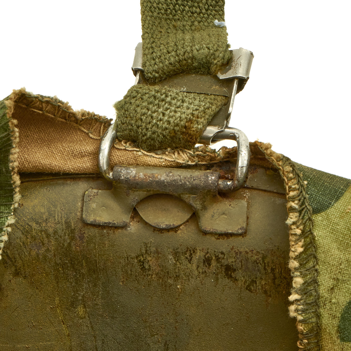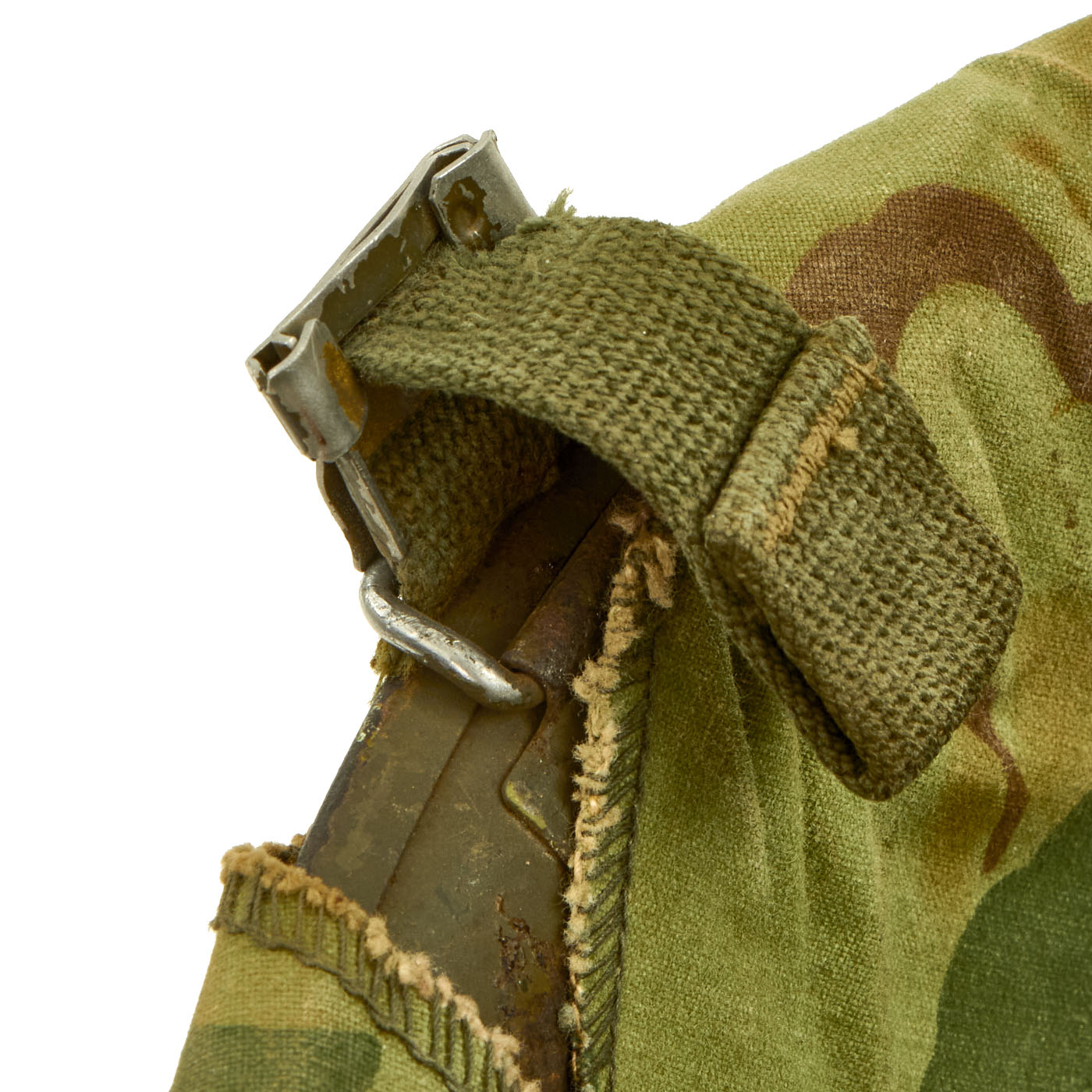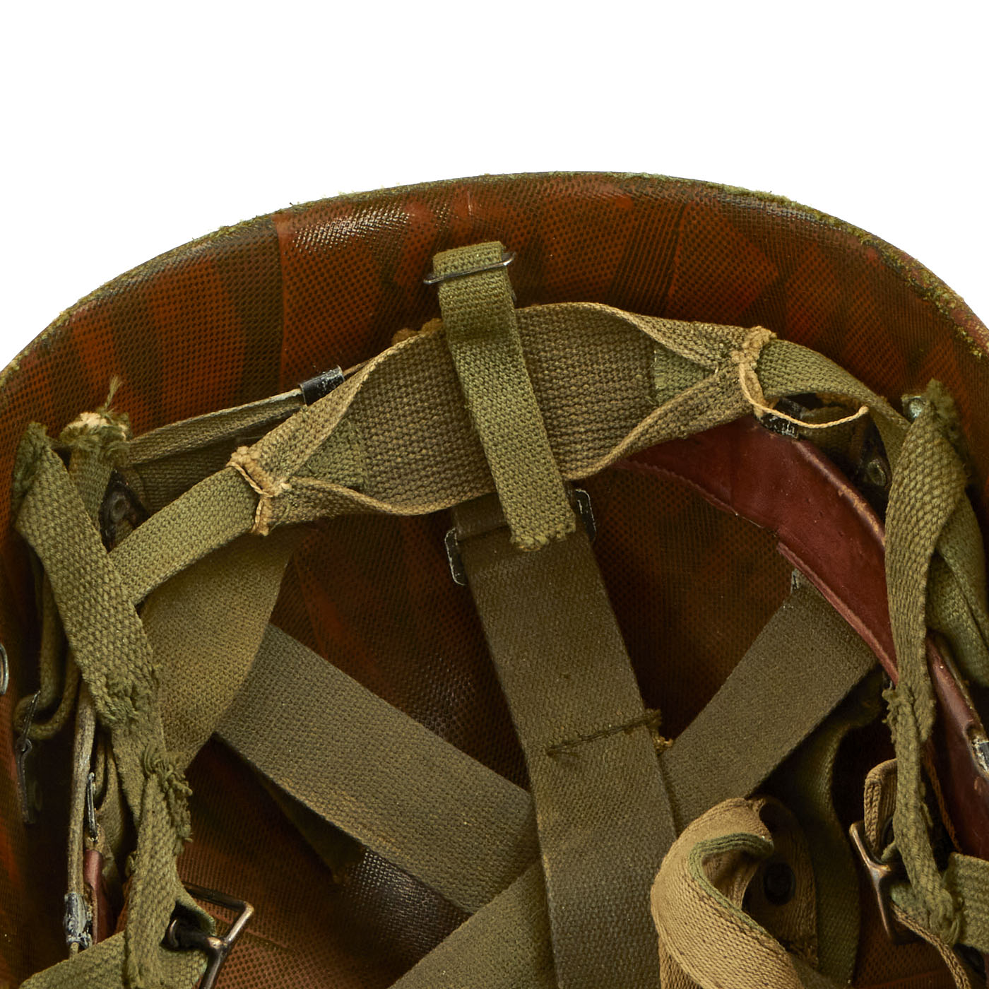 The helmet liner is in mint condition, and has the original stamping on the webbing still visible, showing a clear 1967 date. The chin straps are both intact, with the main helmet chinstrap having the extensions with snaps on the end, which secure the liner to the shell for paratrooper use. Nape Strap and Sweatband also exhibit DSA codes and vietnam dates as well. The foliage band is the correct Vietnam issue variety, that is devoid of the commonly encountered postwar “cat eyes”, and clearly marked “Band, Helmet, Camouflage, US”.
