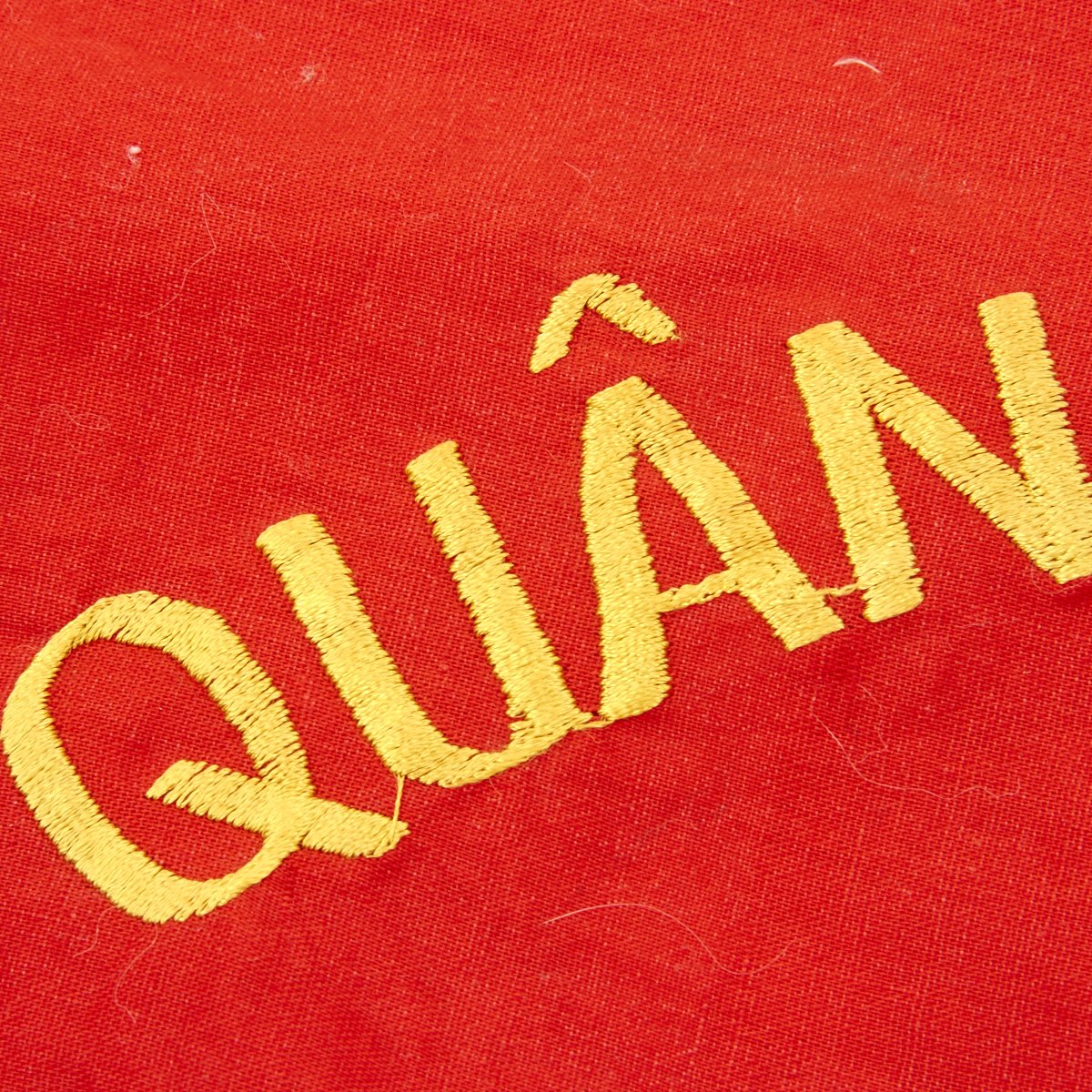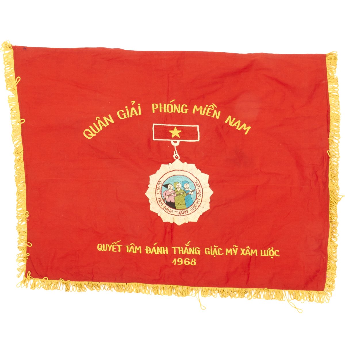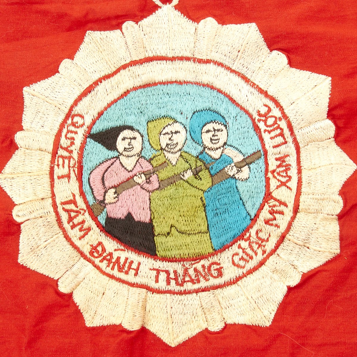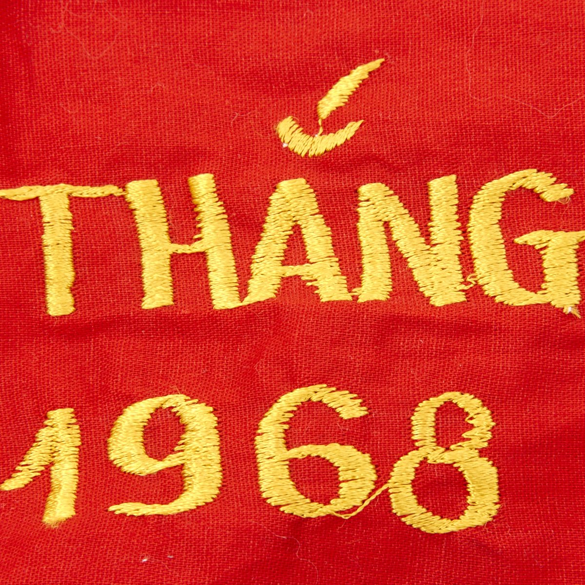 Original Item: Only One Available. This is an incredibly rare original Viet Cong flag. This flag was made during the early stages of the Vietnam War urge the victory of the North Vietnamese Army over the "American Invaders". Flags of this style were all hand made in different regions but patterned after the same general design, which is why you won't find two that are made identically with consistent dimensions.This embroidered flag reads as follows: