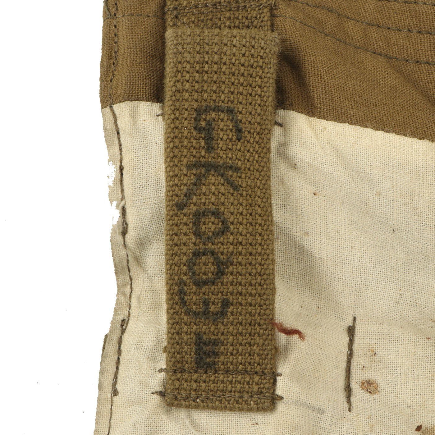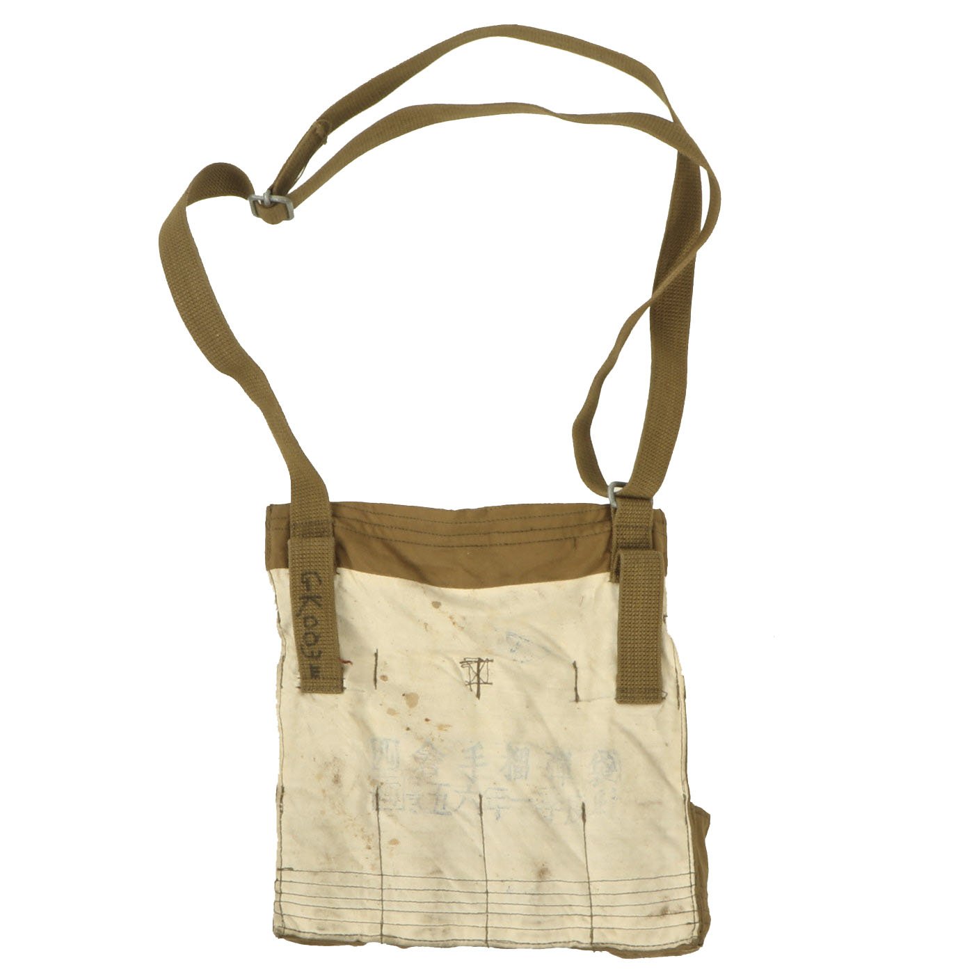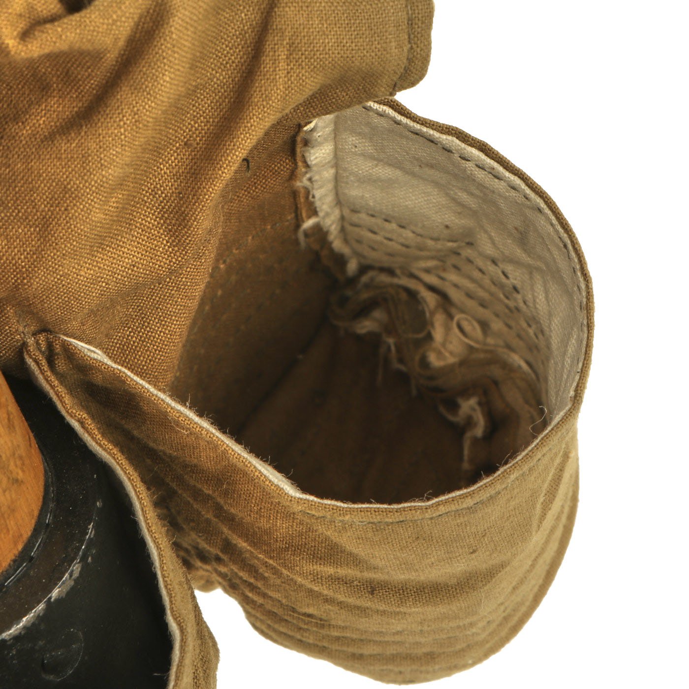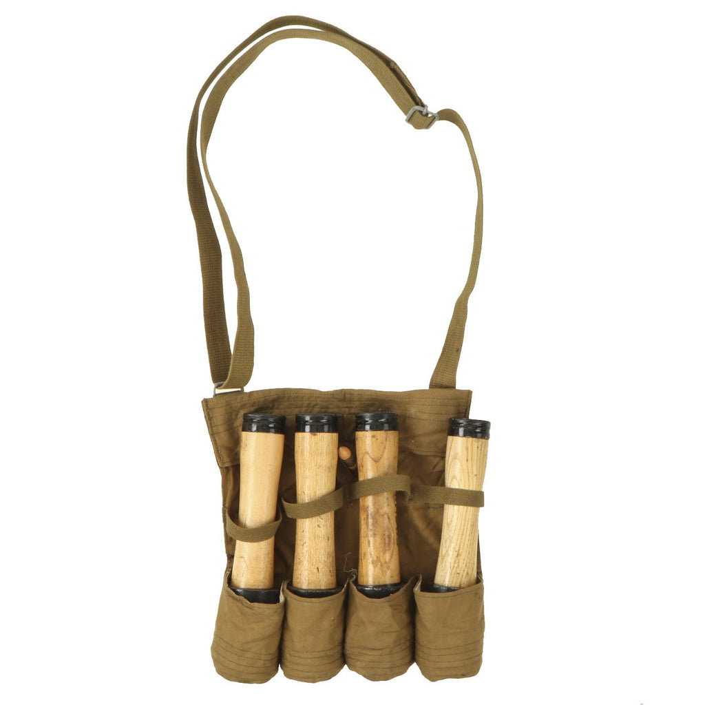 The four grenades come complete an original Chinese four pocket grenade carrier. Unlike the Vietnamese made carriers, these have a "cover" for the end of the grenades, held in place by a dowel & loop closure. There are also faint Chinese markings on the back of the carrier as well.