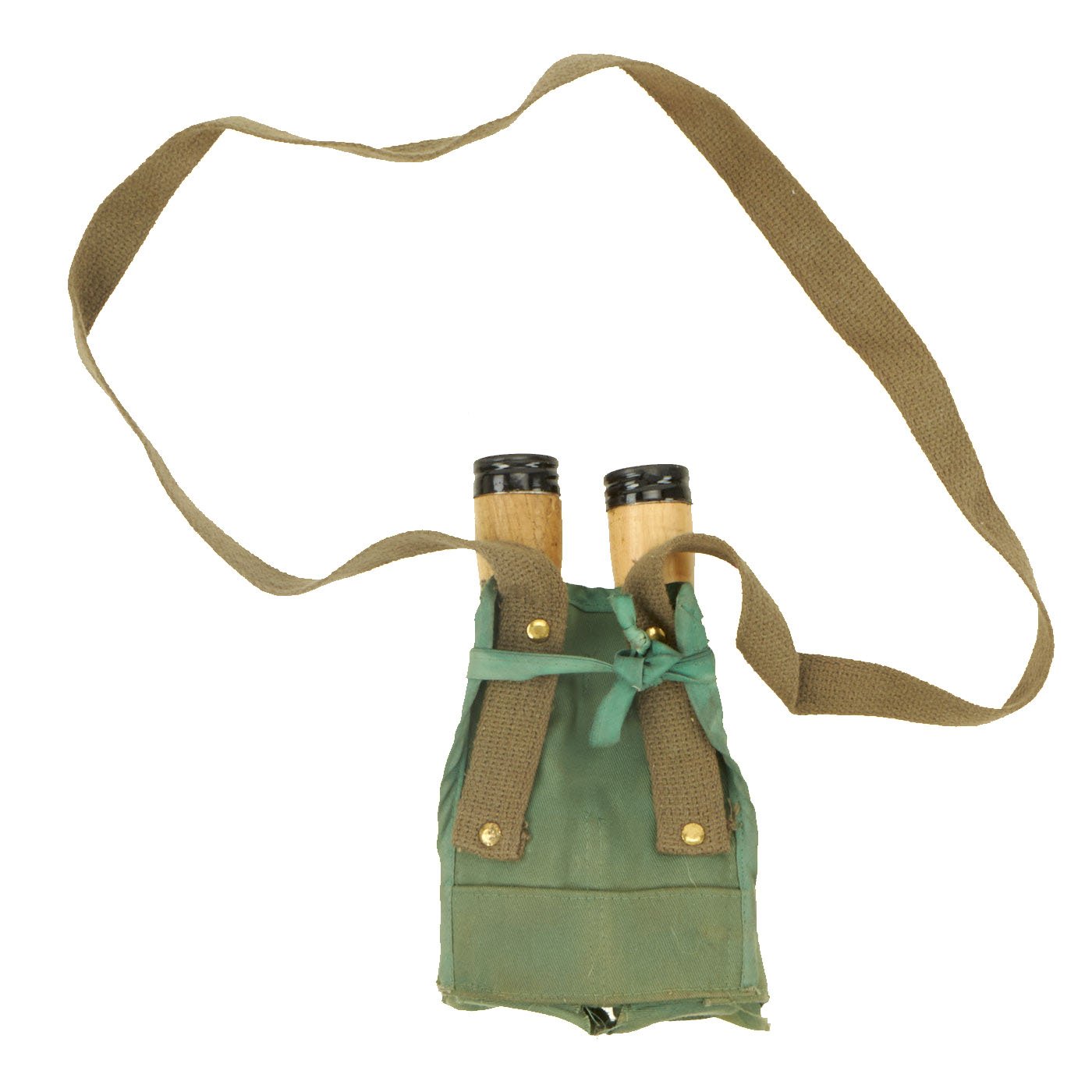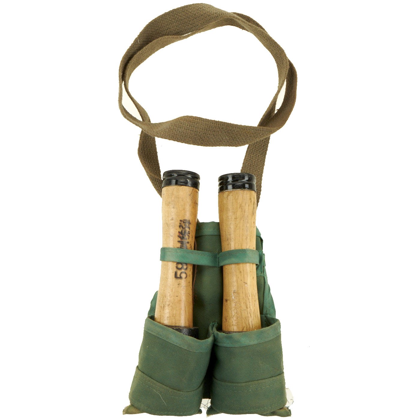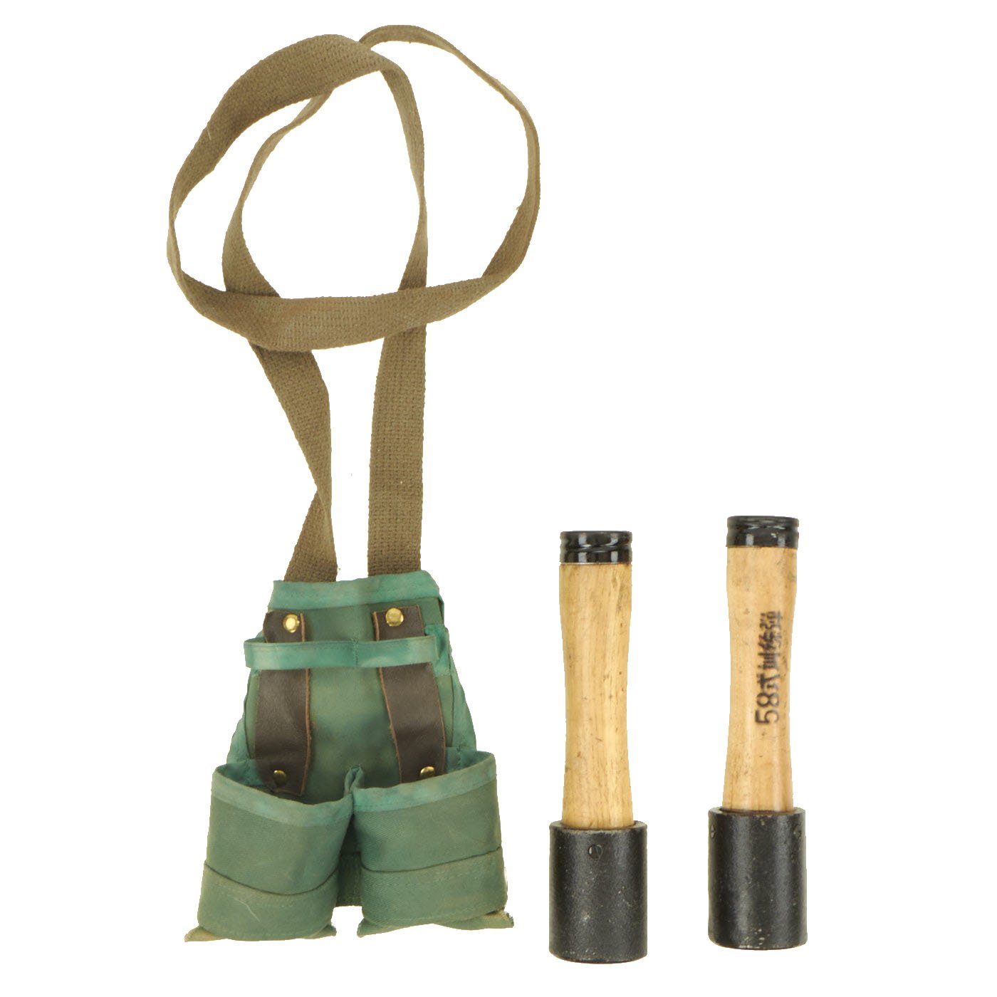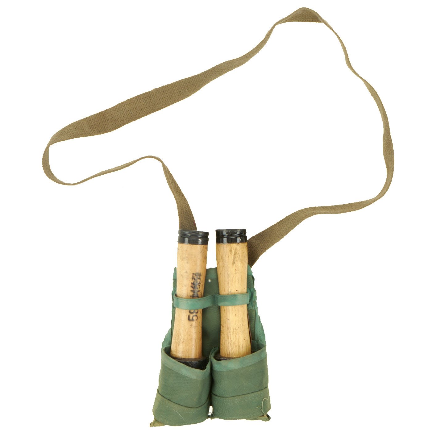 The two grenades come complete an original two pocket grenade carrier, which is unmarked, so it could be either a Chinese made carrier, or Vietnamese. It seems to be higher quality than usually seen on the Vietnamese made examples, and has the loops usually seen on Chinese examples, as opposed to cloth ties on the Vietnamese made types.
