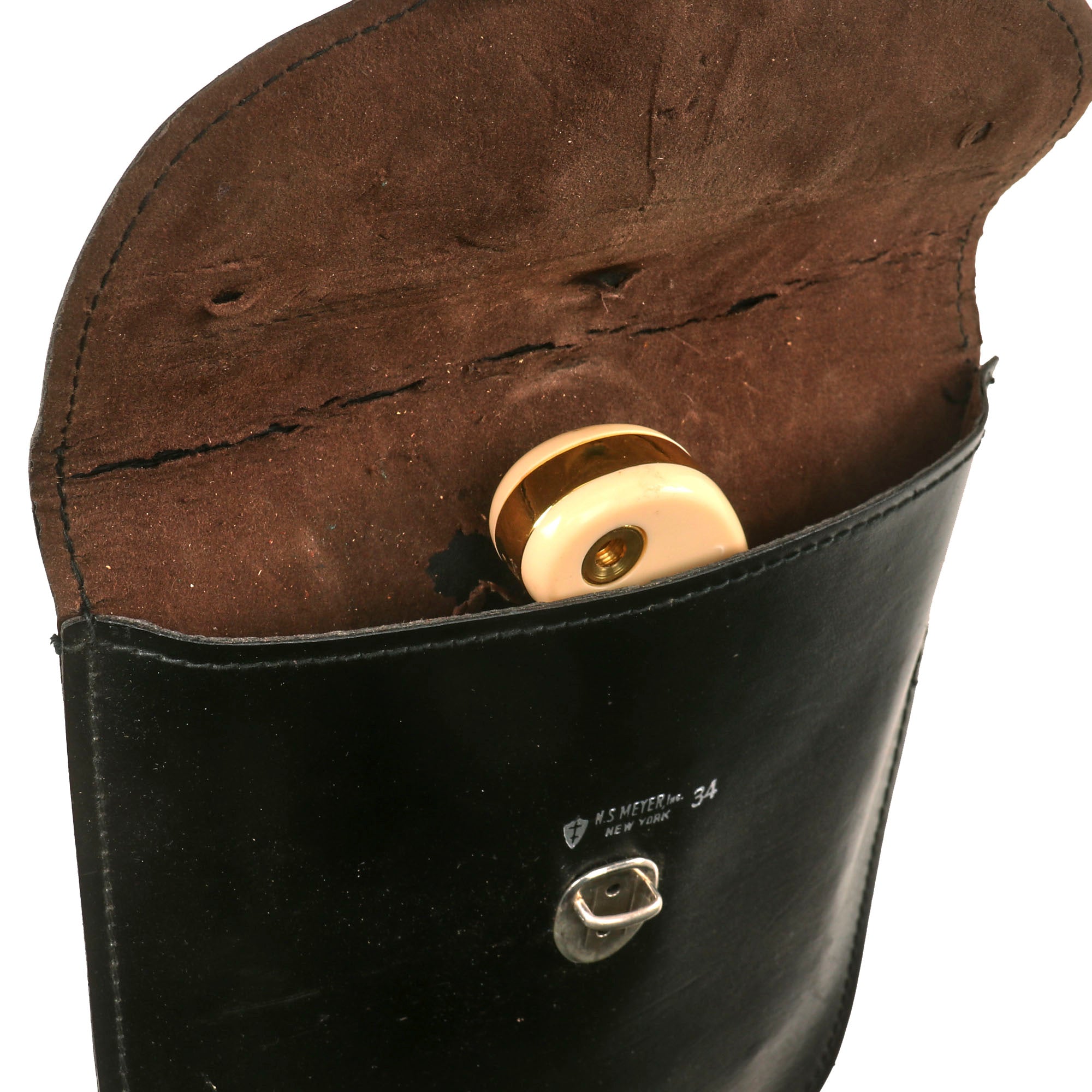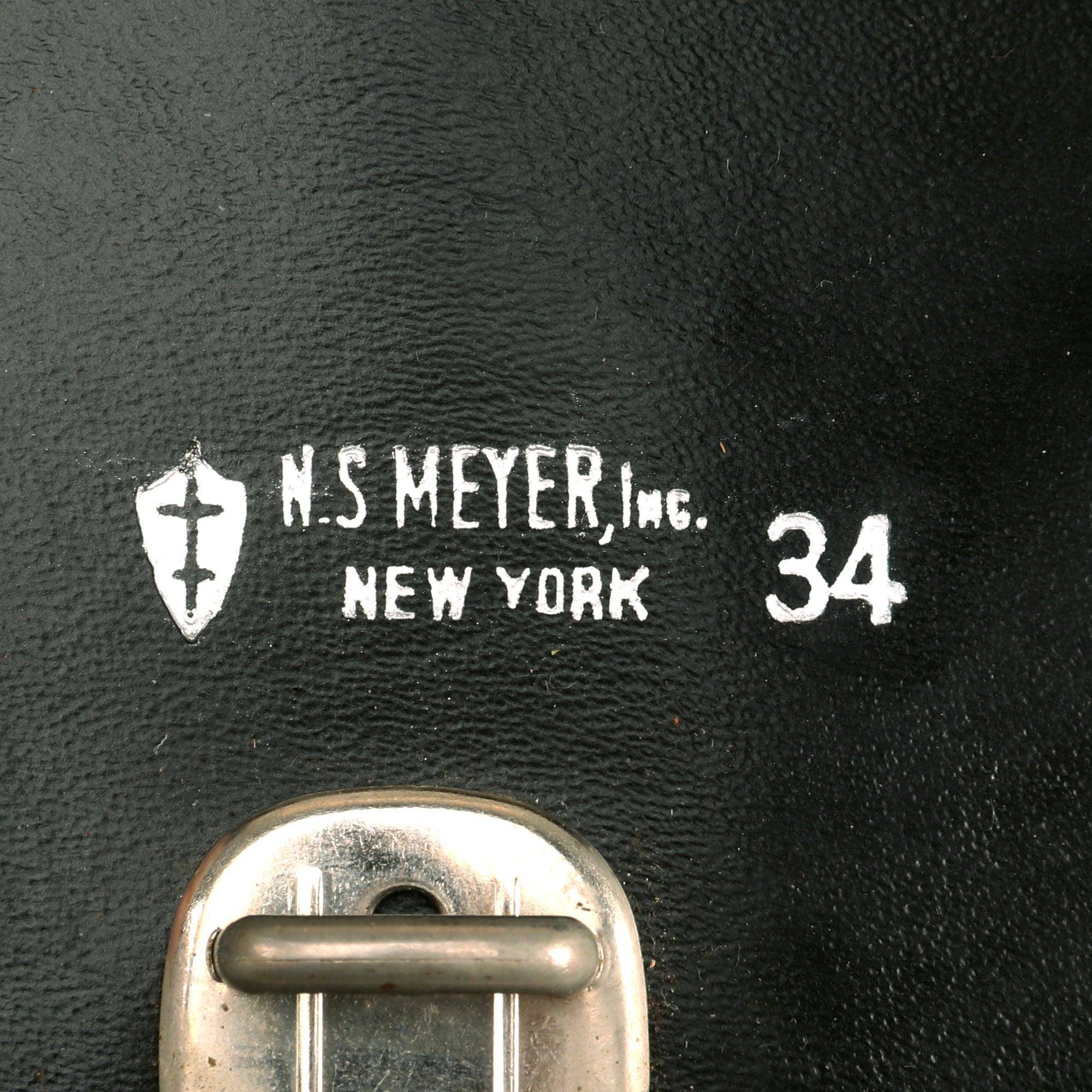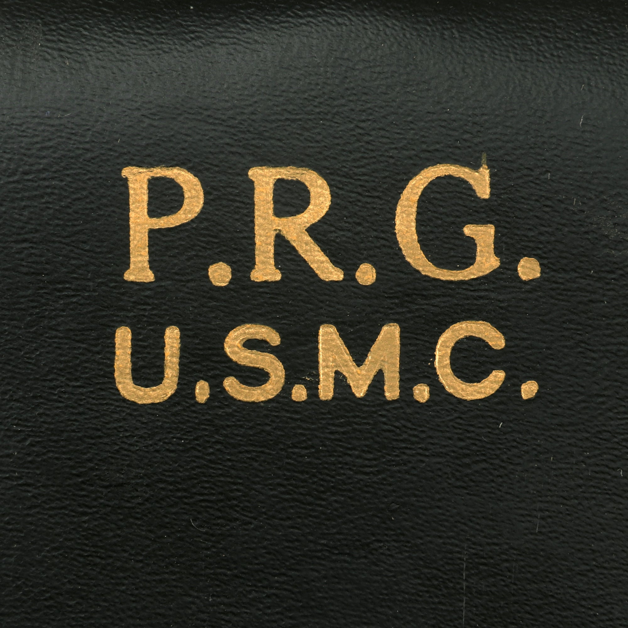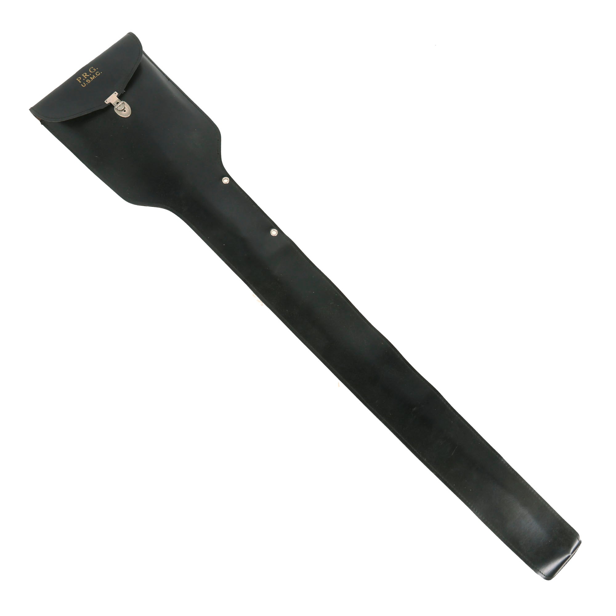 The leather case is marked P.R.G. / U.S.M.C. and is maker-marked under the flap to N.S. MEYER INC. / NEW YORK / 34. It is leather lined but the leather is wearing a bit. A great addition to an already-great sword!