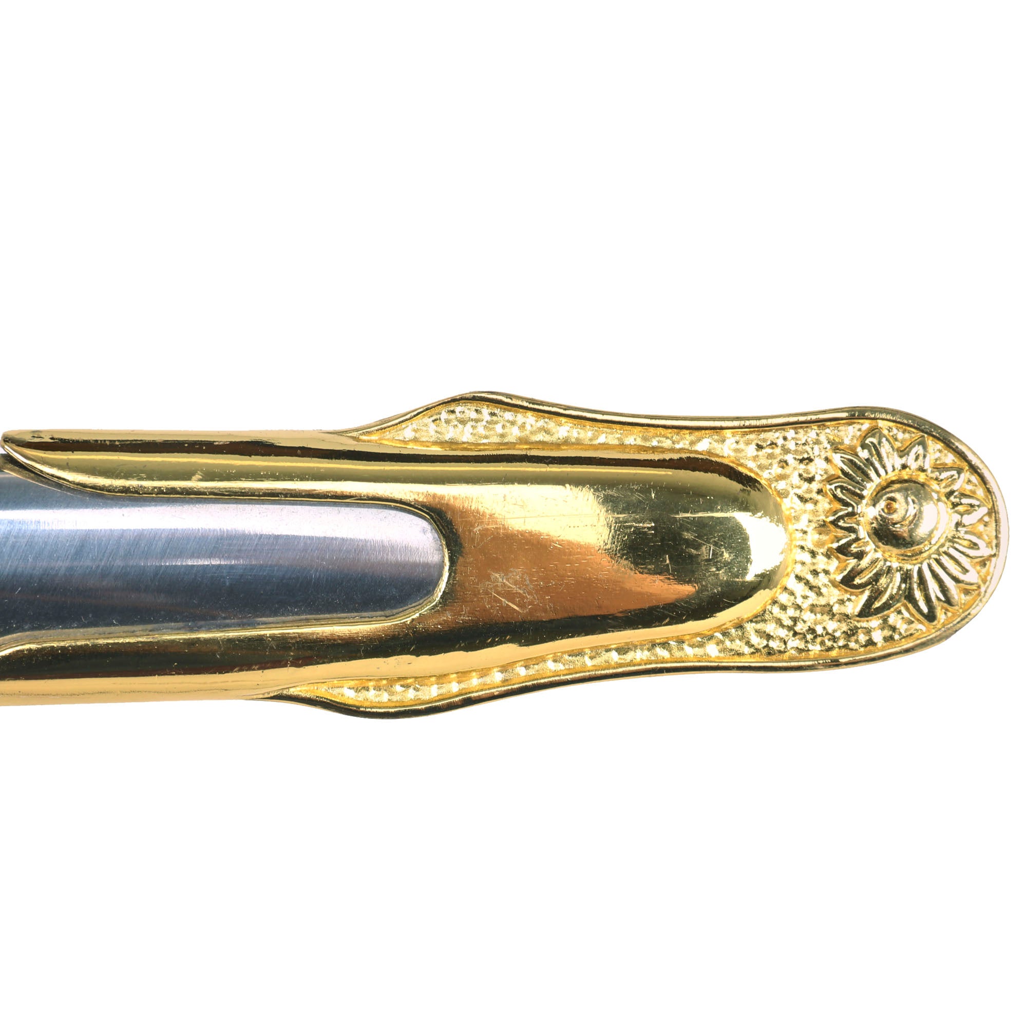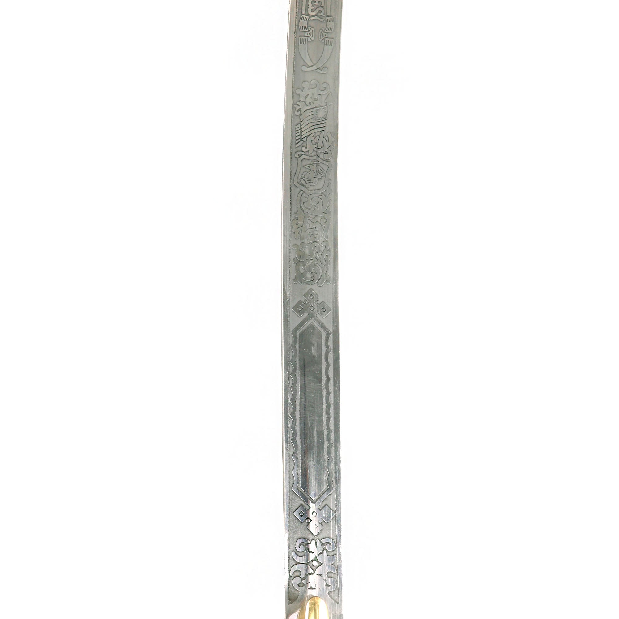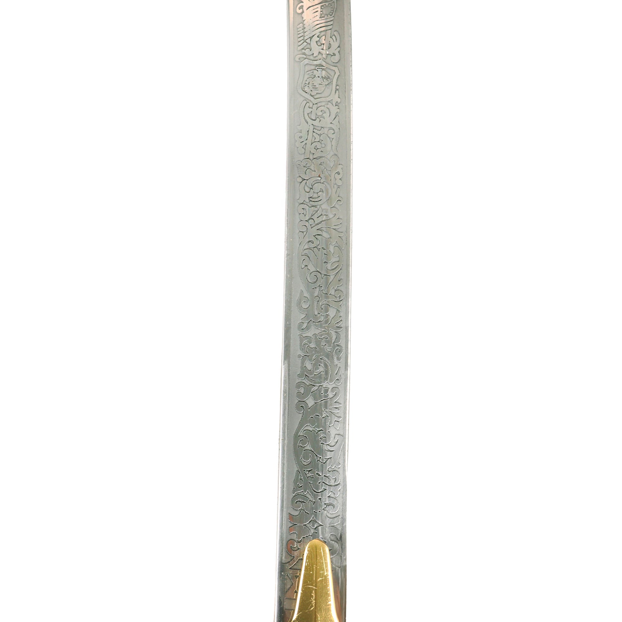 Overall condition is excellent, with just a bit of oxidation and verdigris on the brass components of the handle. Scabbard is in very good condition, with both of the original hanger rings, as well as the brass throat. There is a bit of nickel plating loss and oxidation on the steel body of the scabbard.