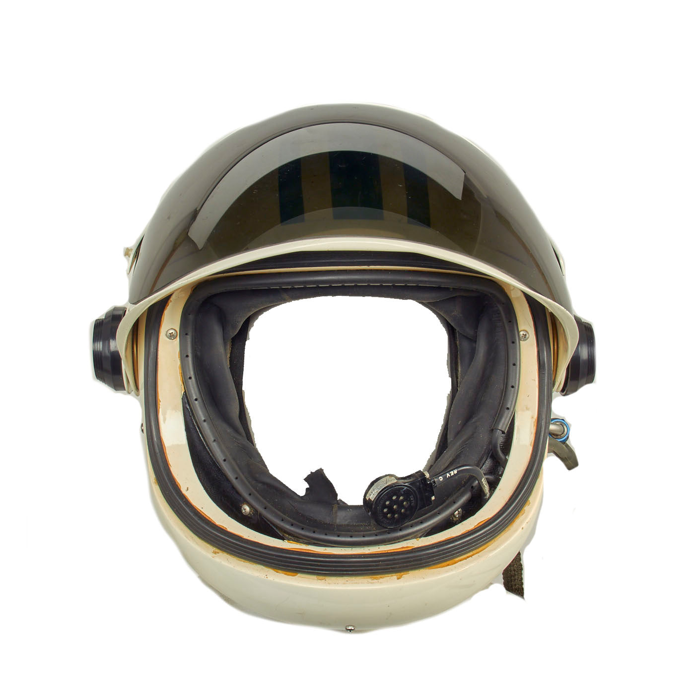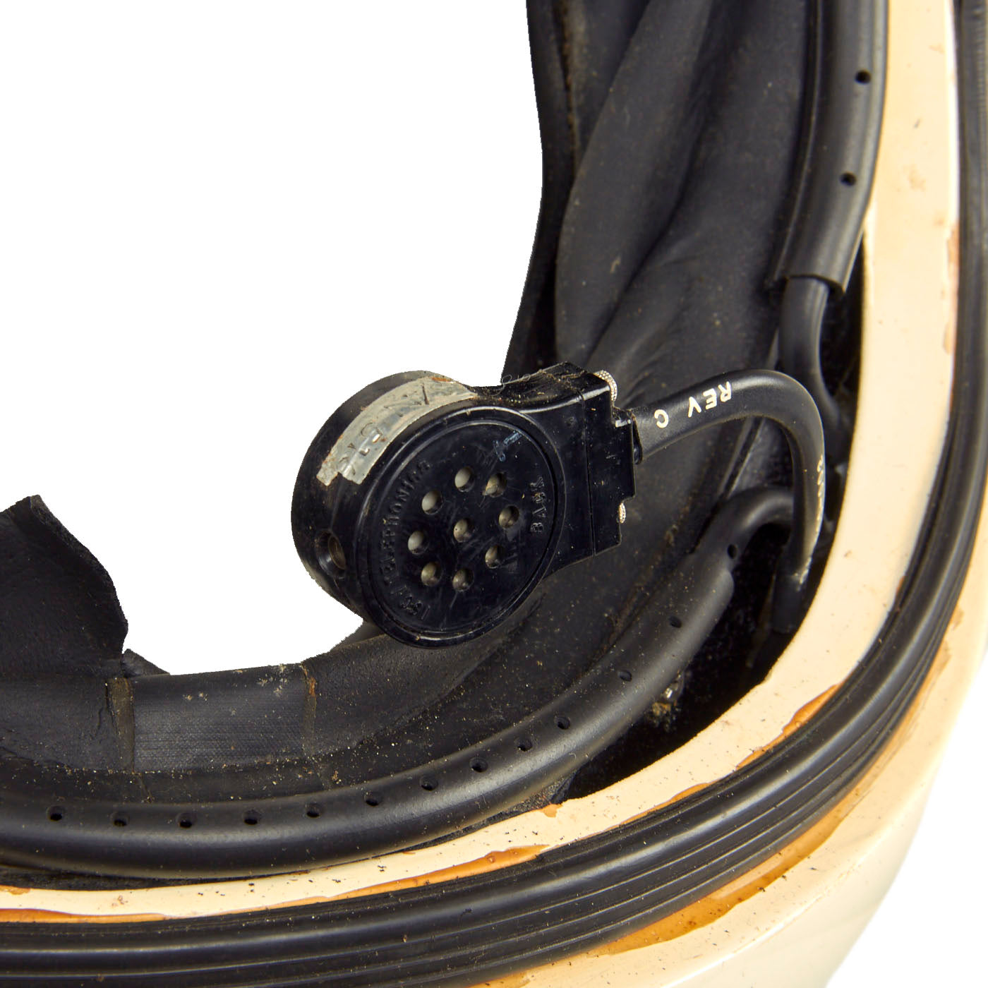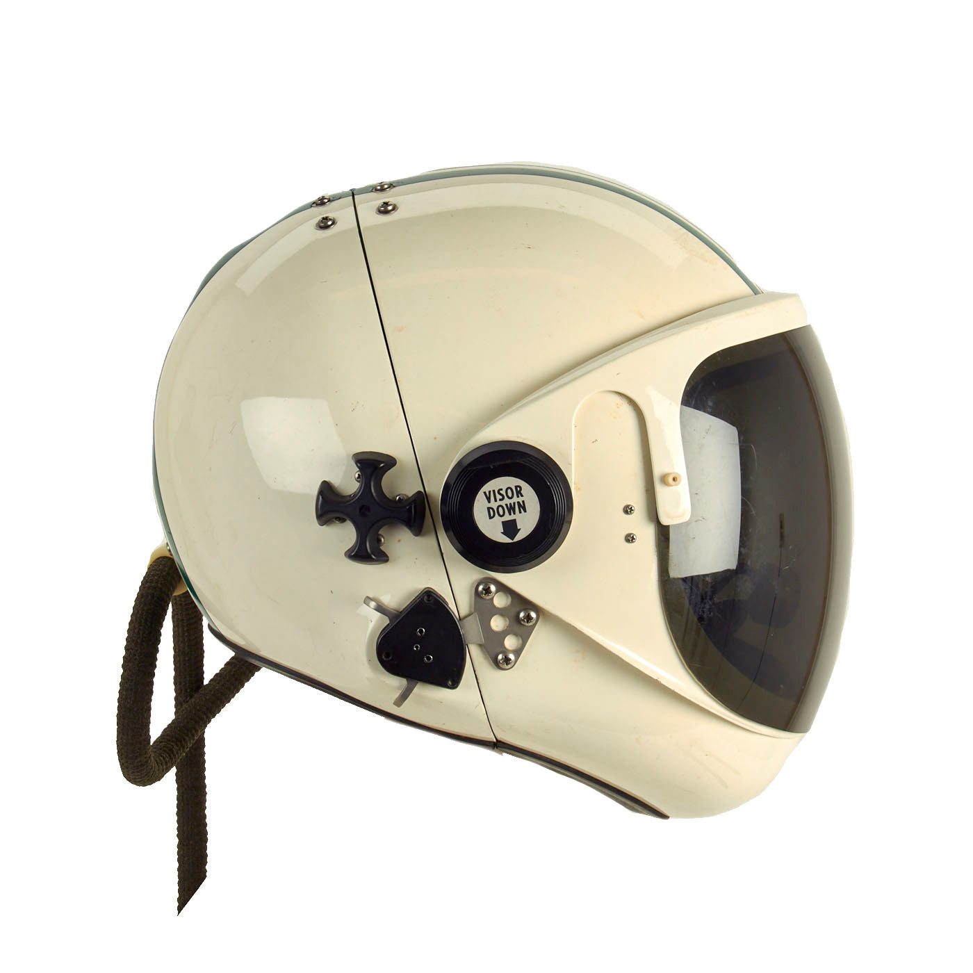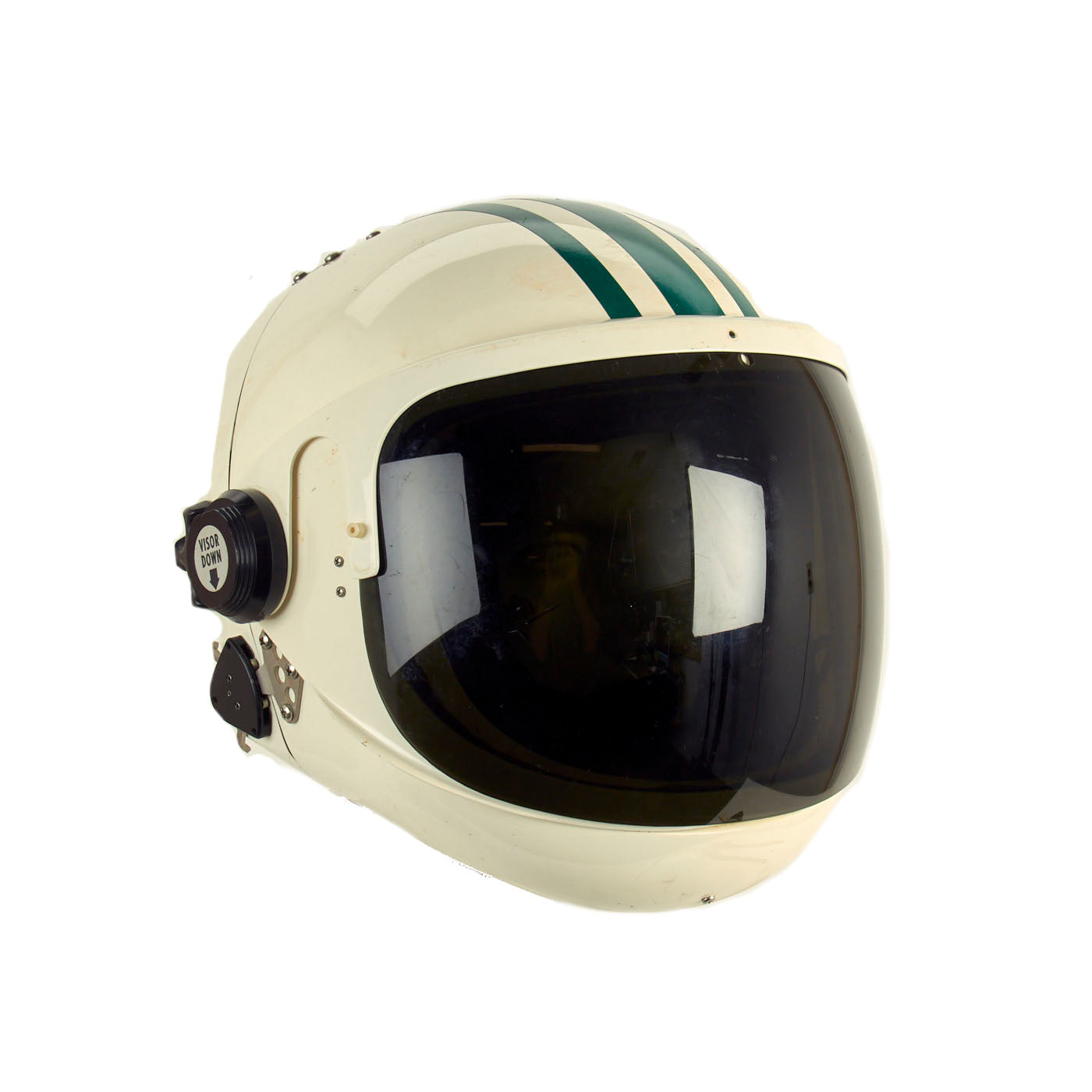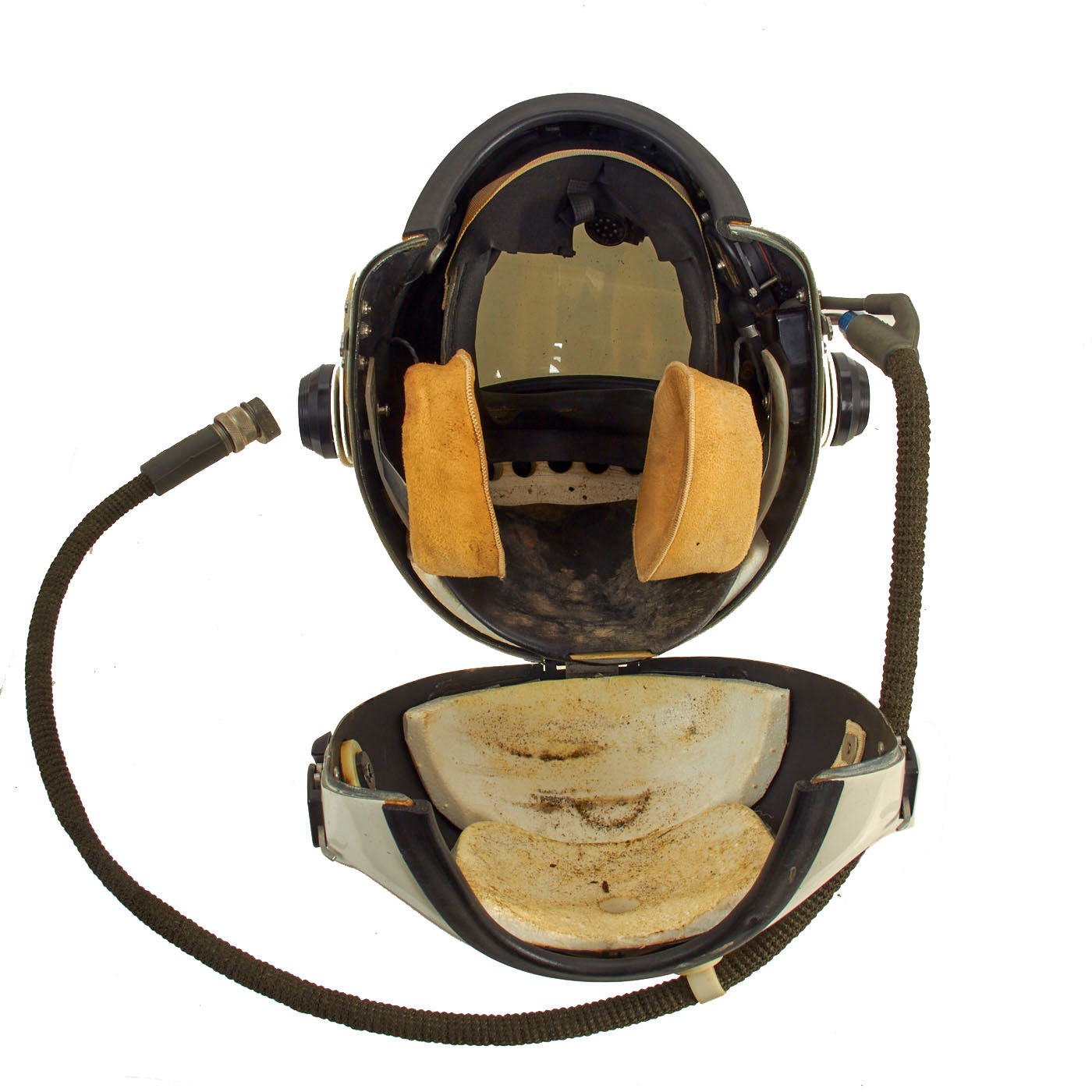The helmet is in wonderful condition and as far as we know, fully functional in the aspect of appearance. This is an extremely rare helmet, one of which a modified version was even used by NASA. The HGU-20/P Robert Shaw Controls Co. helmet differs from other protective flying helmets in that it is a closed type with a built-in oxygen system. It was intended to eliminate the need for an oxygen mask and to provide improved helmet retention under windblast. The helmet entered fleet testing in 1965 and was popular with attack squadron aircrews. However, it was withdrawn from service in 1971 because it restricted the pilot's vision in combat.