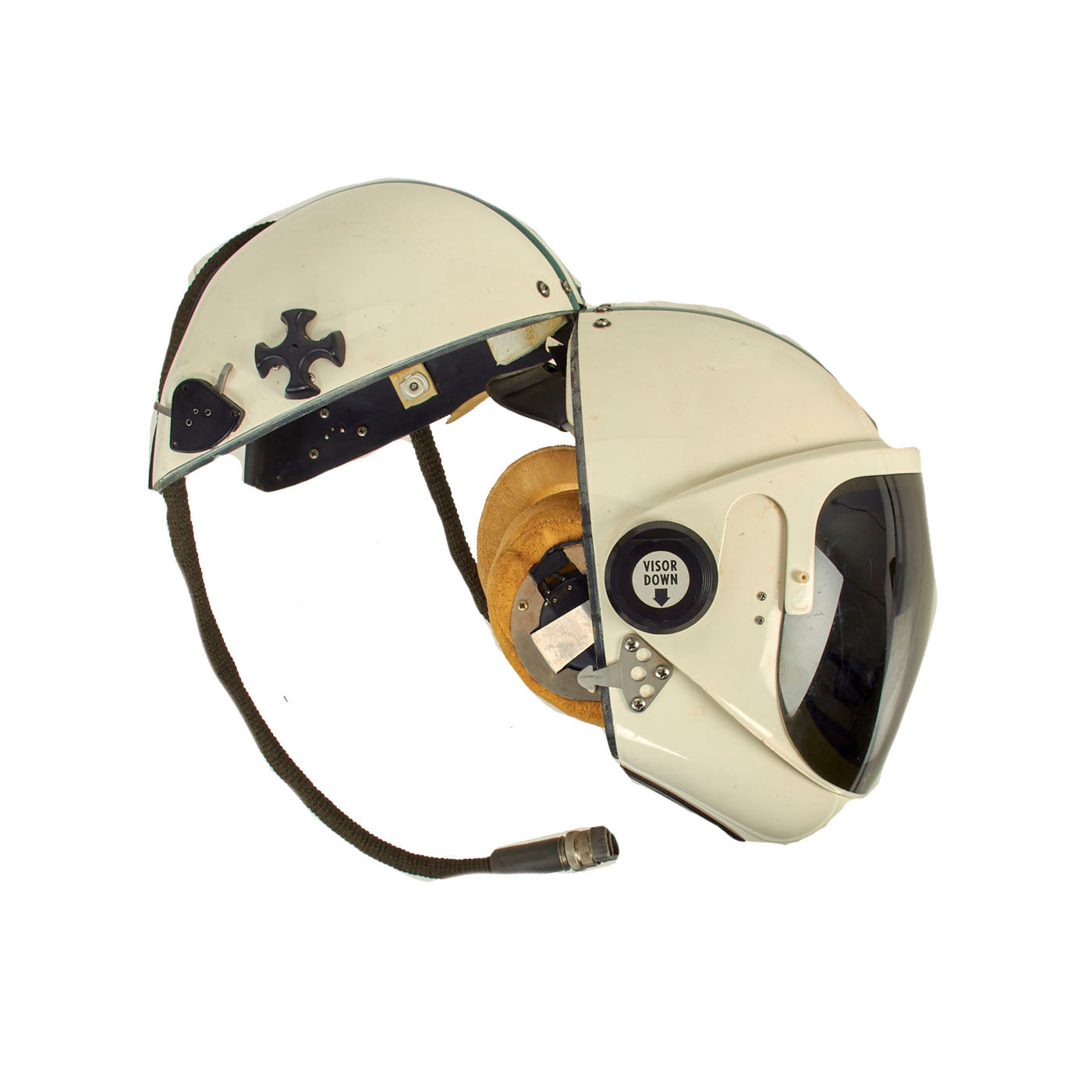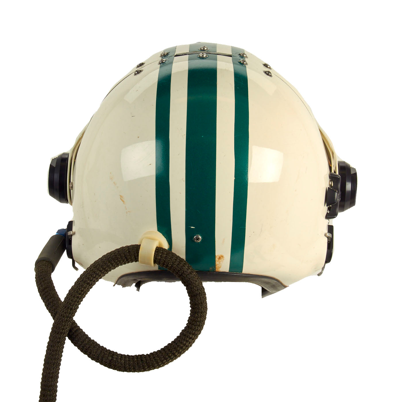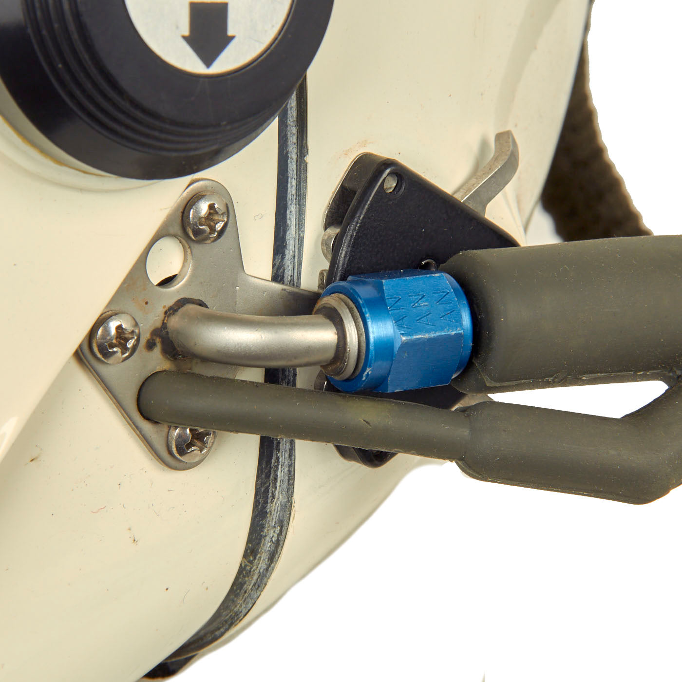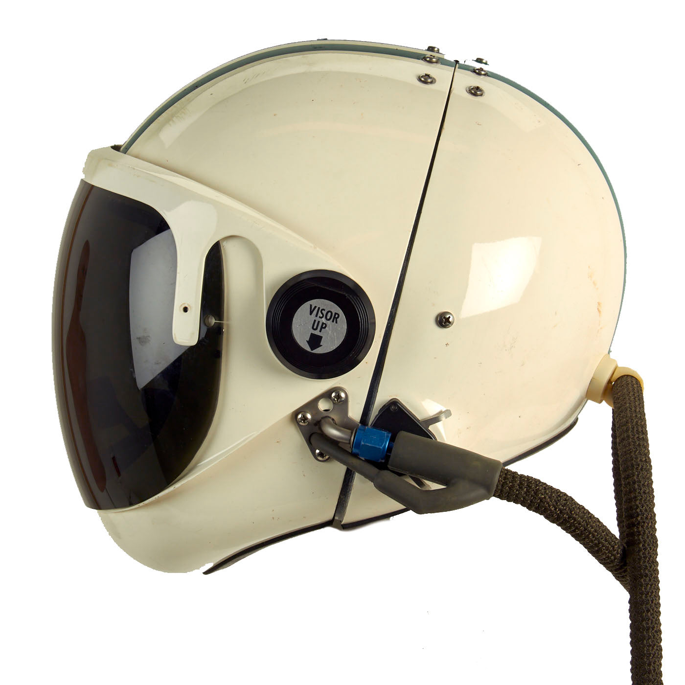 Original Item: Only One Available. Now this is an incredible helmet and piece of history! The United States Navy Type HGU-20/P Protective Flying Helmet is a "clam shell" hinge designed helmet. It features a white plastic outer shell with flip up clear plastic visor and smoked sun visor, black plastic liner adjustment knob on right side, visor knob on each side, helmet latch on each side, internal microphone, sage green nylon covered oxygen hose, green and white striped reflective tape on helmet. There is evidence of a US Navy decal on the front of the helmet, but it was removed and only left the residue.