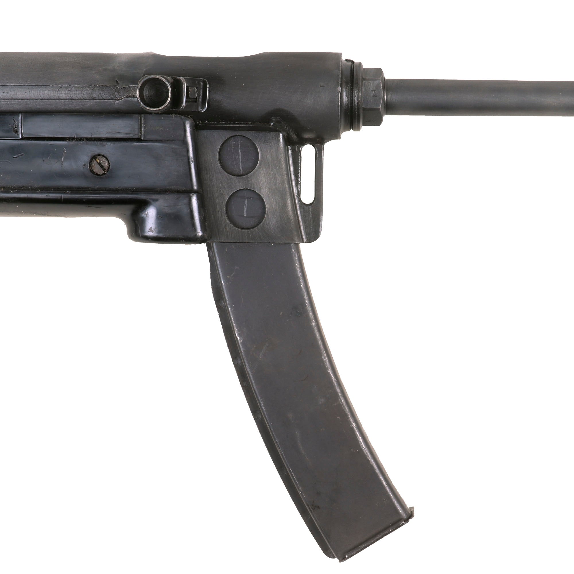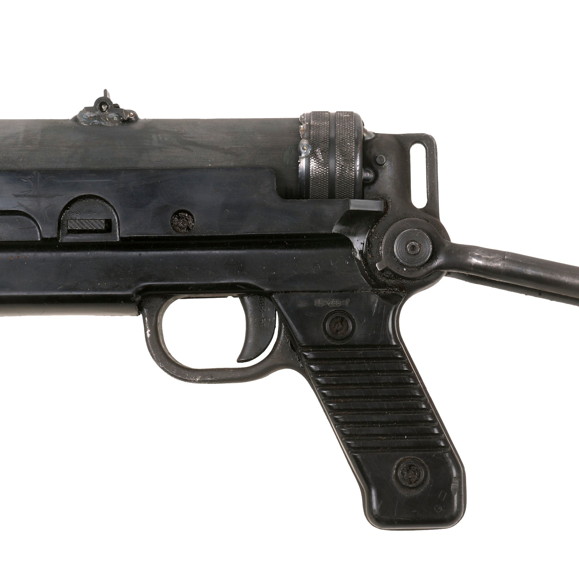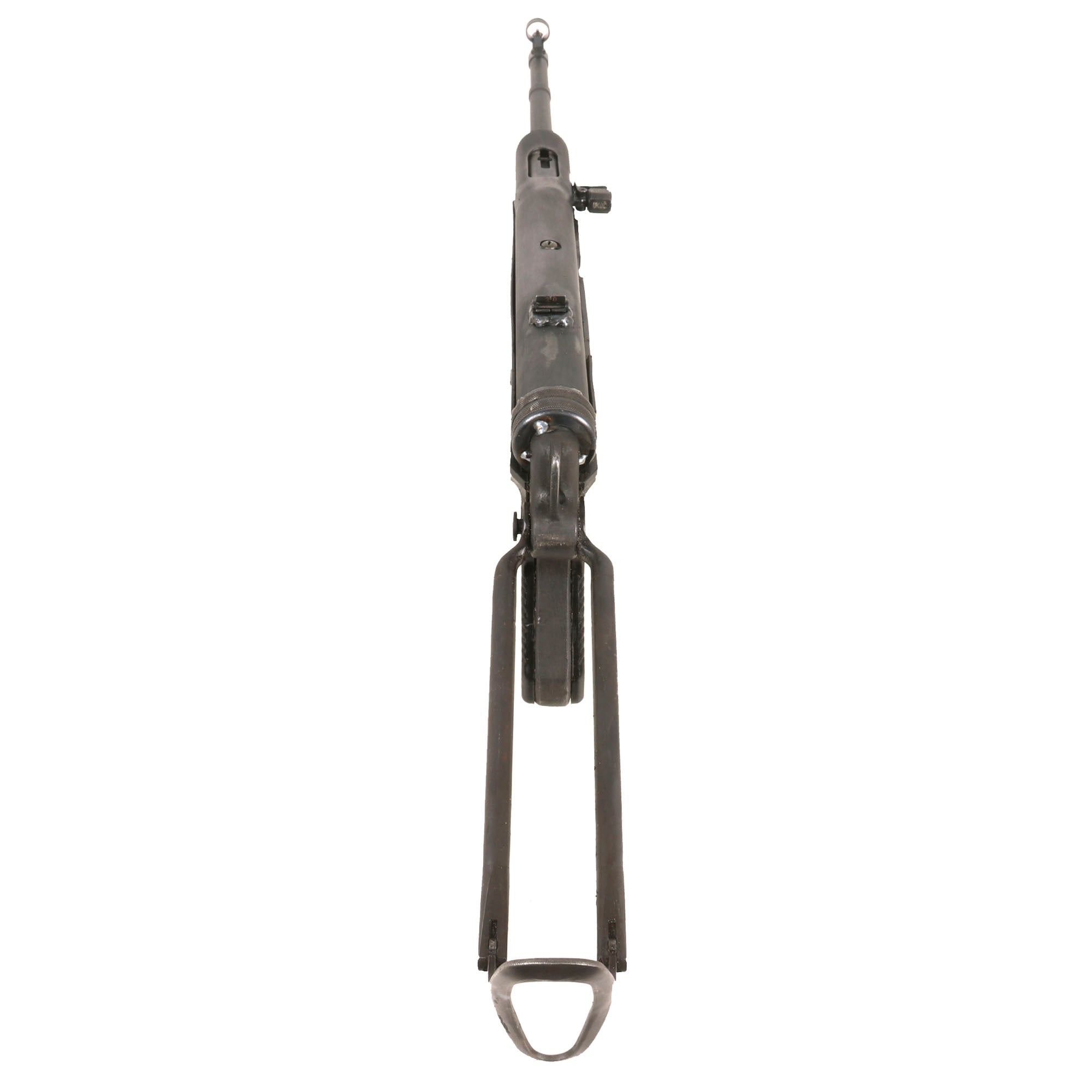 Offered with exceptional original black bakelite or plastic stock and grips, this is the real thing that will only appreciate in value over time. The extending butt stock is present and fully functional, and the trigger still pulls. The barrel is original and does not appear to have been deactivated in any way, however we cannot see the chamber due to the bolt being in the way. Original markings are present, on various components, though there is no serial number that we can see. Included is an original magazine and will have the spring and follower removed if shipped to a state that prohibits high capacity magazines.