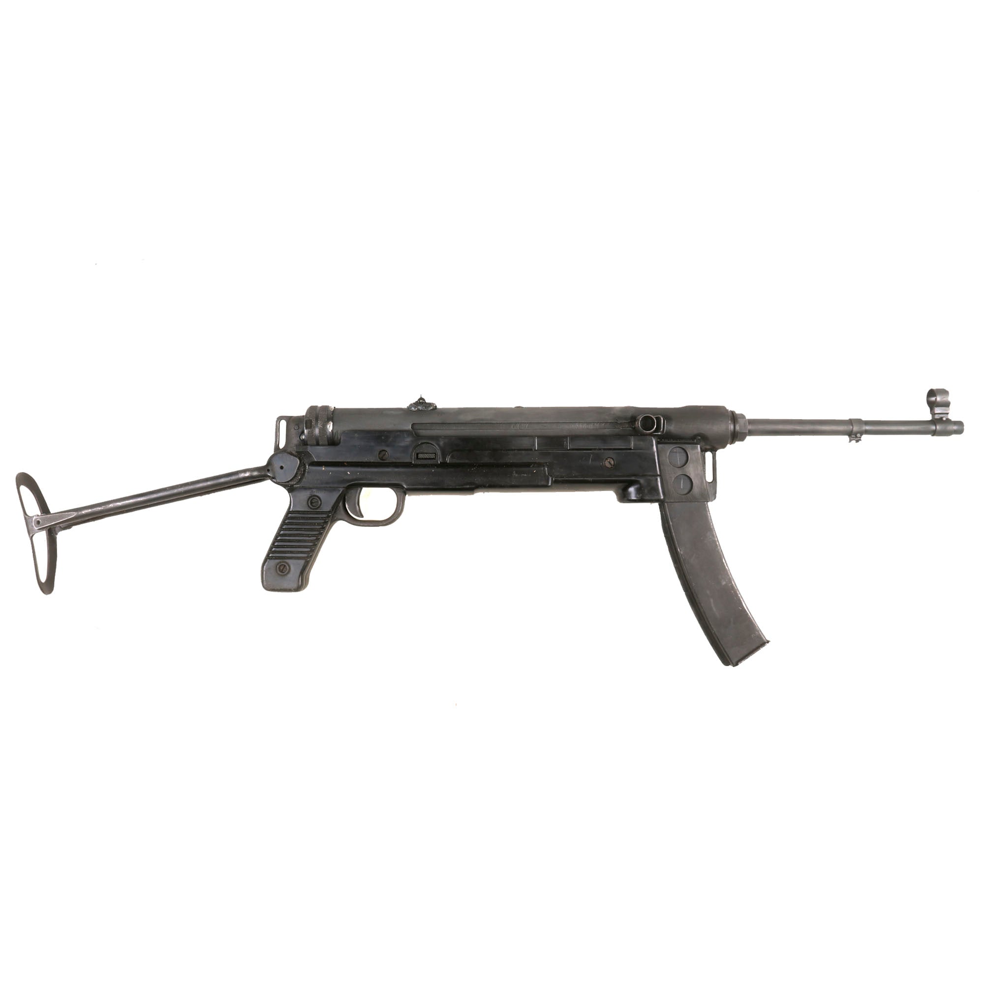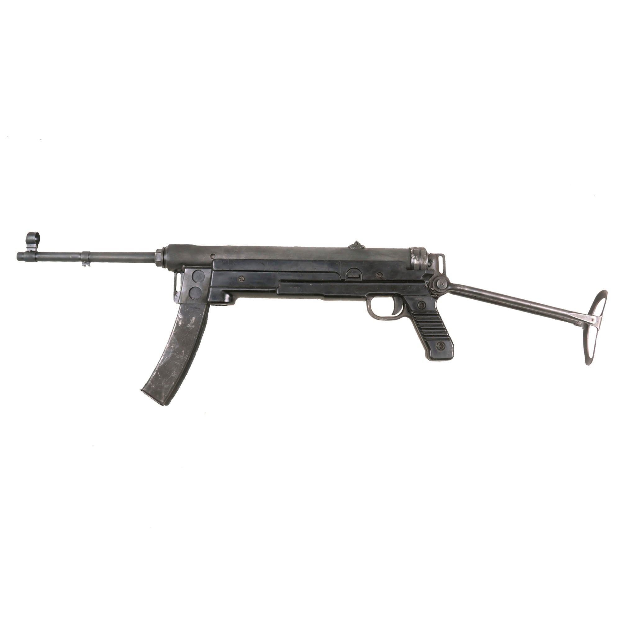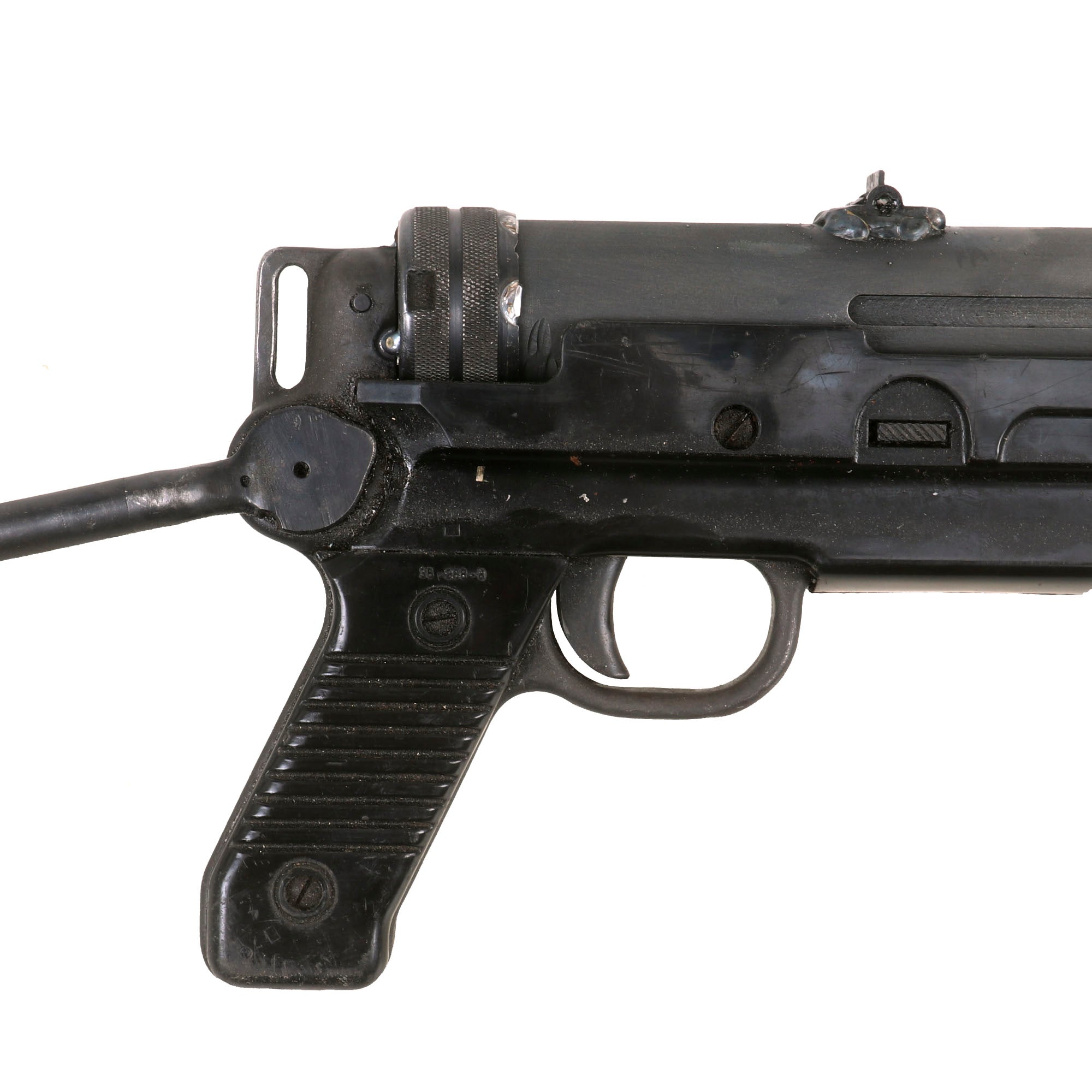Offered with exceptional original black bakelite or plastic stock and grips, this is the real thing that will only appreciate in value over time. The extending butt stock is present and fully functional, and the trigger still pulls. The barrel is original and does not appear to have been deactivated in any way, however we cannot see the chamber due to the bolt being in the way. Original markings are present, on various components, though there is no serial number that we can see. Included is an original magazine and will have the spring and follower removed if shipped to a state that prohibits high capacity magazines.