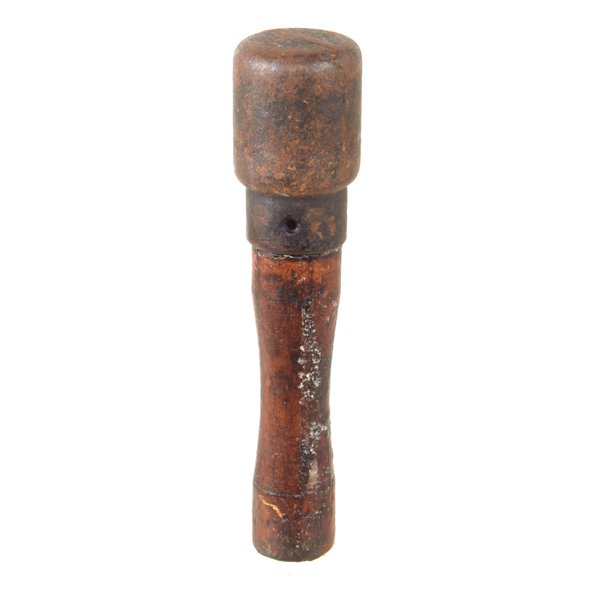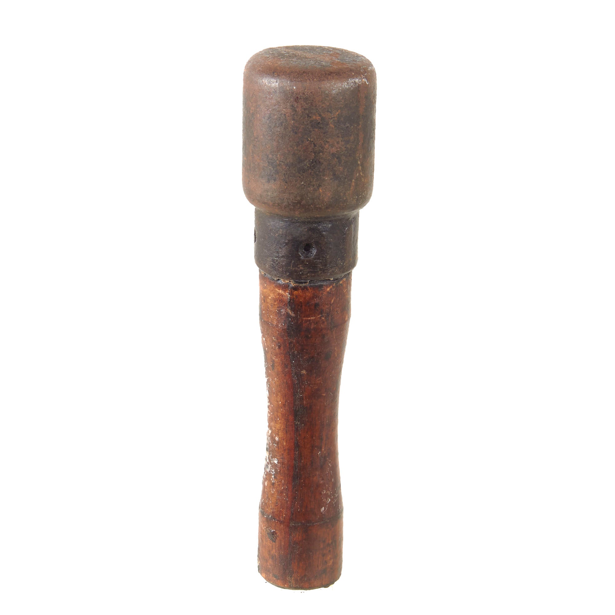 The grenade is a very nice example and was most certainly brought home by an American at the close of the Vietnam War. The end of the shaft still has the pull string with a small copper wire attached. The head is oxidized and has four empty holes for nails to secure the head. The grenade measures 8 ¼” overall.