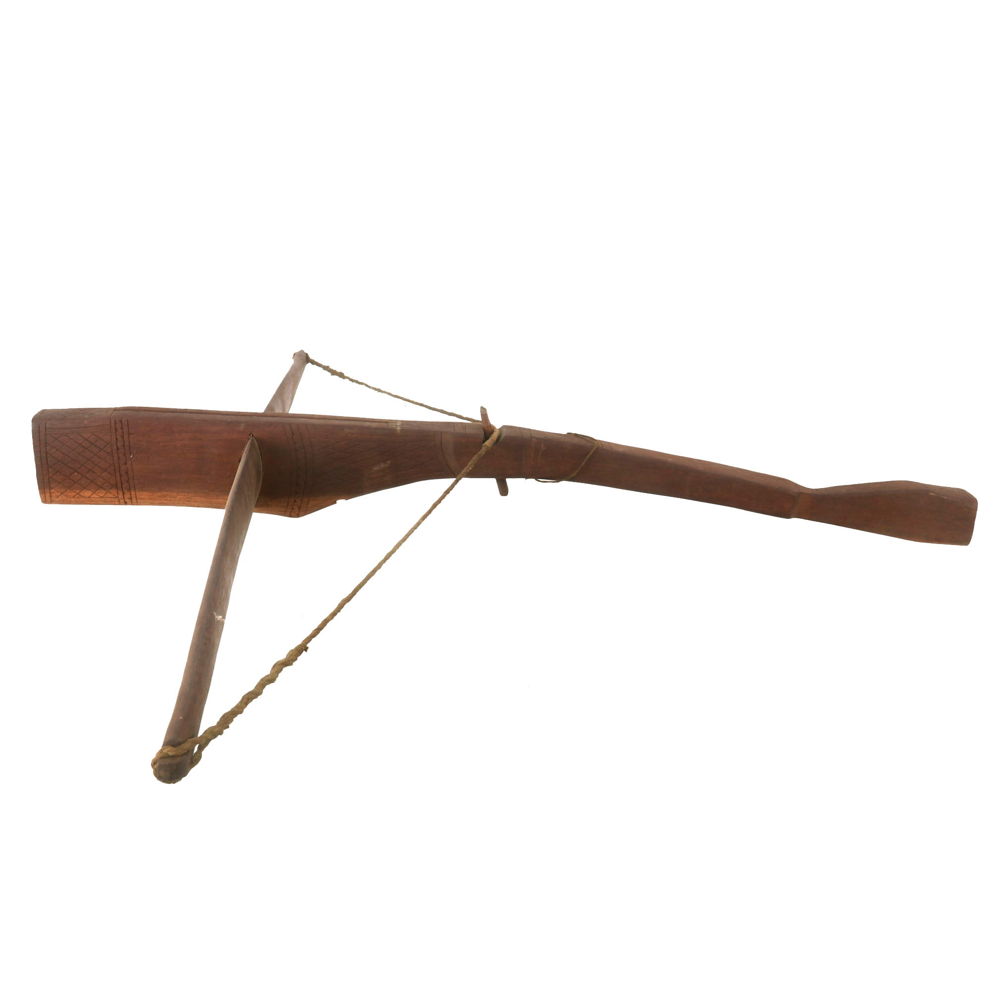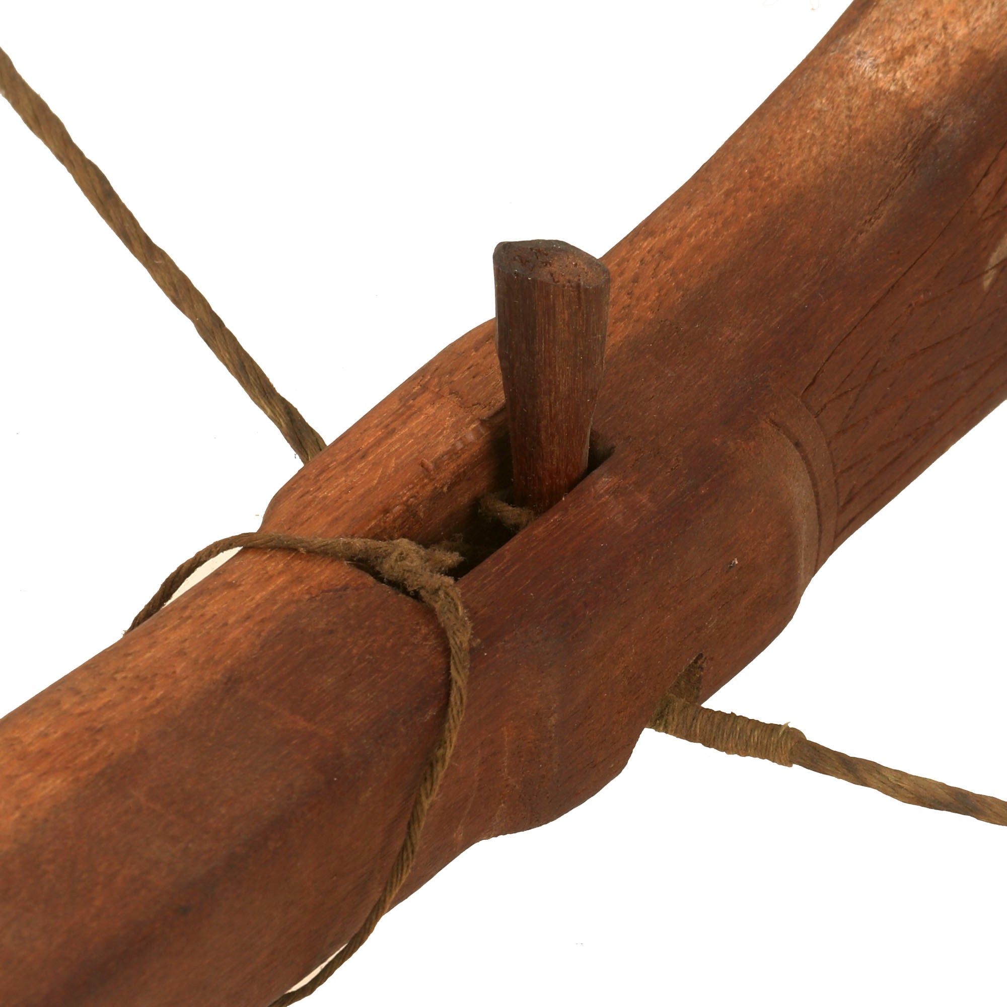 Original Items: Only One Available. Genuine USGI bring Back from the Vietnam War. This hardwood crossbow was the weapon of choice for the indigenous Montagnards. Features original lathe, with no damage or repairs. The trigger mechanism is a bit worn and could use some work. Overall an excellent wartime example brought back by a Green Beret after his service in Vietnam. The bow measures 32 inches and the body measures 25 inches long, making a fantastic display. Also included are 2 small quivers with seven bolts total, some with their wings and some without.