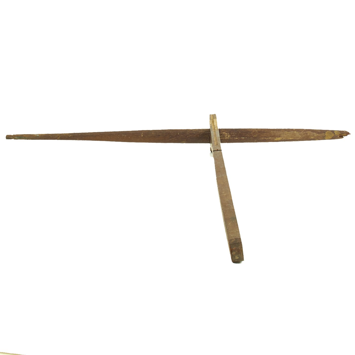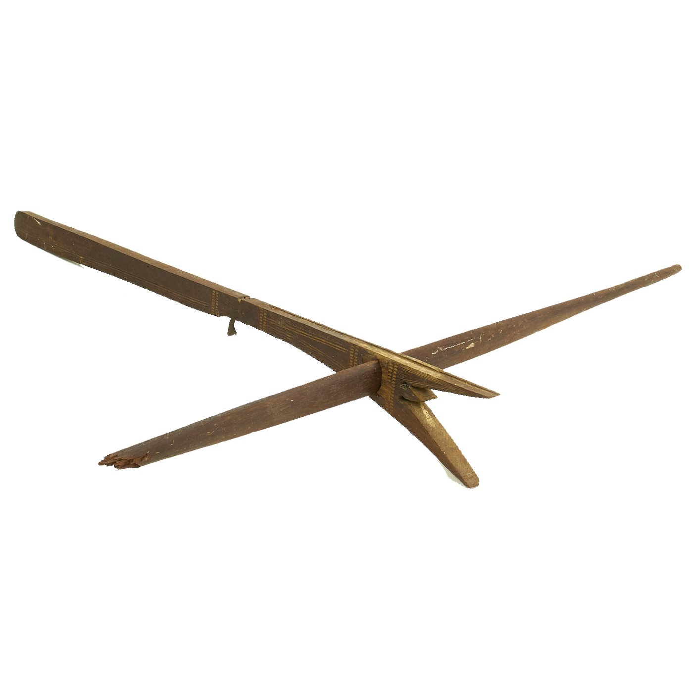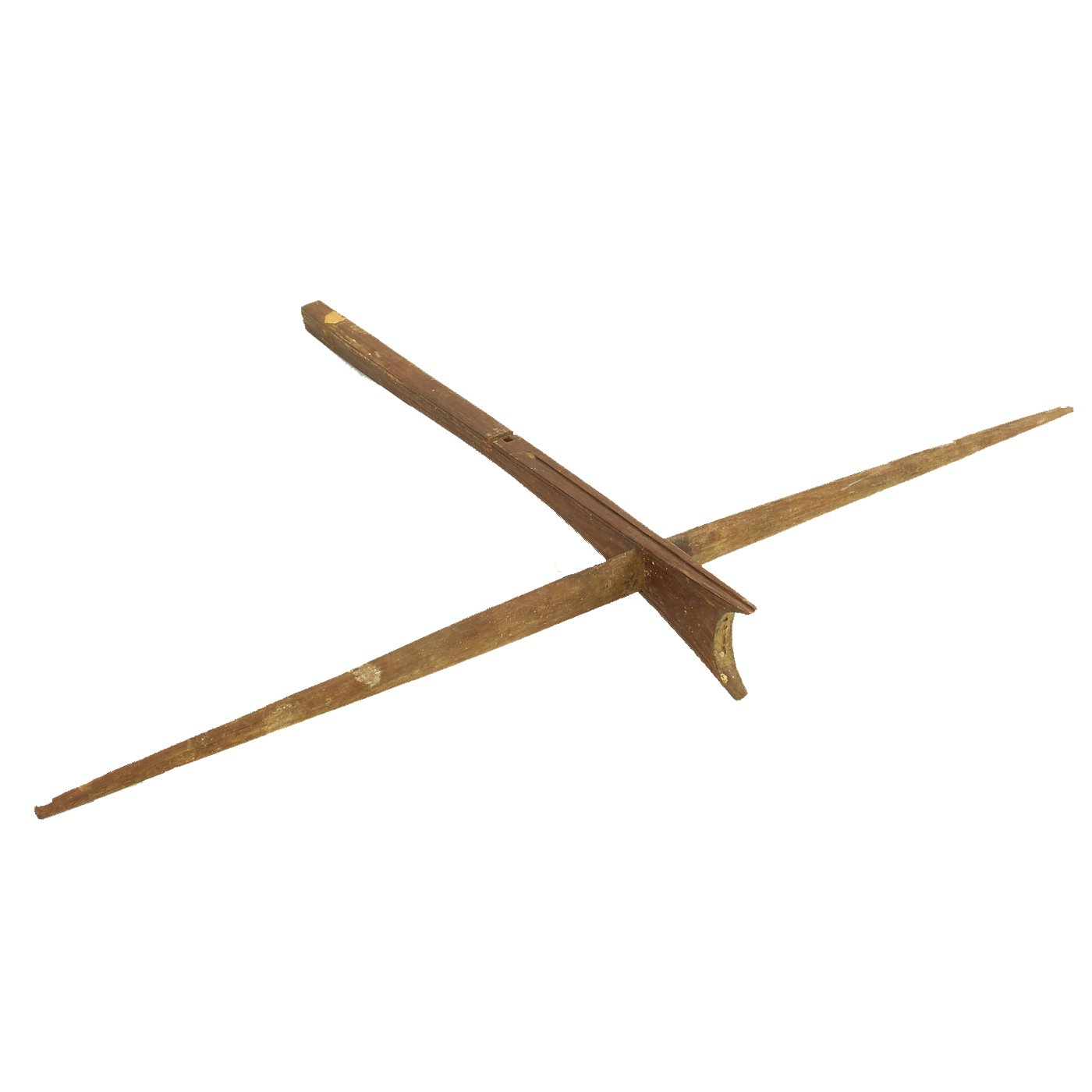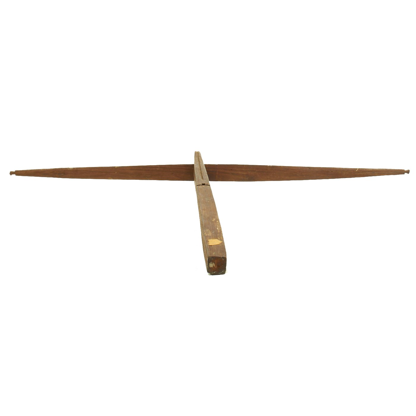 Both of the crossbows are incomplete, made up of just the lathe (cross piece) and stock, with one still having a partial trigger mechanism. One has a 36 1/2" lathe with a 28 1/2" stock, while the second, with the partial trigger, has a 33" lathe and 32" stock. The second is narrower slightly, but it is also missing one end of the lathe, so it was most likely wider at some point. Bother are missing the bowstring, and are not functional at present, and are intended entirely for display.