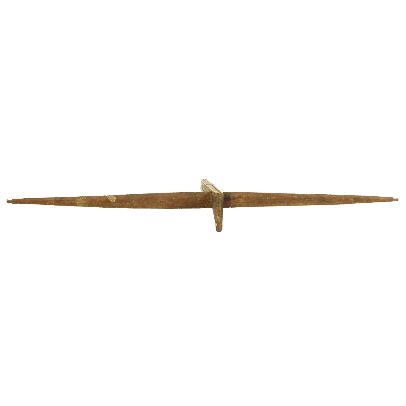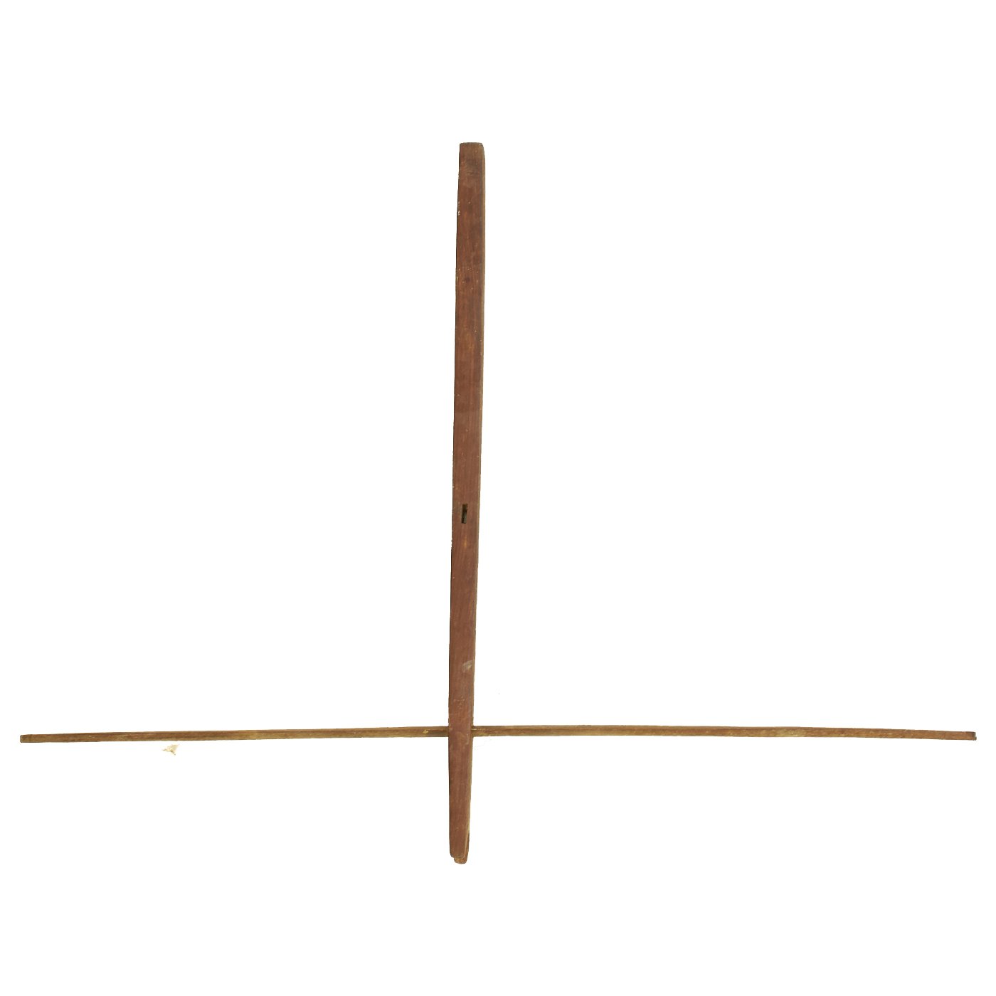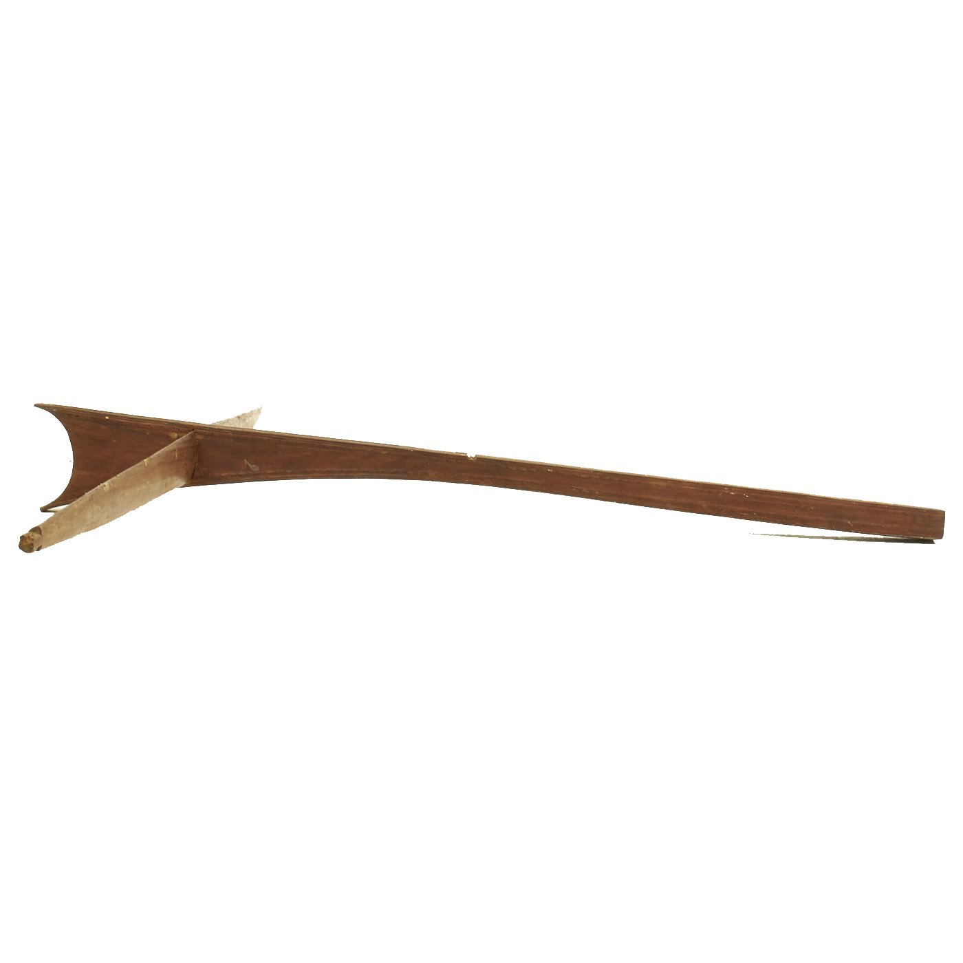 Both of the crossbows are incomplete, made up of just the lathe (cross piece) and stock, with one still having a partial trigger mechanism. One has a 36 1/2" lathe with a 28 1/2" stock, while the second, with the partial trigger, has a 33" lathe and 32" stock. The second is narrower slightly, but it is also missing one end of the lathe, so it was most likely wider at some point. Bother are missing the bowstring, and are not functional at present, and are intended entirely for display.
